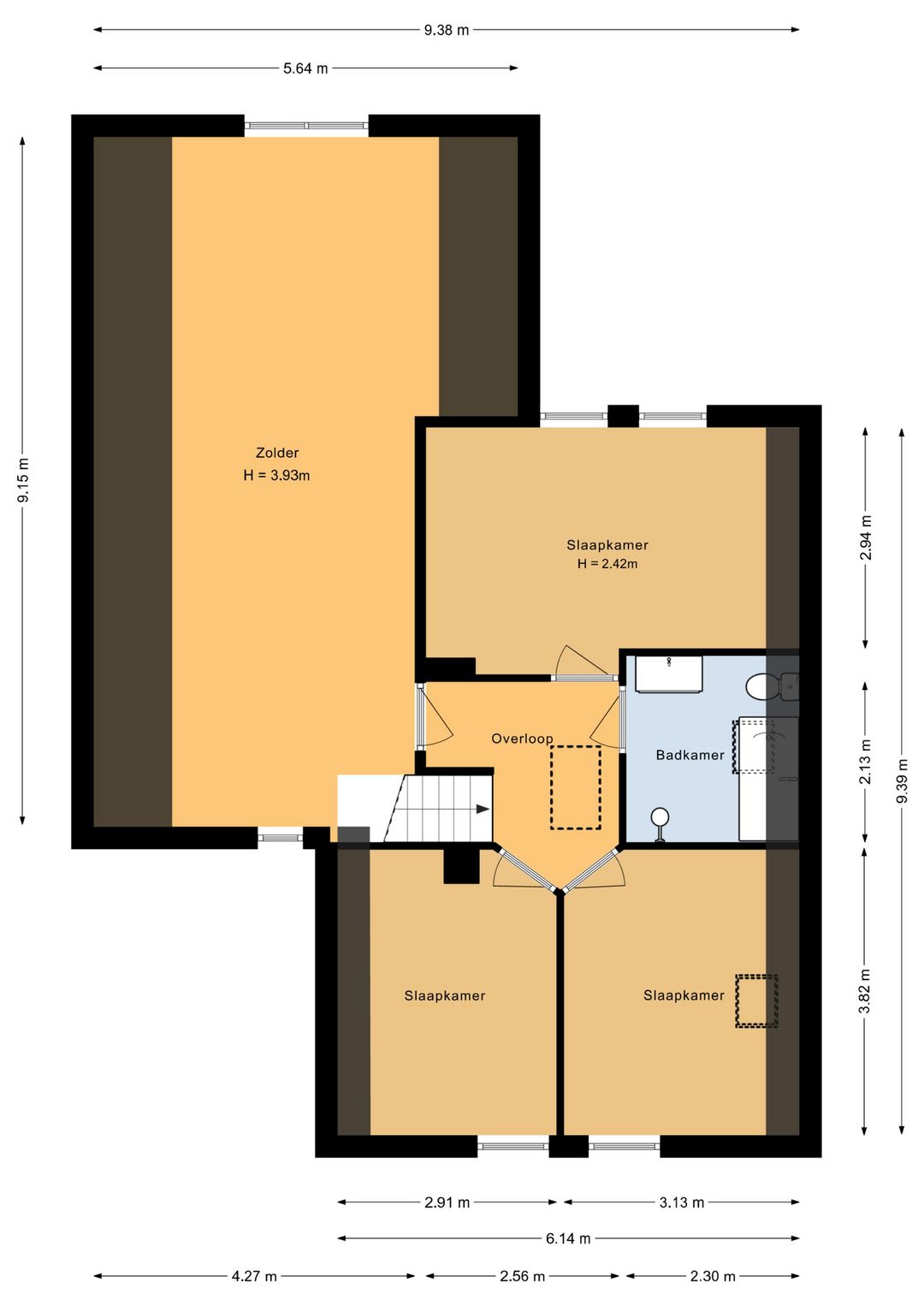 Uniek aan deze verdieping is de directe toegang tot de zolderverdieping boven de inpandige garage. Deze grote open ruimte (zolder 5,64 x 9,15 m) met een hoogte van ca. 3,93 m biedt talloze mogelijkheden, bijvoorbeeld voor het creëren van extra slaapkamers, een atelier of kantoor aan huis.