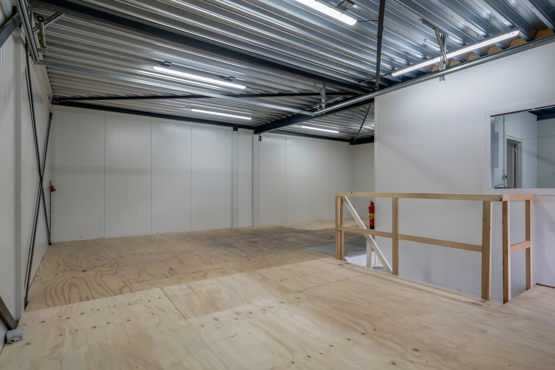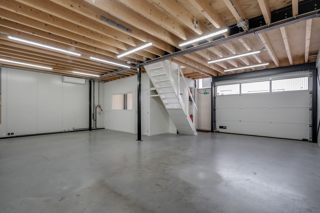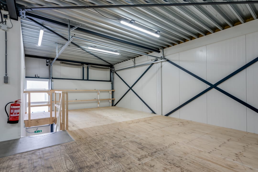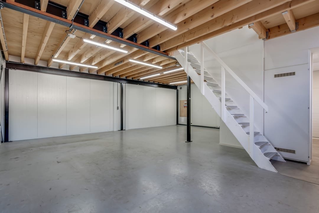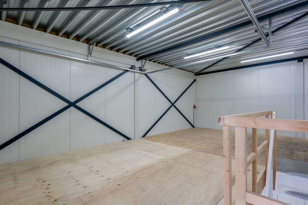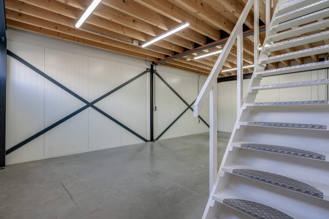 De aanwezige verdiepingsvloer zorgt voor extra ruimte, bijvoorbeeld voor opslag of aanvullende werkplekken.