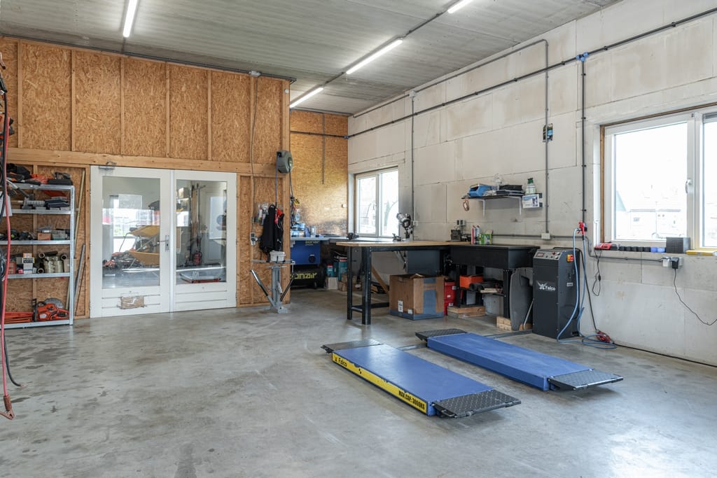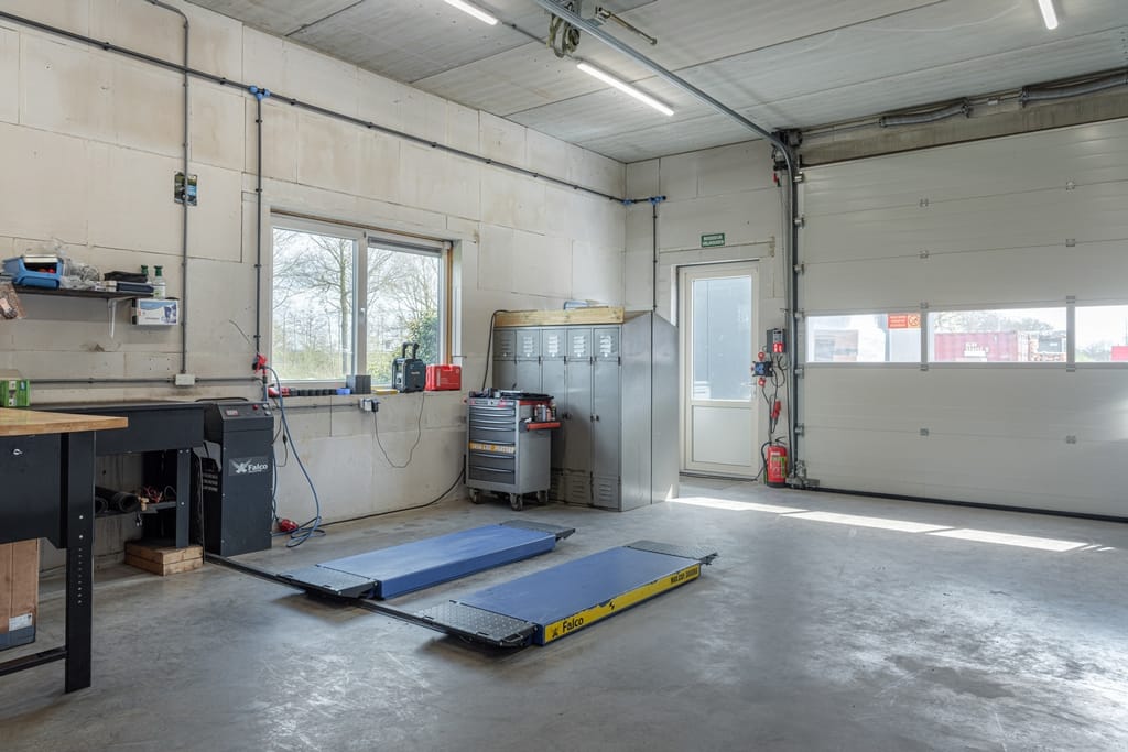 Voorentree ten behoeve van de showroom en de werkplaats is v.v. een elektronisch bedienbare overheaddeur en loopdeur.