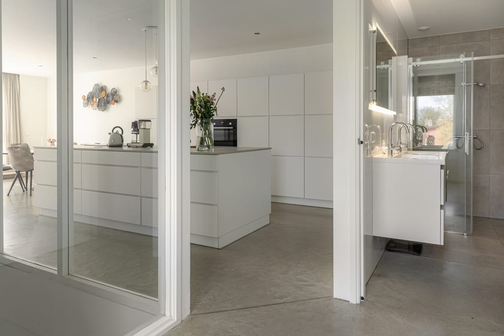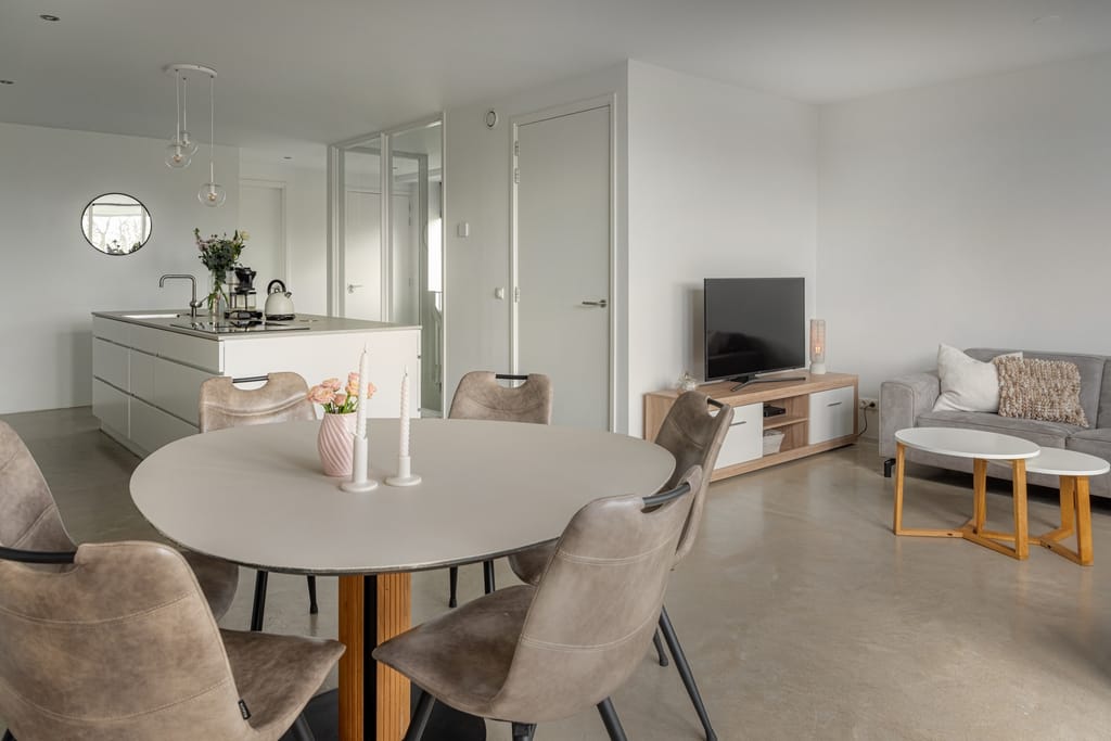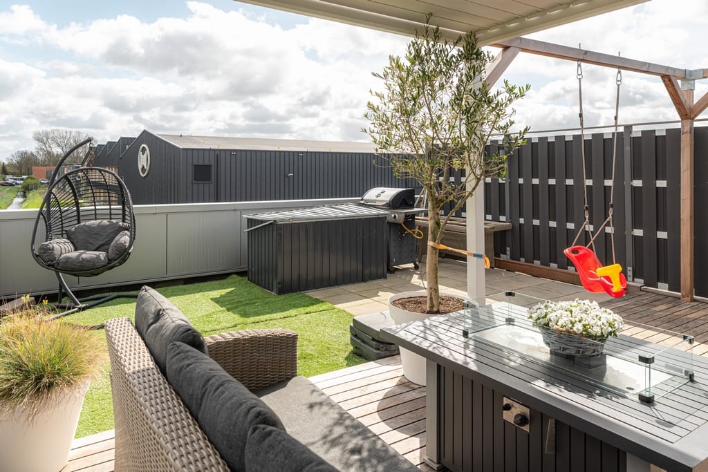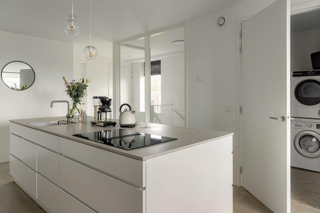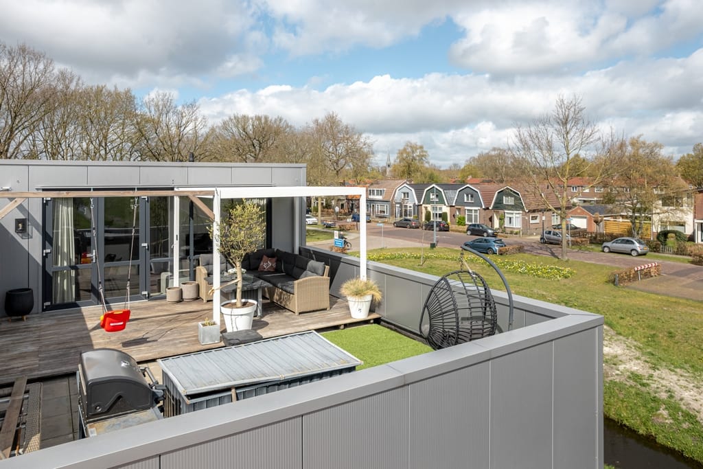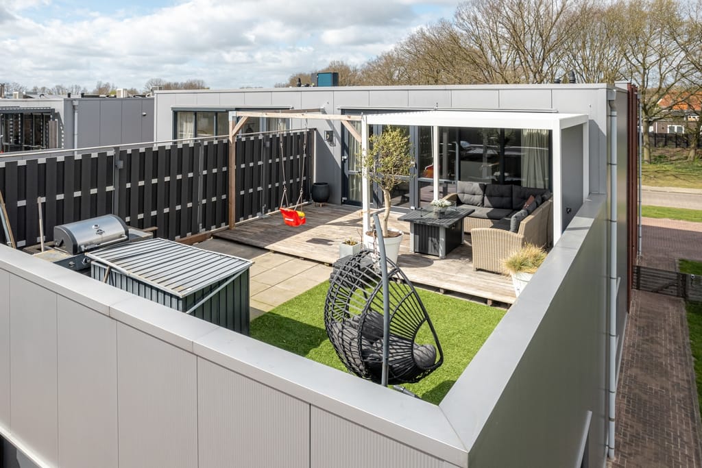 Hal met vide, toiletruimte, open keuken v.v. een fraai kook-/werkeiland en keukenwand en woonkamer met tuindeuren naar het ruime dakterras, twee slaapkamers, badkamer v.v. inloopdouche en dubbele wastafel. Het dakterras is maar liefst 45 m² en beschikt over een terrasoverkapping.