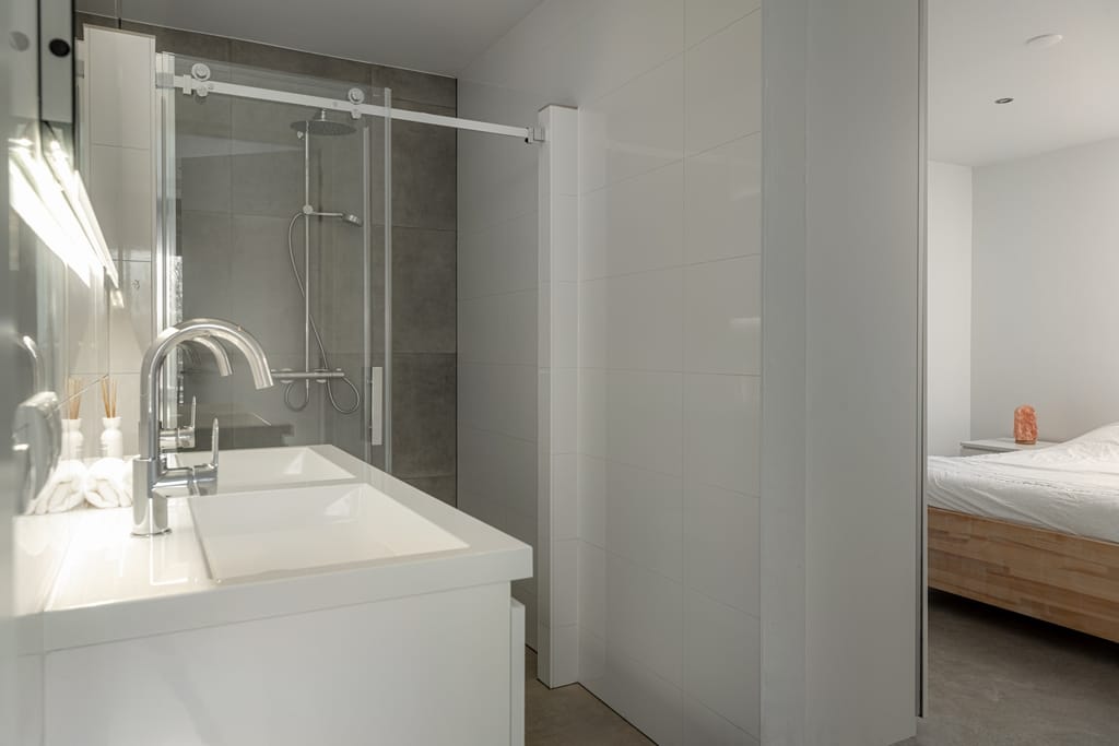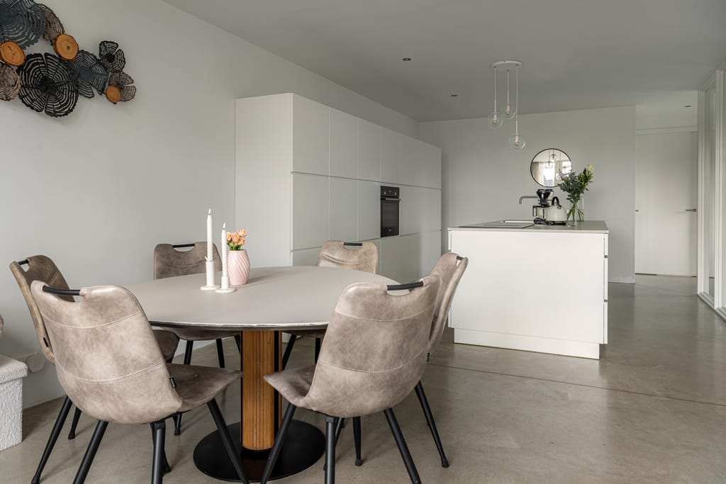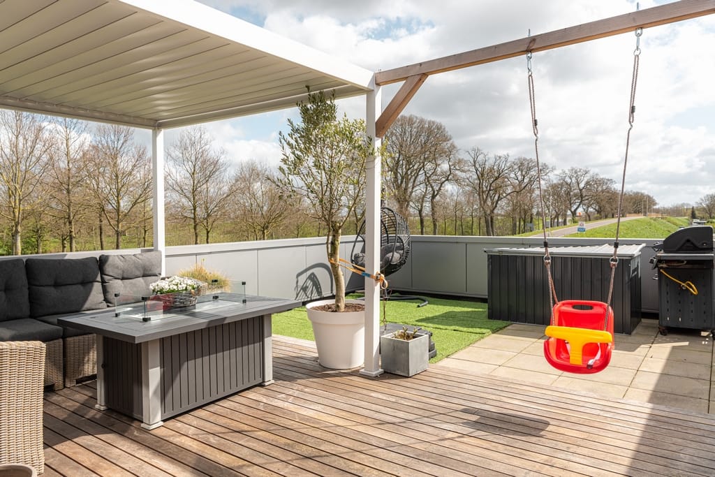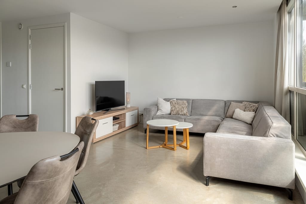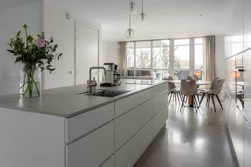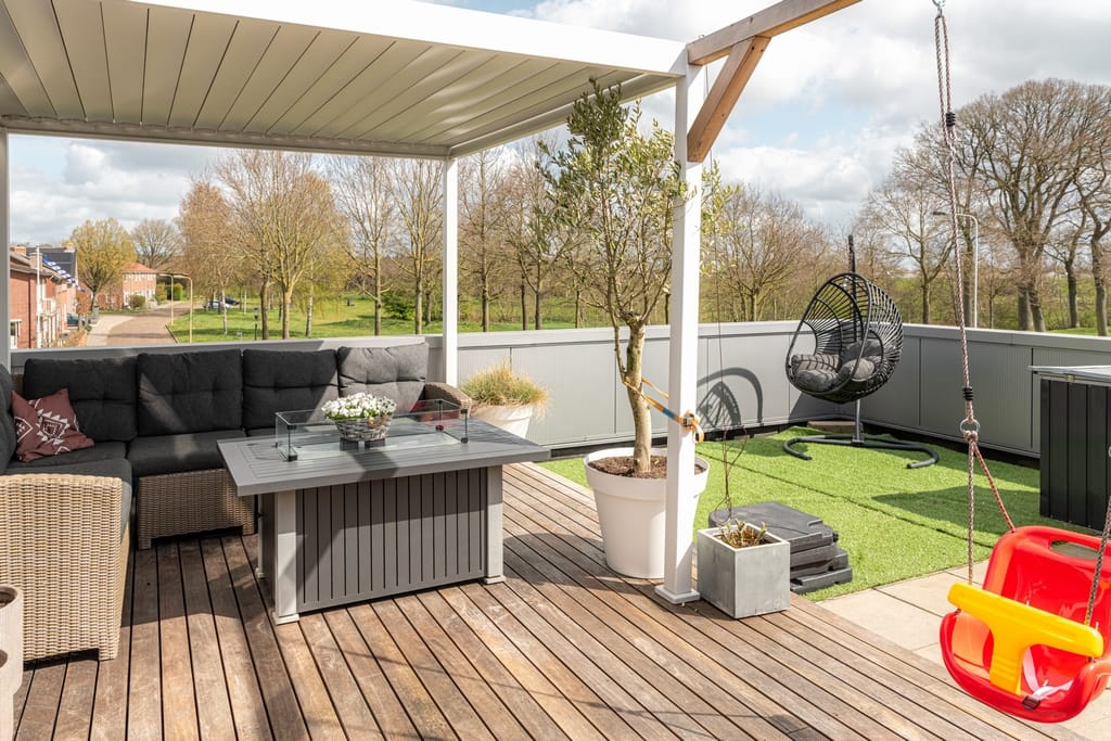 Hal met vide, toiletruimte, open keuken v.v. een fraai kook-/werkeiland en keukenwand en woonkamer met tuindeuren naar het ruime dakterras, twee slaapkamers, badkamer v.v. inloopdouche en dubbele wastafel. Het dakterras is maar liefst 45 m² en beschikt over een terrasoverkapping.