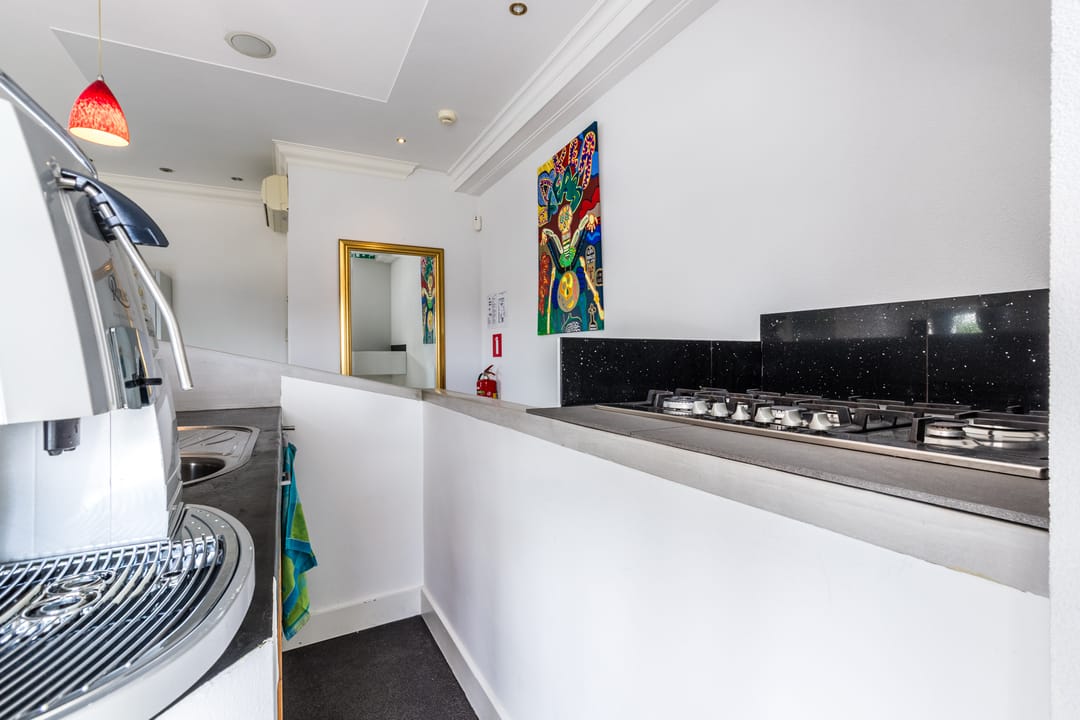 o Kantoor-/showroomruimte met keuken voorzien van gaskookplaat, vaatwasser, koelkast en oven (semi-inbouw)