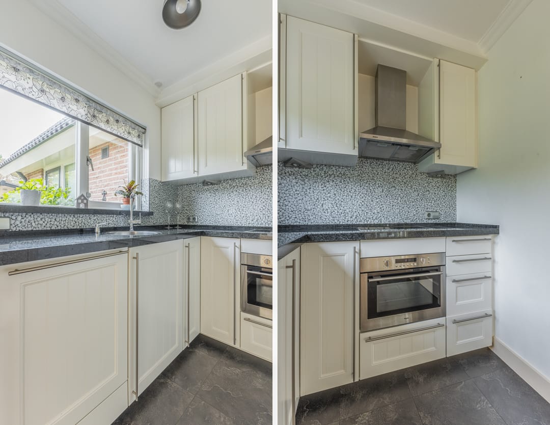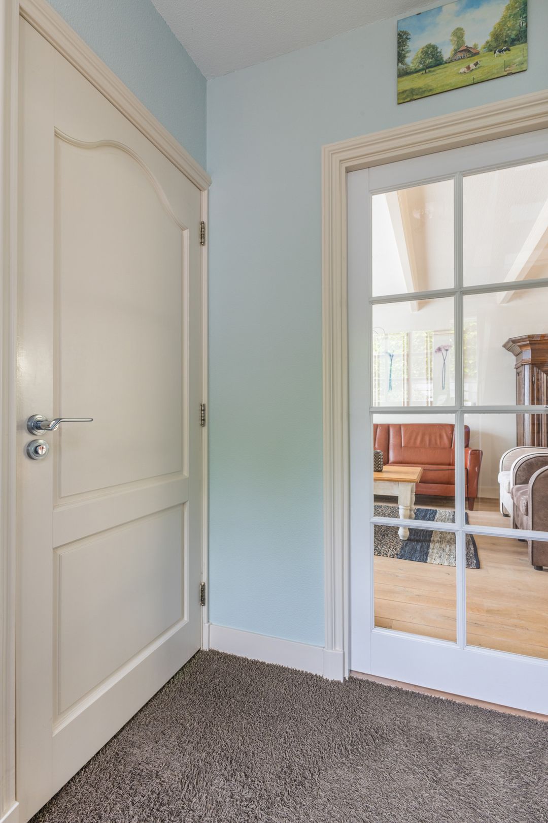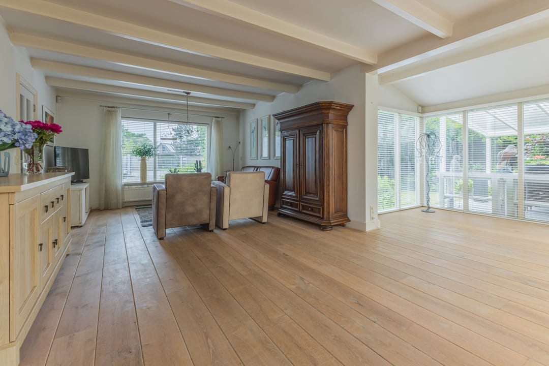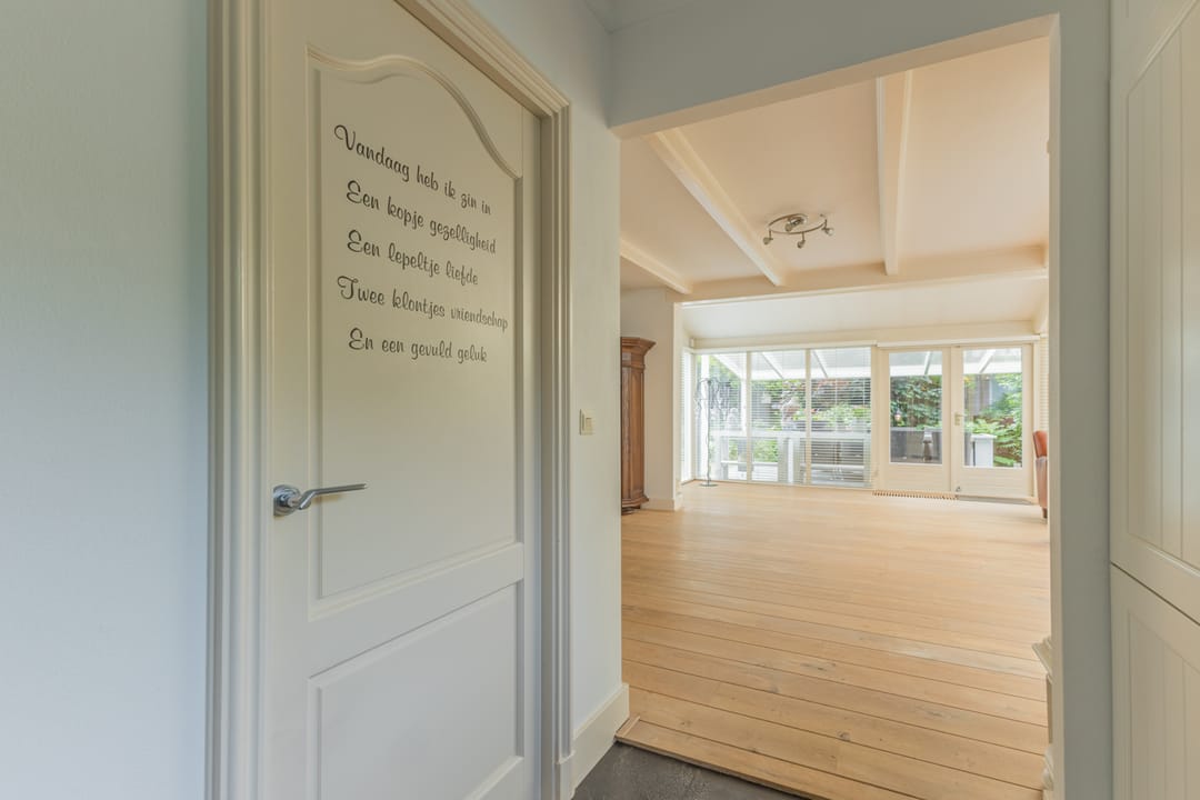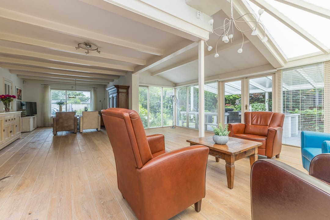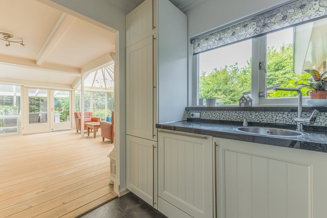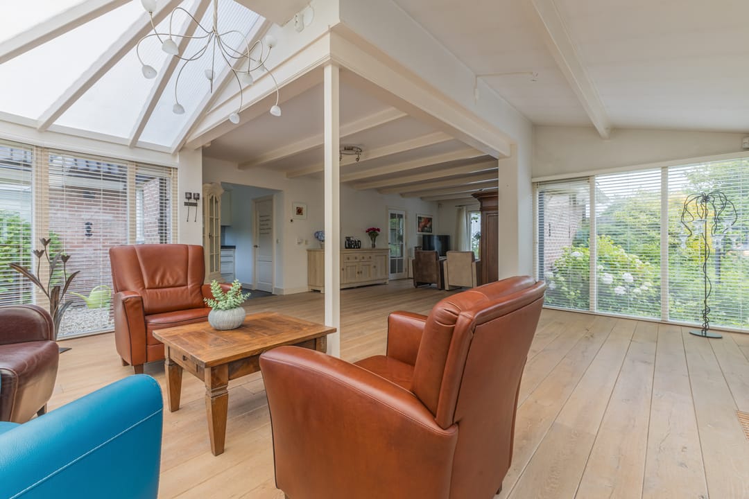 Zij-entree met royale hal, trap, meterkast, luxe toiletruimte en luxe badkamer, woonkamer welke uitgebreid met serre. Openslaande tuindeuren naar terrasoverkapping. Moderne keuken met bijkeuken en stookruimte.