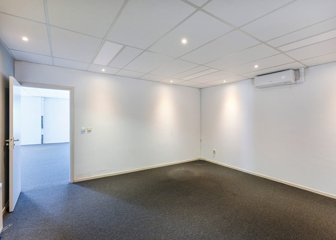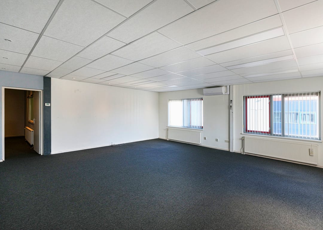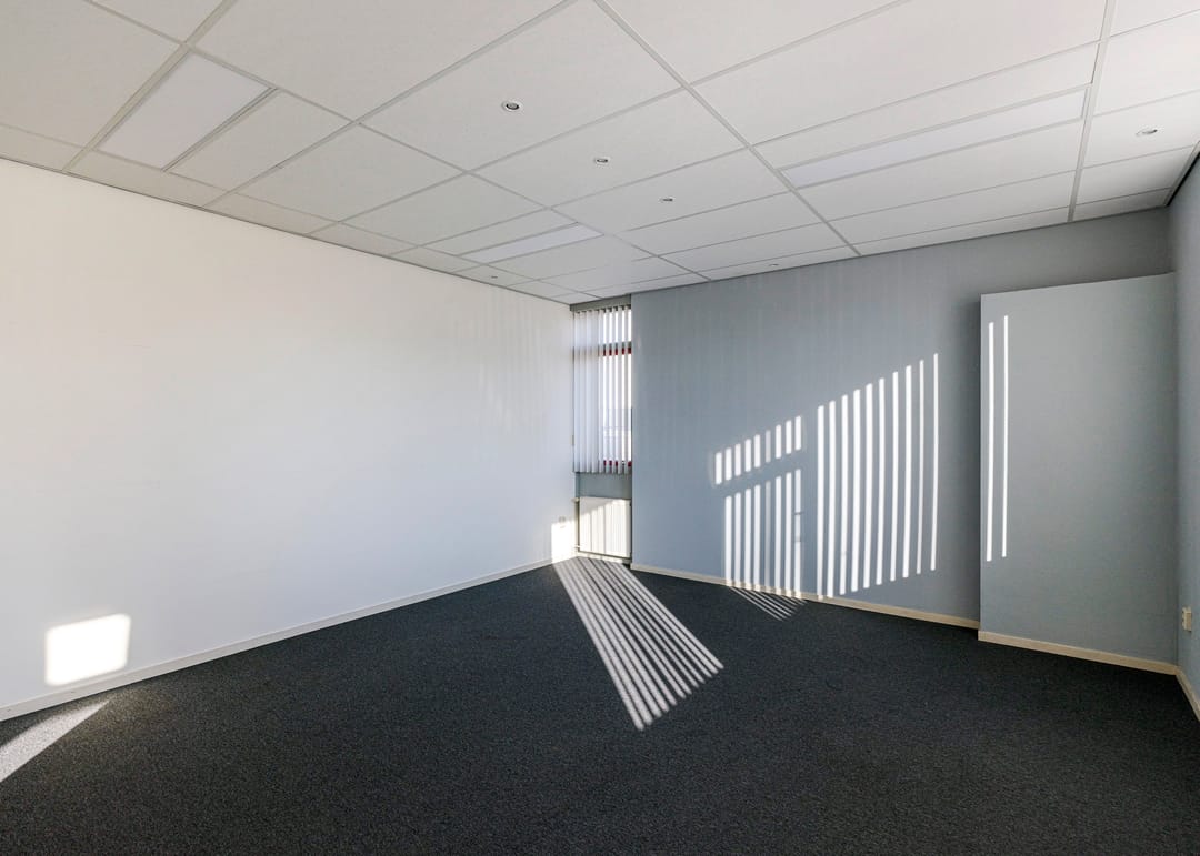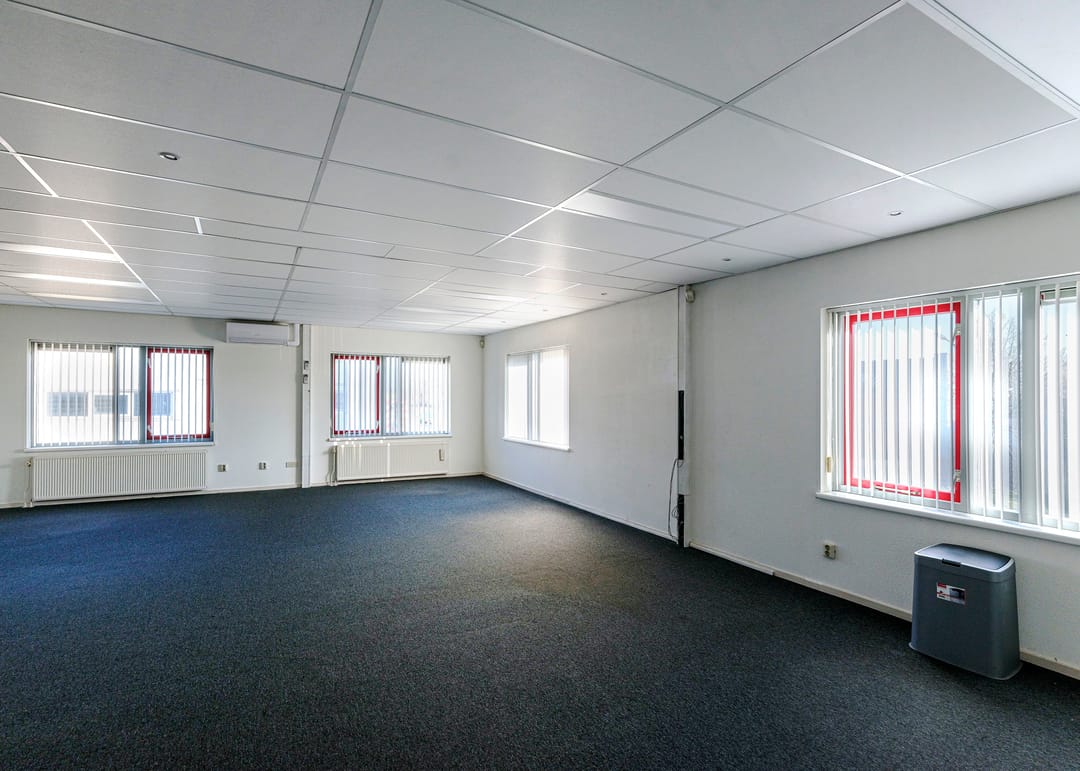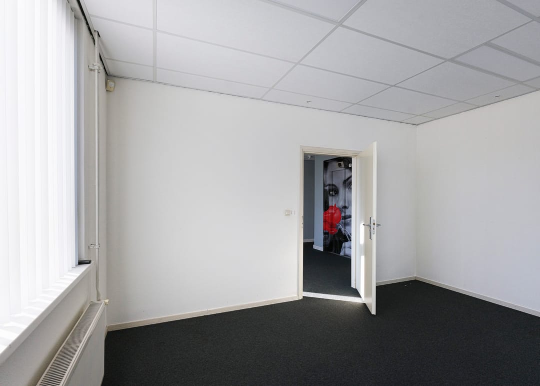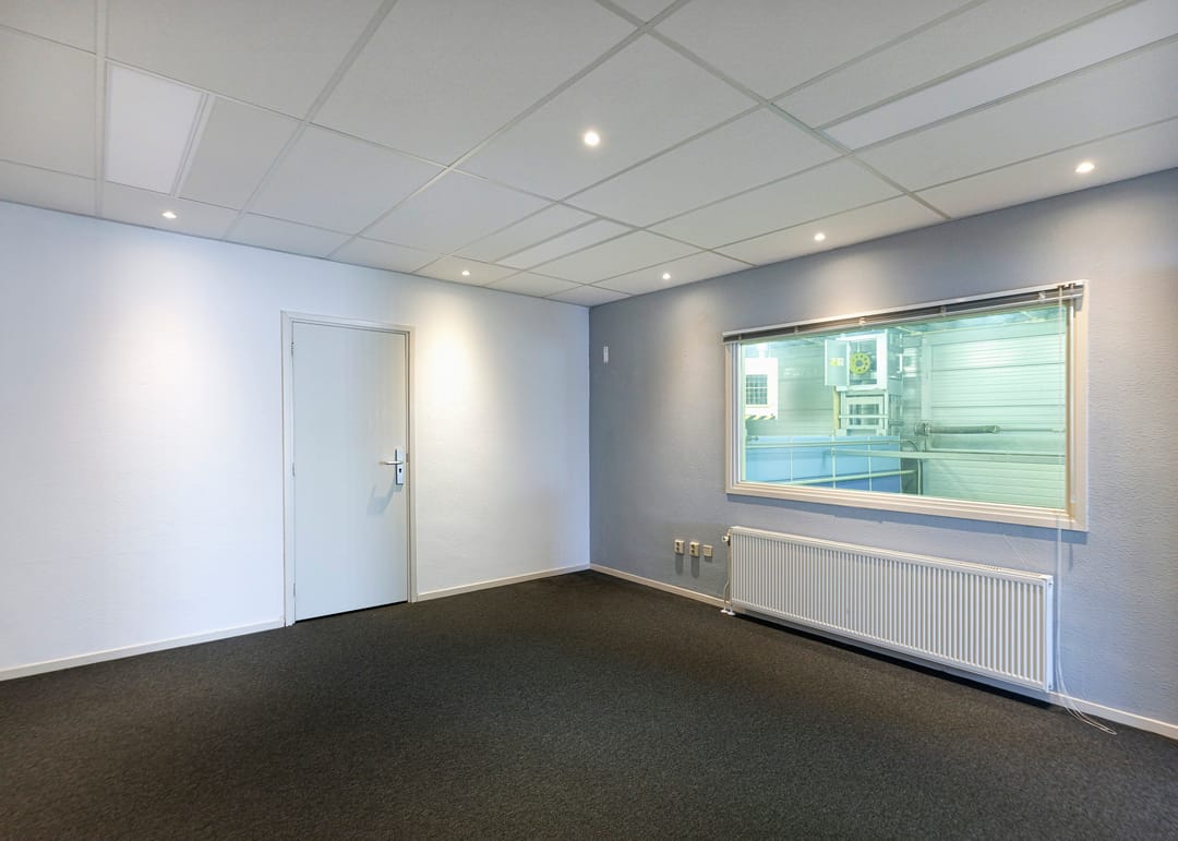 - Kantoorruimte voorzien van vloerbedekking, systeemplafond en raambekleding
