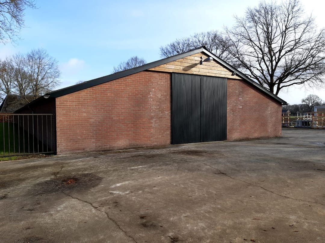 De loods is voorzien van grote schuifdeuren en een loopdeur.