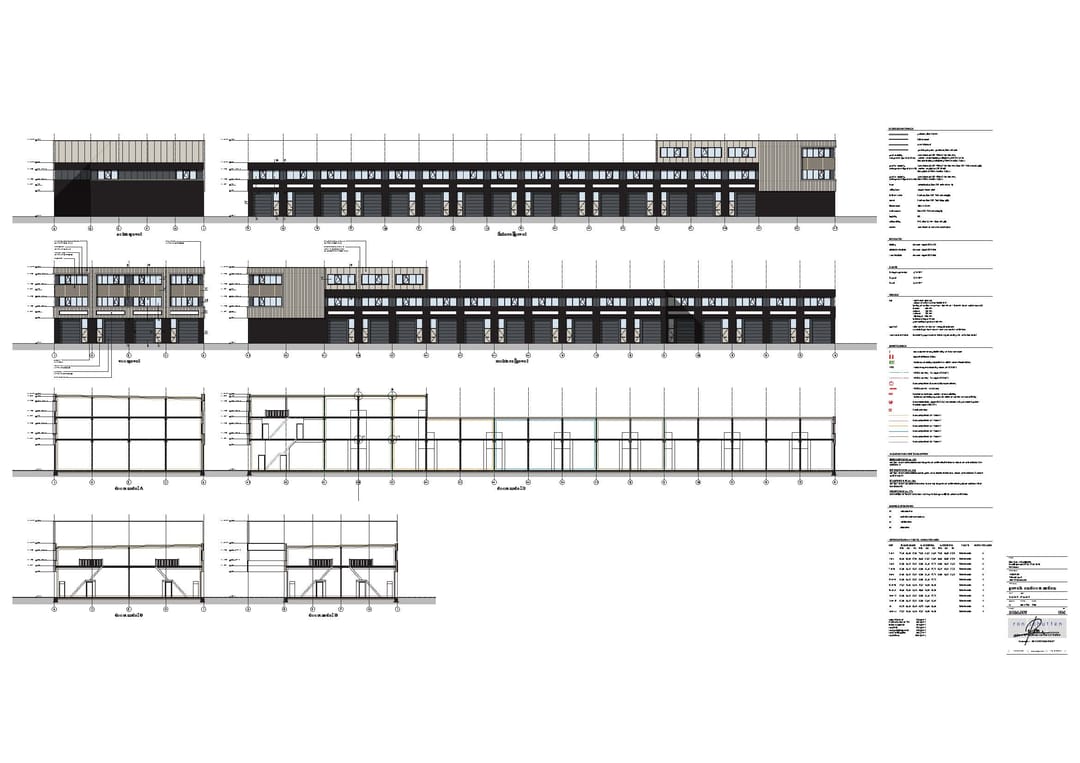 - gevels begane grond metselwerk met daarboven sandwichpanelen, geïsoleerde gevelbeplating (Rc-4,7) en deels hout sierelementen;