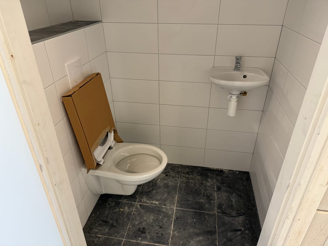- toiletruimte met vloertegels, wandtegels, wandcloset, fonteintje en lichtpunt met sensor;