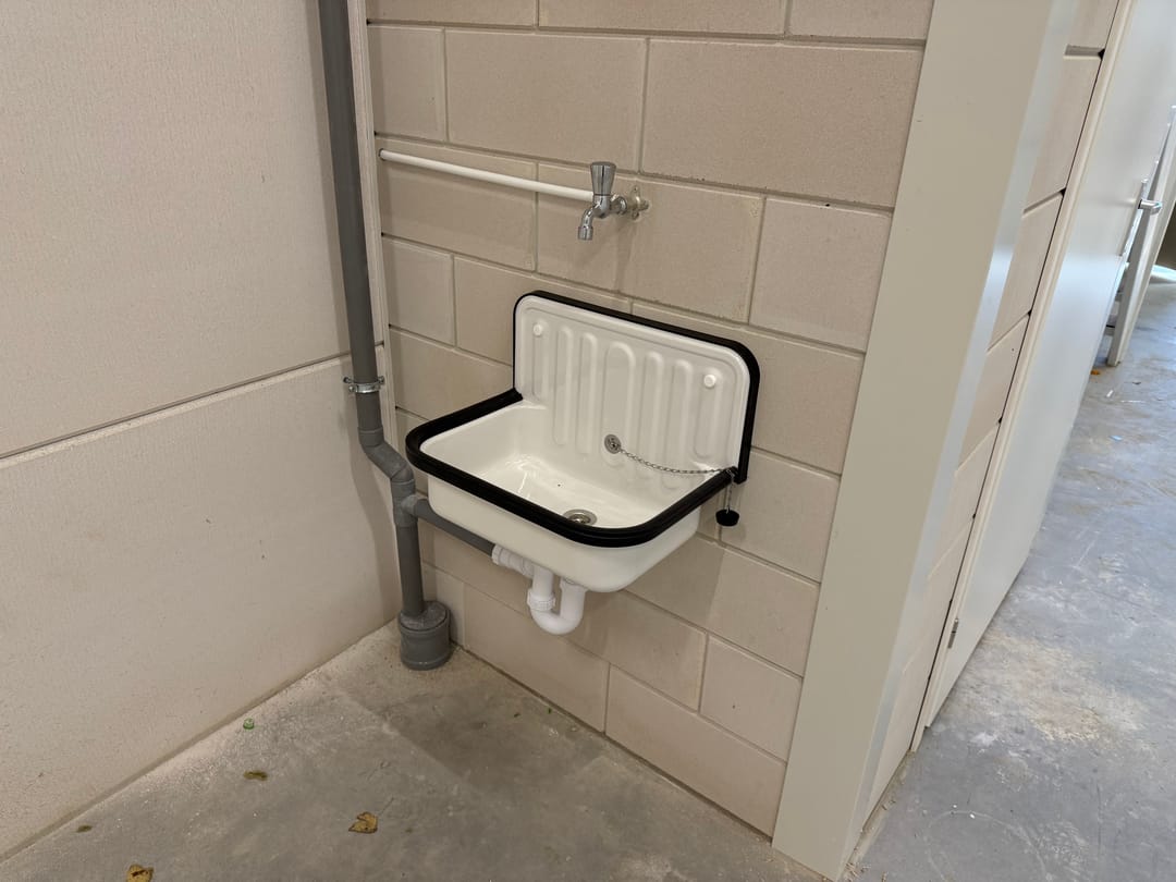- plaatstalen uitstortgootsteen met koudwatervoorziening en waterafvoer;