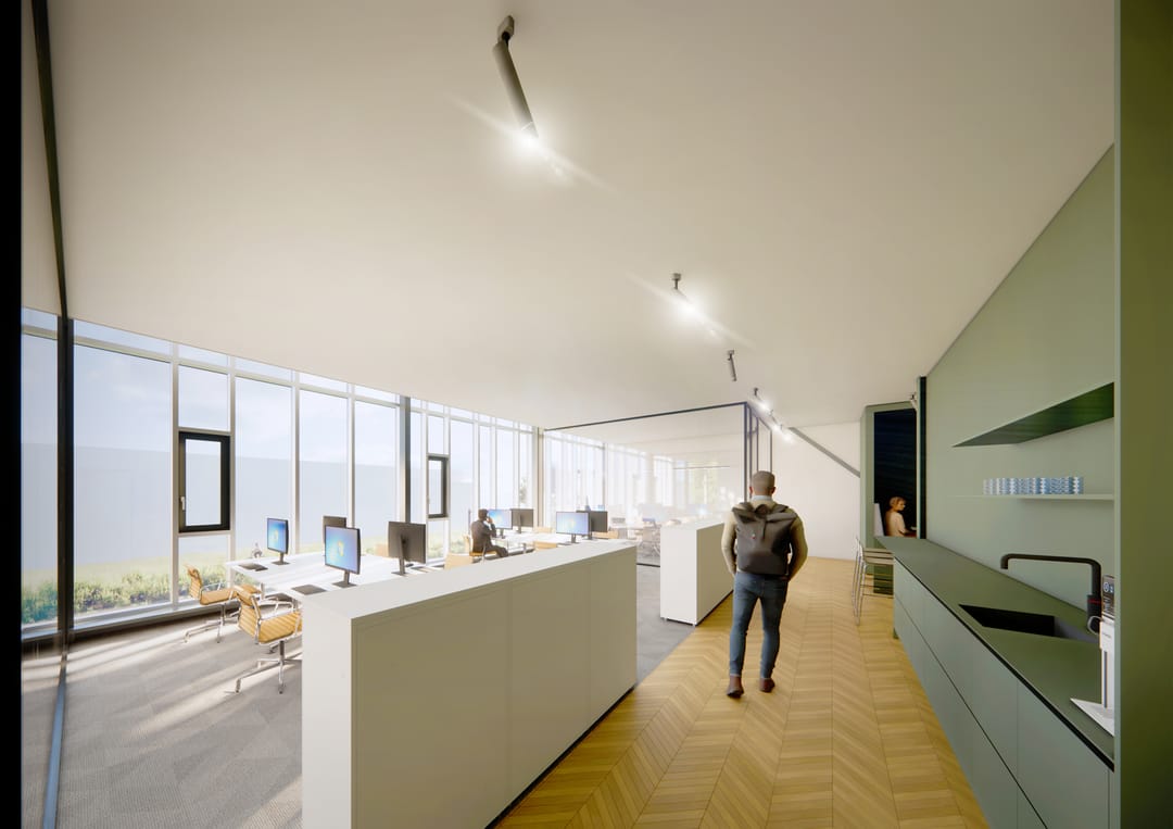 - Scheidingswand tussen het kantoor en de bedrijfsruimte uitgevoerd in sandwichpanelen;