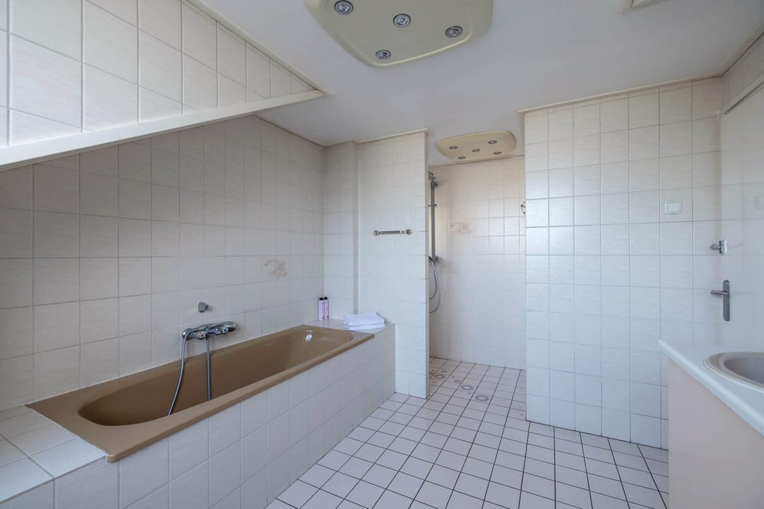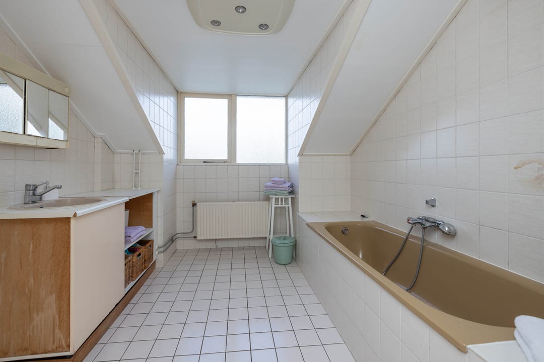 Overloop met vaste kasten, 3 ruime slaapkamers waarvan één met vaste kast en één met dakkapel, badkamer met dakkapel voorzien van ligbad, douche, wastafel en wastafelmeubel.