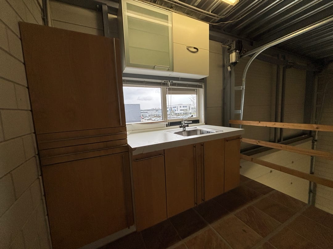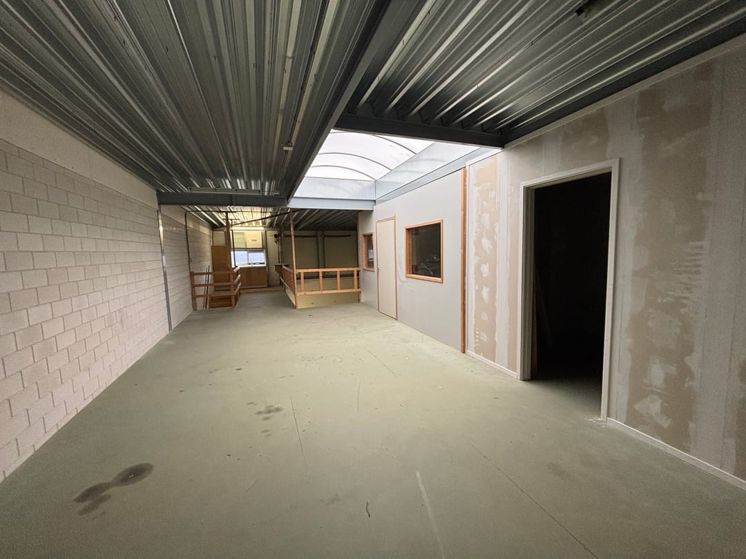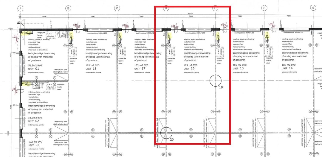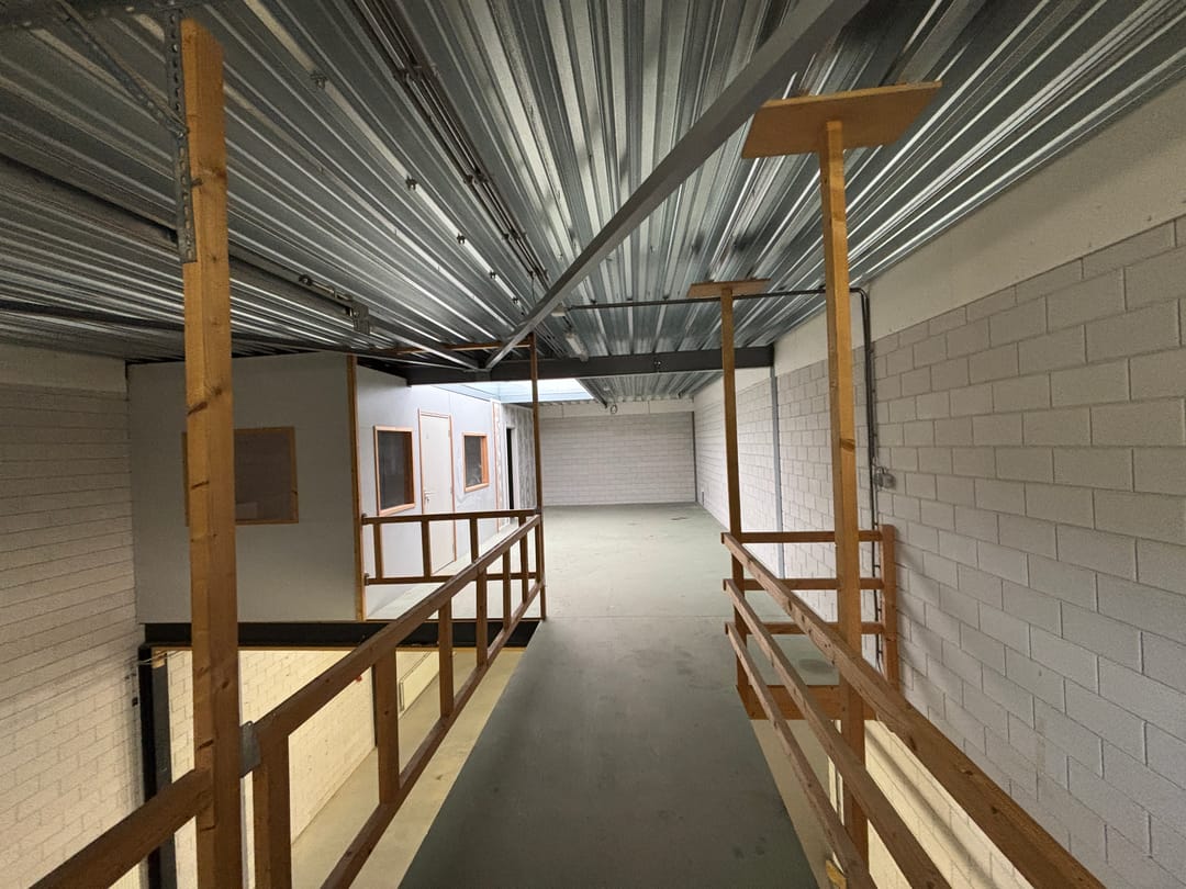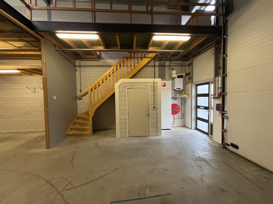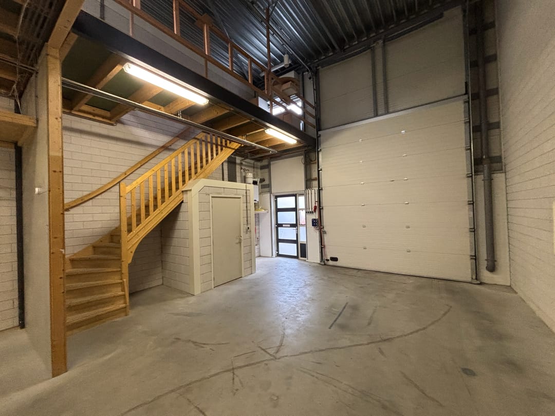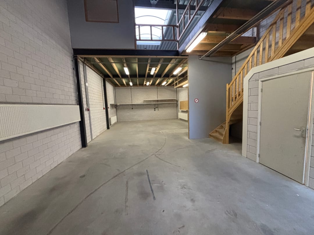 De bedrijfsruimte op de begane grond heeft een oppervlakte van ca. 95 m² en beschikt over een elektrisch bedienbare overheaddeur. De unit is ca. 7 meter breed en heeft een lengte van ca. 14 meter. De vrije hoogte bedraagt ca. 3,70 meter. De overheaddeur heeft een hoogte van ca. 3,5 m. en is ca. 3,6 m. breed. Er is voldoende manoeuvreerruimte voor de overheaddeur. De kantoorruimte op de verdieping heeft een oppervlakte van ca. 25 m² en hier bevindt zich tevens ca. 50 m² opslagruimte. Aan de voorzijde bevinden zich 3 eigen parkeerplaatsen.