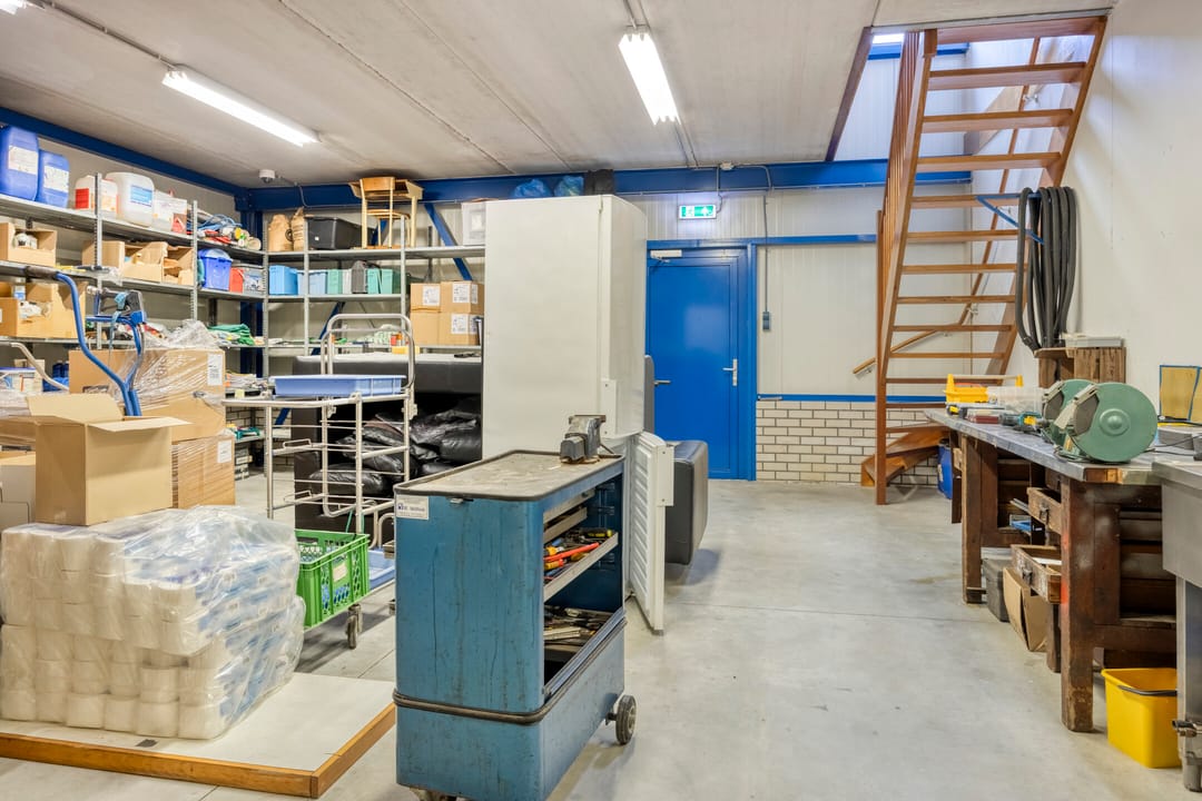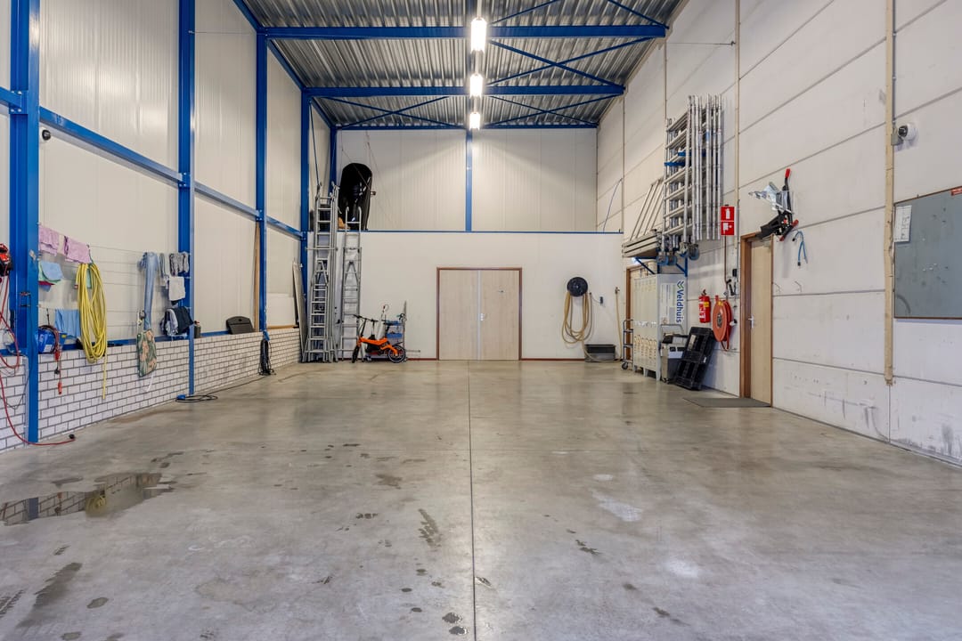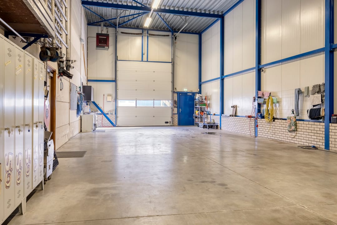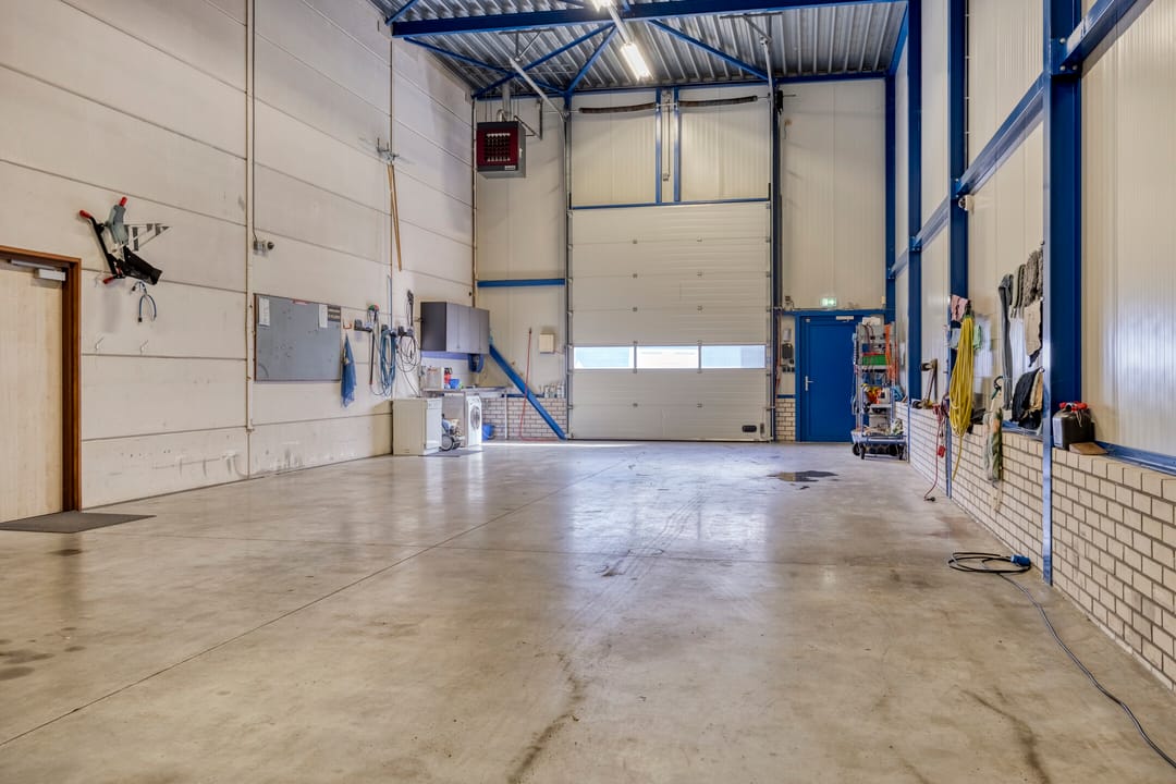 Achter de woning bevindt zich de bedrijfsruimte met kantoorruimte, met aan de voorzijde een ruim verhard buitenterrein. De bedrijfsruimte en opslagruimte hebben gezamenlijk een oppervlakte van circa 229 m². De bedrijfsruimte is circa 8 meter breed (buitenwerks) en circa 22,5 meter lang, met een vrije hoogte van circa 6 meter. Daarmee is deze ruimte uitstekend geschikt voor stalling, opslag of productiewerkzaamheden. Aan de voorzijde bevinden zich een automatisch bedienbare overheaddeur en een separate loopdeur. De ruimte wordt verwarmd middels een gasheater. Aan de rechterkant is een opslagruimte gesitueerd met een eigen entree en een opgang naar de eerste verdieping. Het kantoor op de begane grond beschikt over een ruime entree met separaat toilet en trapopgang. Vanuit de entree bereikt u de kantoortuin met archiefruimte, spreekkamer, kantine met keuken en kleedruimte met toiletten. Op de eerste verdieping bevinden zich drie ruime kantoorruimten met een totale oppervlakte van circa 109 m², alsmede een ruime opslagruimte. De indeling is eenvoudig aan te passen aan uw wensen. Alle kantoorruimten zijn voorzien van airconditioning. Daarnaast beschikt de verdieping over een pantry. Het geheel is keurig en representatief afgewerkt. De bedrijfswoning en bedrijfsruimte beschikken over één hoofdmeter voor gas, water en elektra. Voor de bedrijfsruimte zijn tussenmeters aanwezig.