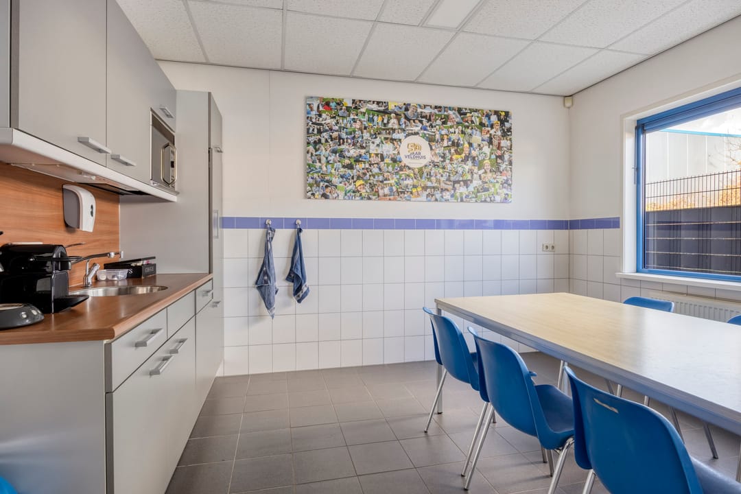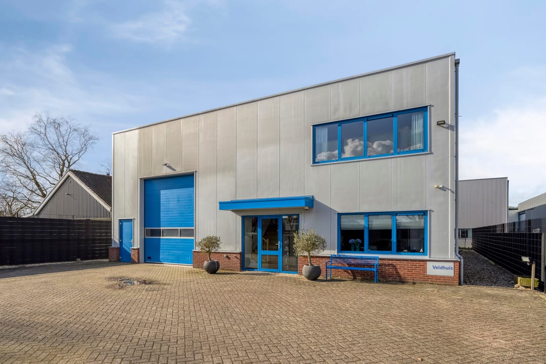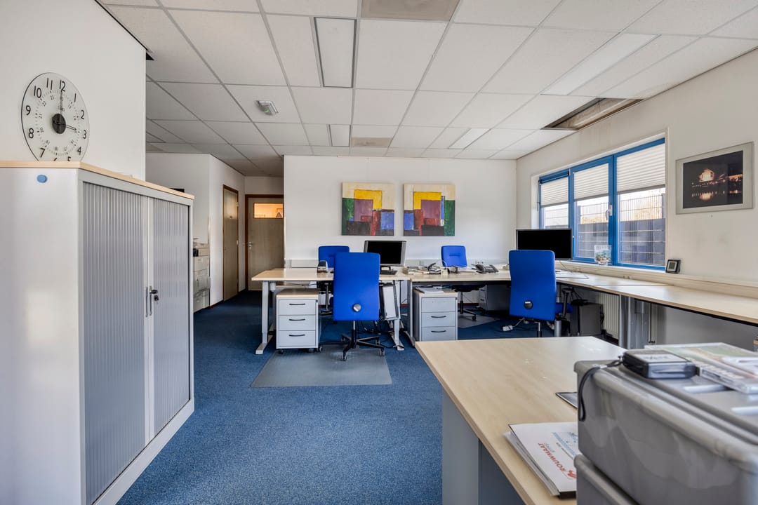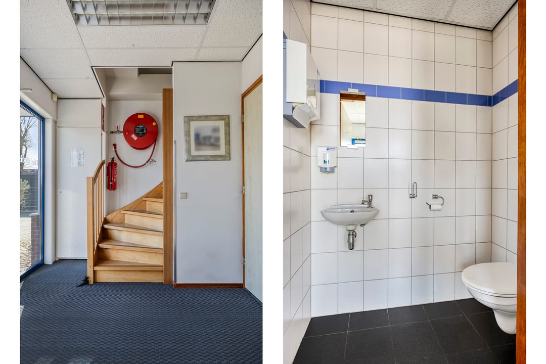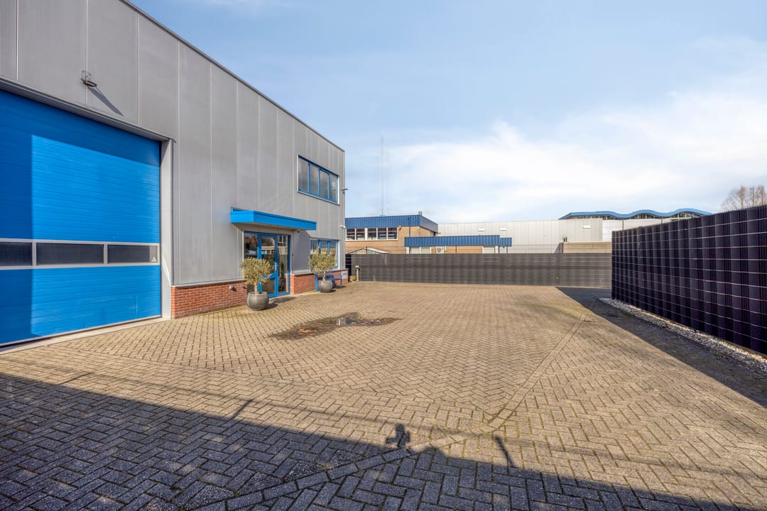 Achter de woning bevindt zich de bedrijfsruimte met kantoorruimte, met aan de voorzijde een ruim verhard buitenterrein. De bedrijfsruimte en opslagruimte hebben gezamenlijk een oppervlakte van circa 229 m². De bedrijfsruimte is circa 8 meter breed (buitenwerks) en circa 22,5 meter lang, met een vrije hoogte van circa 6 meter. Daarmee is deze ruimte uitstekend geschikt voor stalling, opslag of productiewerkzaamheden. Aan de voorzijde bevinden zich een automatisch bedienbare overheaddeur en een separate loopdeur. De ruimte wordt verwarmd middels een gasheater. Aan de rechterkant is een opslagruimte gesitueerd met een eigen entree en een opgang naar de eerste verdieping. Het kantoor op de begane grond beschikt over een ruime entree met separaat toilet en trapopgang. Vanuit de entree bereikt u de kantoortuin met archiefruimte, spreekkamer, kantine met keuken en kleedruimte met toiletten. Op de eerste verdieping bevinden zich drie ruime kantoorruimten met een totale oppervlakte van circa 109 m², alsmede een ruime opslagruimte. De indeling is eenvoudig aan te passen aan uw wensen. Alle kantoorruimten zijn voorzien van airconditioning. Daarnaast beschikt de verdieping over een pantry. Het geheel is keurig en representatief afgewerkt. De bedrijfswoning en bedrijfsruimte beschikken over één hoofdmeter voor gas, water en elektra. Voor de bedrijfsruimte zijn tussenmeters aanwezig.