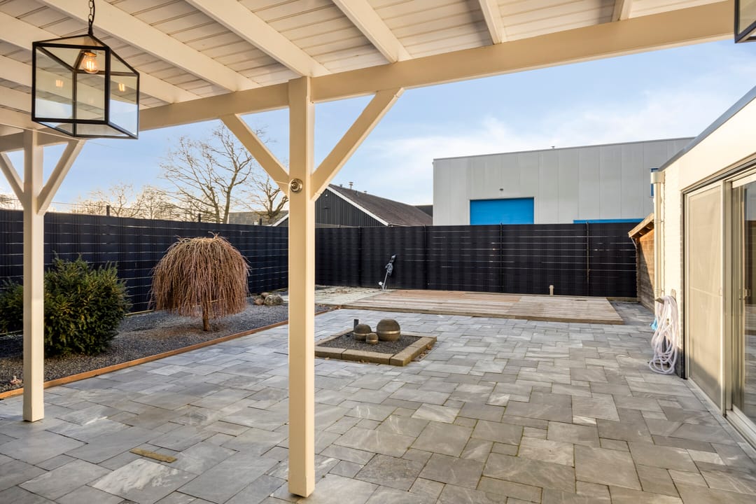 Tussen de woning en de bedrijfsruimte ligt een ruim verhard buitenterrein, ideaal voor stalling en parkeren. Dit terrein heeft een lengte van circa 10 meter en een breedte van circa 20 meter.