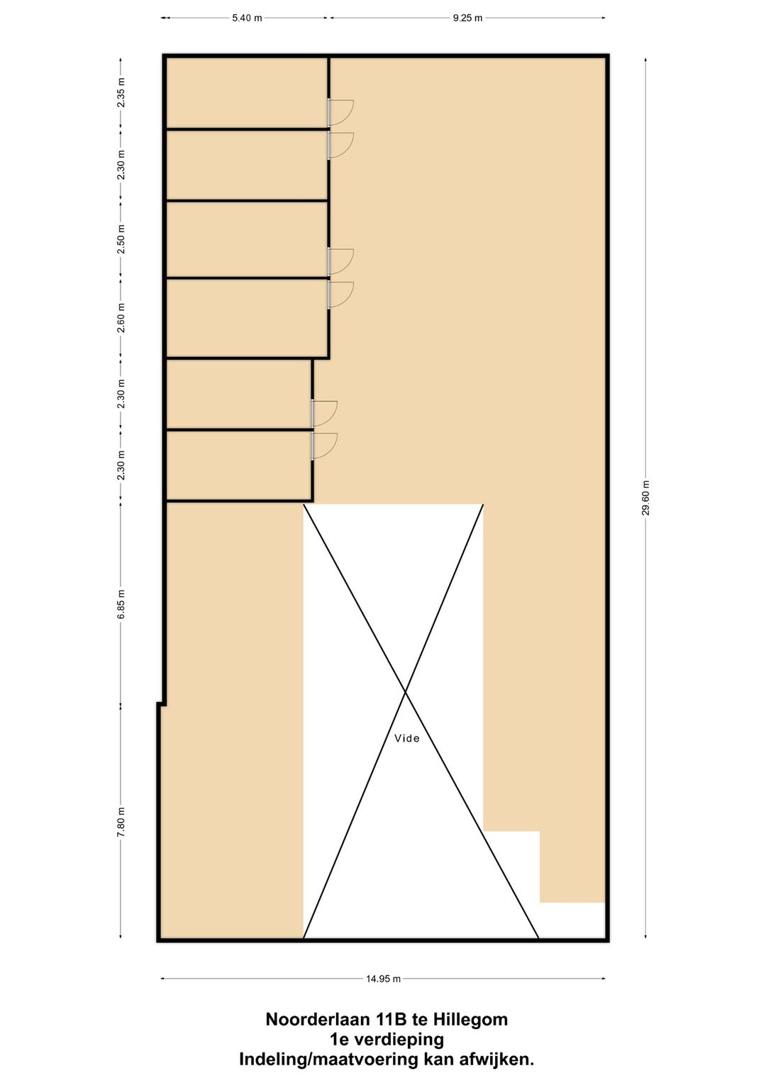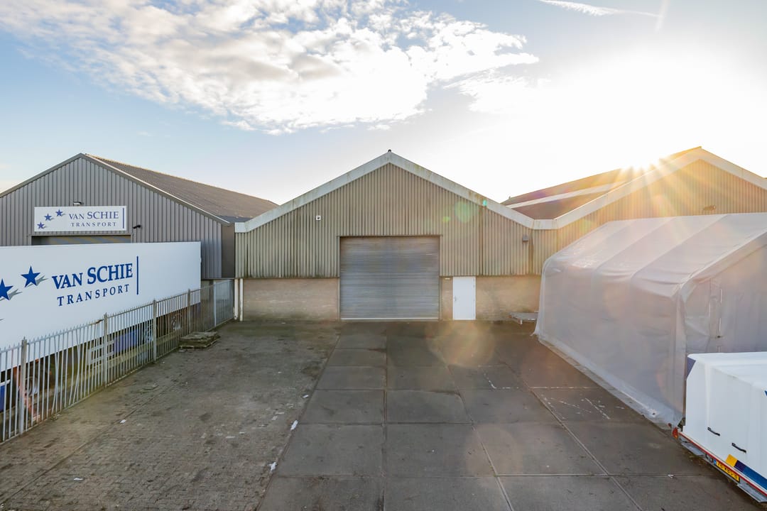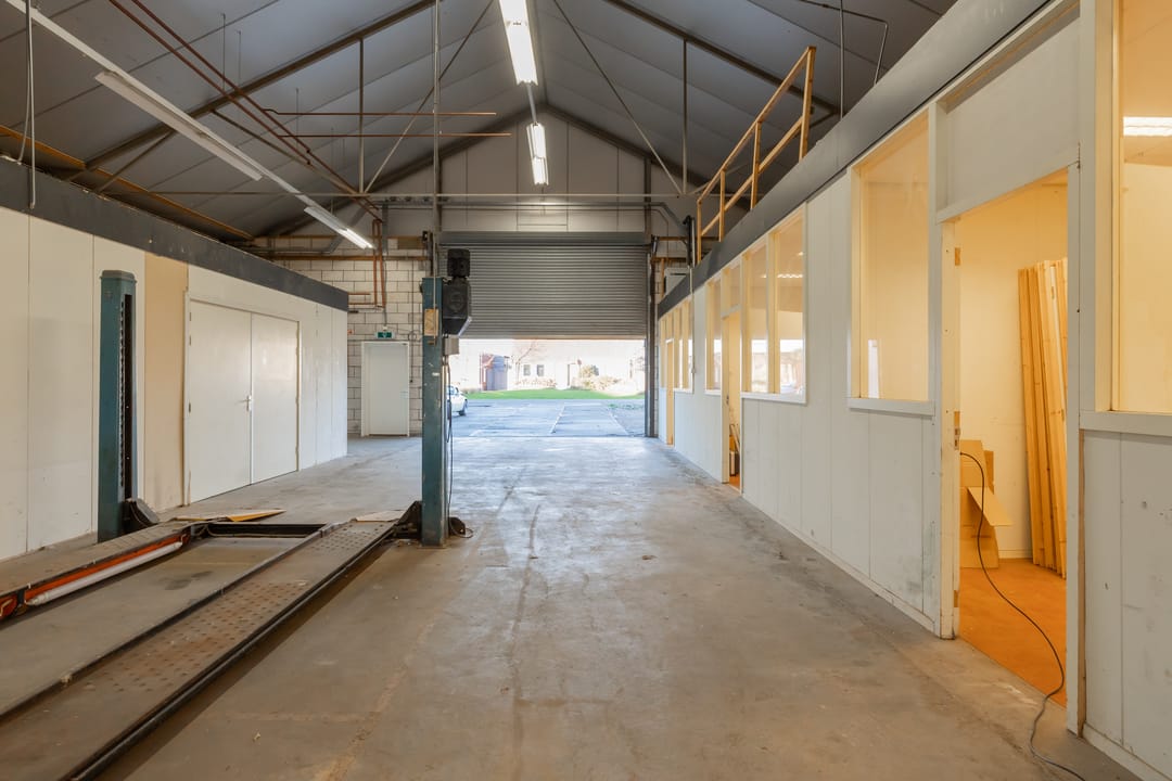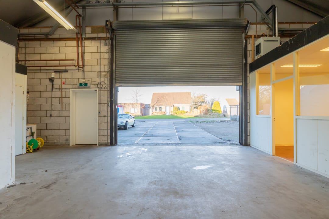 De elektrisch bedienbare overheaddeur heeft een doorrijhoogte van ca. 4,00 meter. De nokhoogte van het bedrijfspand bedraagt ca. 7,85 meter, aflopend naar 4,60 meter aan de zijkanten. De vrije hoogte onder de stalen spanten bedraagt ca. 4,20 meter.