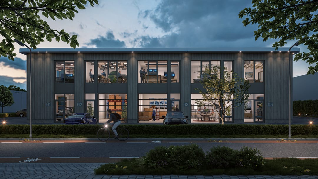 Deze hoekunit van ca. 123 m² (ca. 61 m² begane grond en 61 m² verdieping) bevindt zich op een zichtlocatie aan de voorzijde van het gebouw, ideaal voor zichtbaarheid en reclame-uitingen. De ruimte beschikt over een glazen overheaddeur aan zowel de voor- als zijkant, royale raampartijen en hoogwaardige houten gevelbekleding met bronskleurige accenten – een uitstraling die uw bedrijf professioneel en stijlvol presenteert.