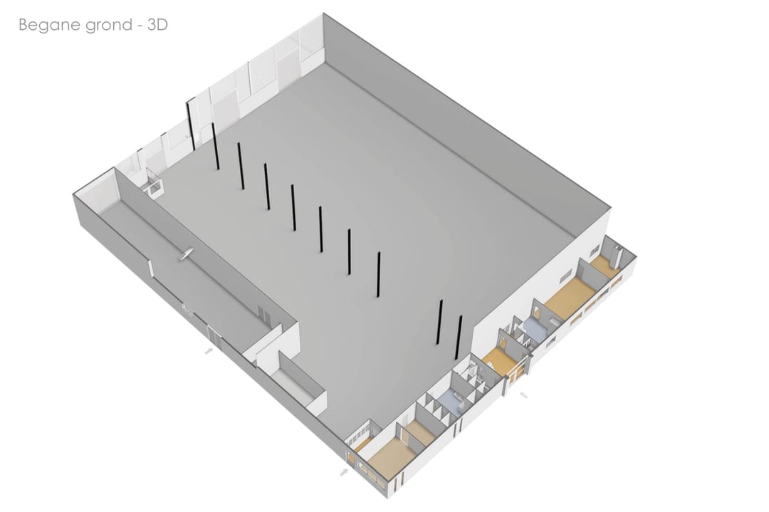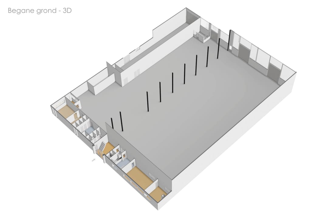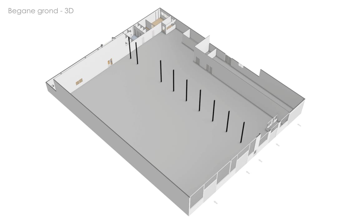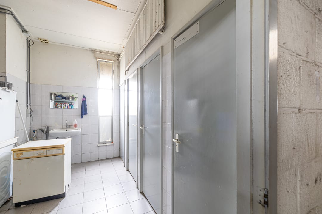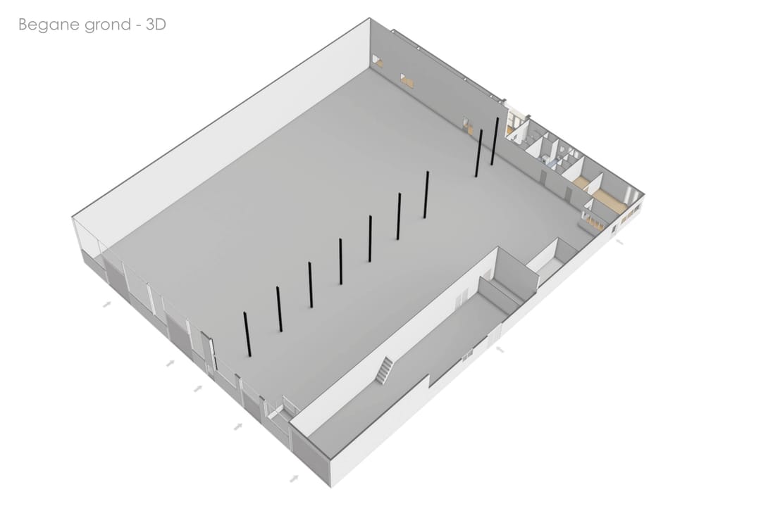 Op de begane grond bevindt zich een royale bedrijfshal met een ruime werkplaats, aangevuld met diverse praktische voorzieningen. Zo zijn er een keuken, sanitair en enkele kantoorruimtes aanwezig, waardoor deze verdieping optimaal functioneert voor zowel productie als ondersteunende werkzaamheden.