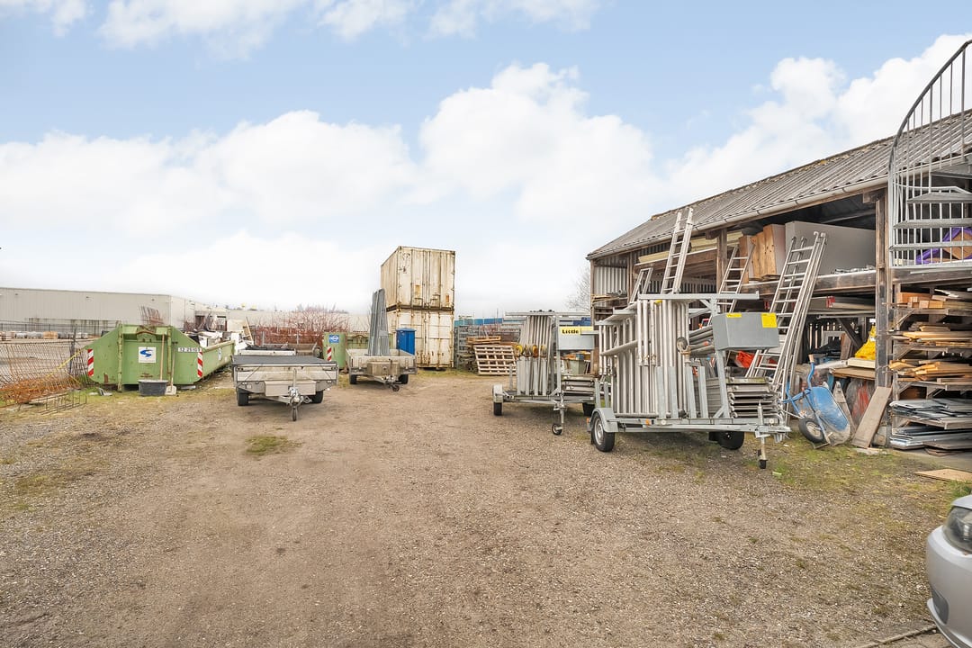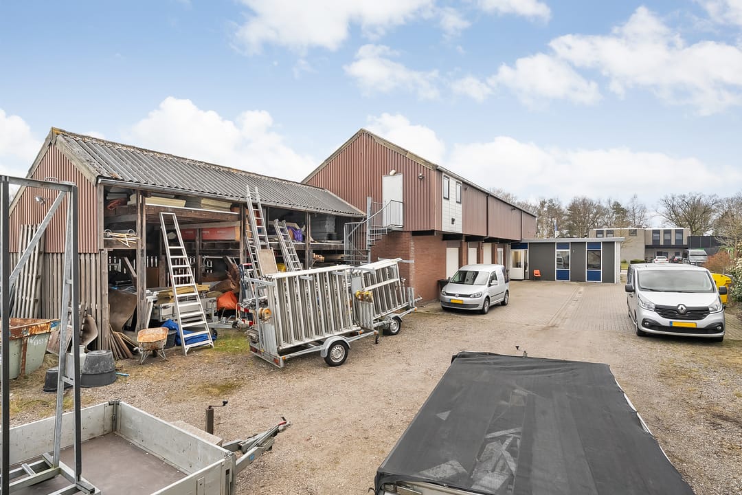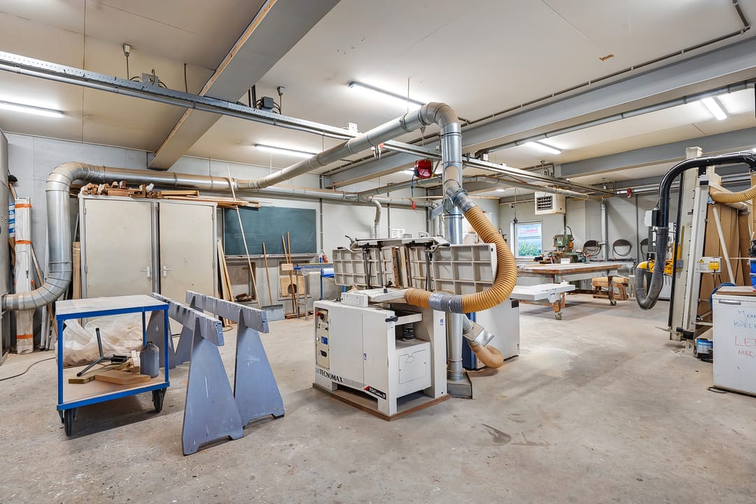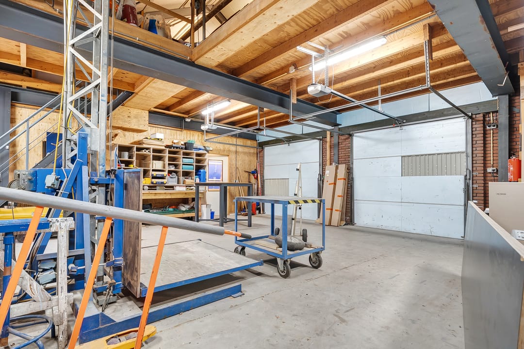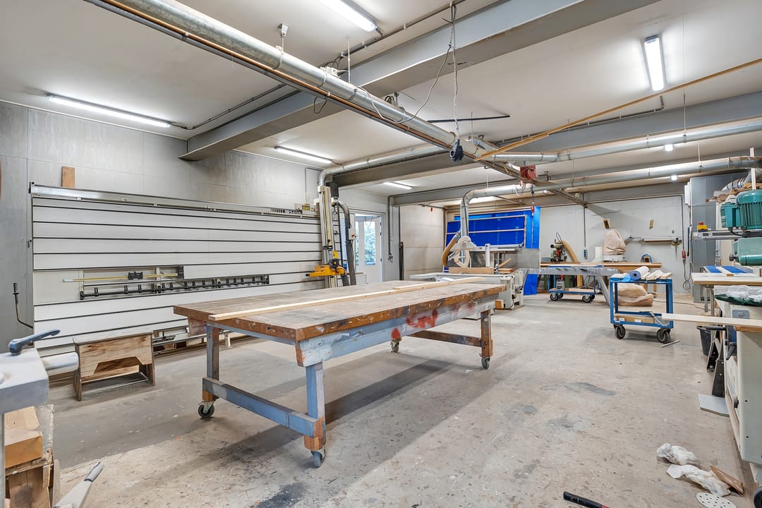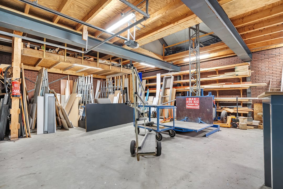 De afgescheiden werkplaats is voorzien van een elektrische kanteldeur, loopdeur en toiletgroep. De naastgelegen bedrijfs-/opslagruimte, welke binnendoor bereikbaar is vanuit de werkplaats is voorzien van 2 elektrische kanteldeuren en opslagruimte op de verdieping met een kantine van ca. 25 m². Aan de achterzijde van het pand is een half overdekte houtopslag/overkapping.