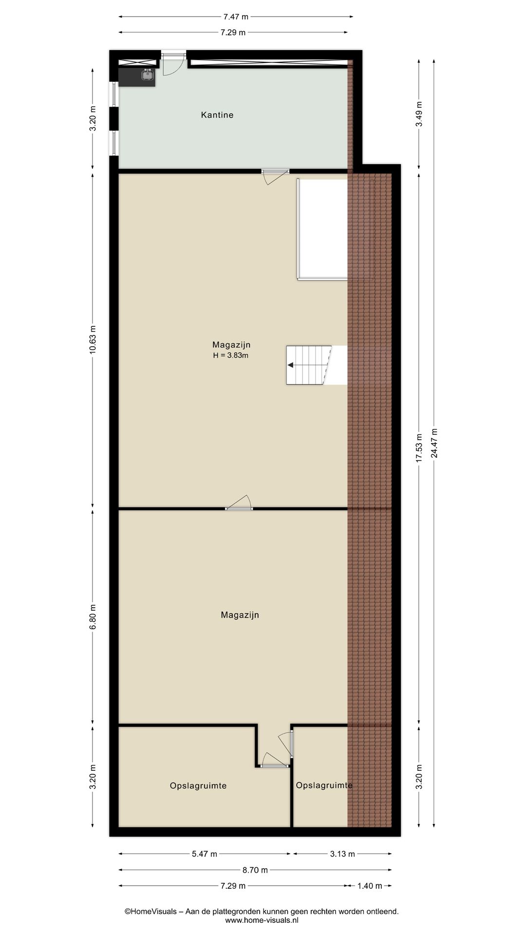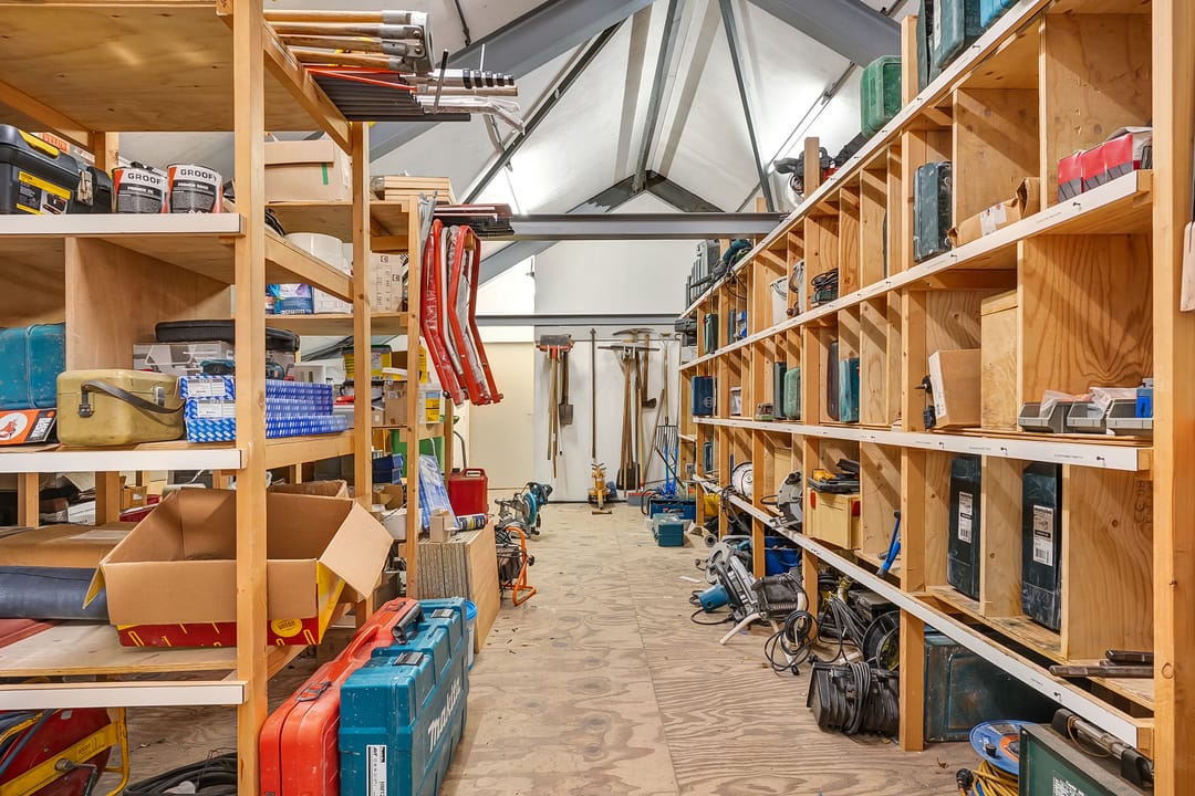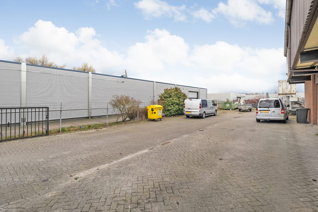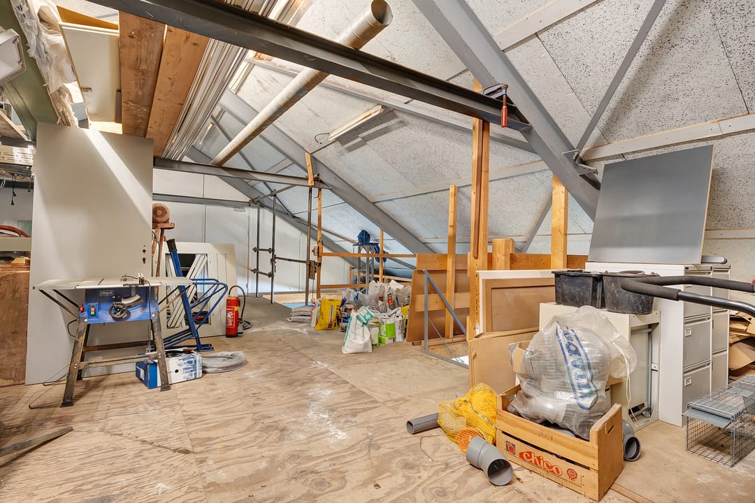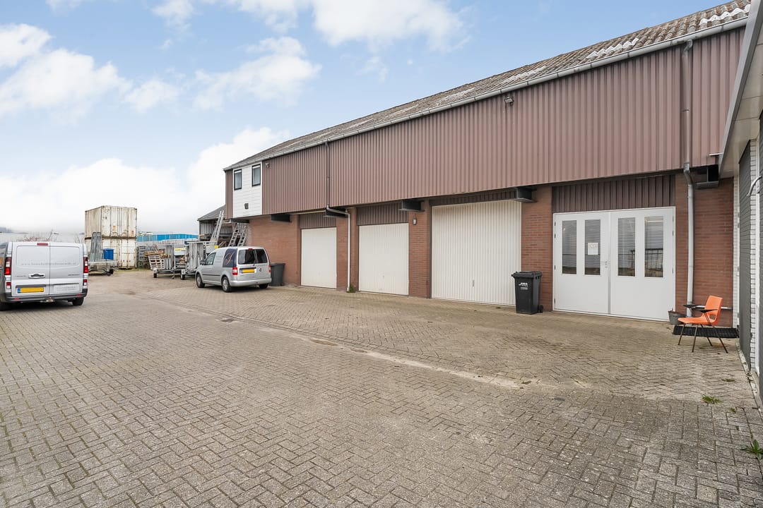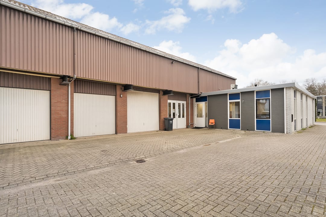 De afgescheiden werkplaats is voorzien van een elektrische kanteldeur, loopdeur en toiletgroep. De naastgelegen bedrijfs-/opslagruimte, welke binnendoor bereikbaar is vanuit de werkplaats is voorzien van 2 elektrische kanteldeuren en opslagruimte op de verdieping met een kantine van ca. 25 m². Aan de achterzijde van het pand is een half overdekte houtopslag/overkapping.