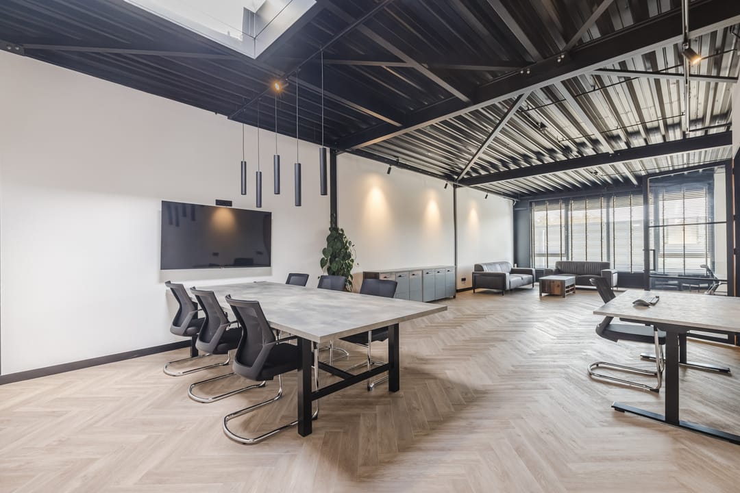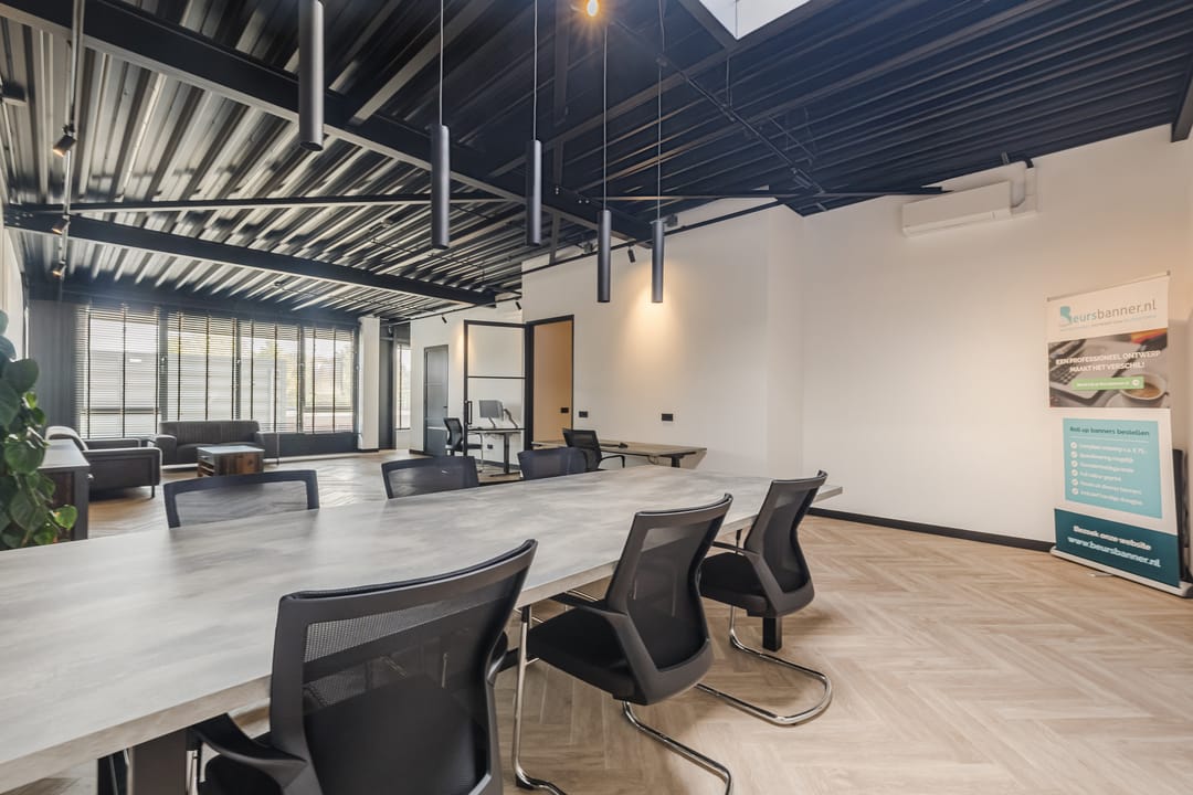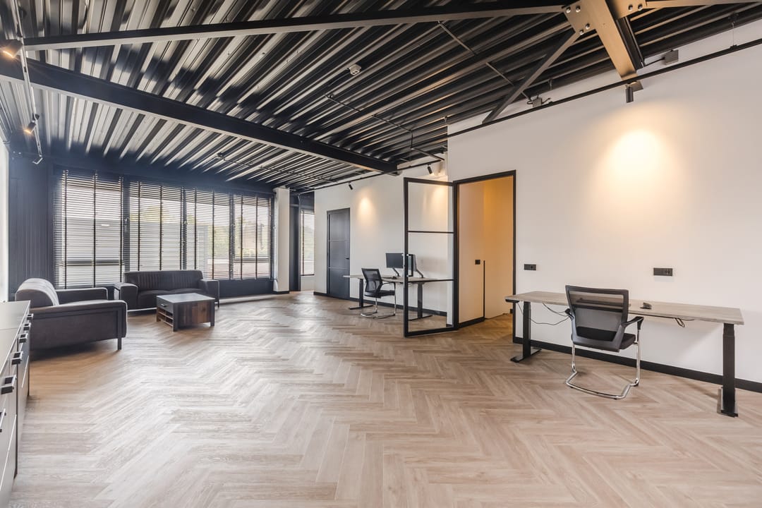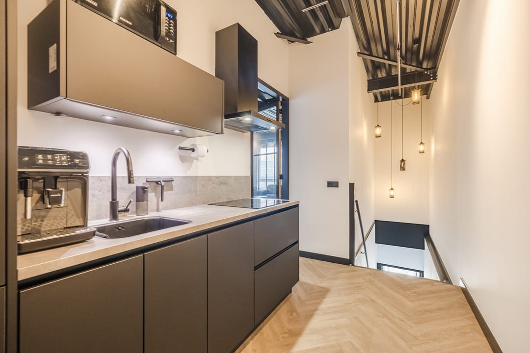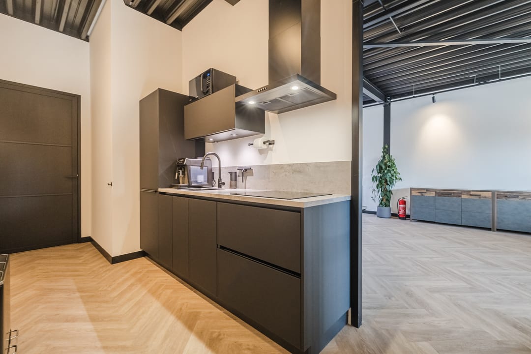 • Verdieping: volledig ingericht kantoor met open werkruimte, keuken (vaatwasser, koelkast incl. vriezer, inductiekookplaat, afzuigkap), hoogwaardig toilet, lichtkoepel, verlichting en 2 airco-units voor zowel verwarmen en koelen.