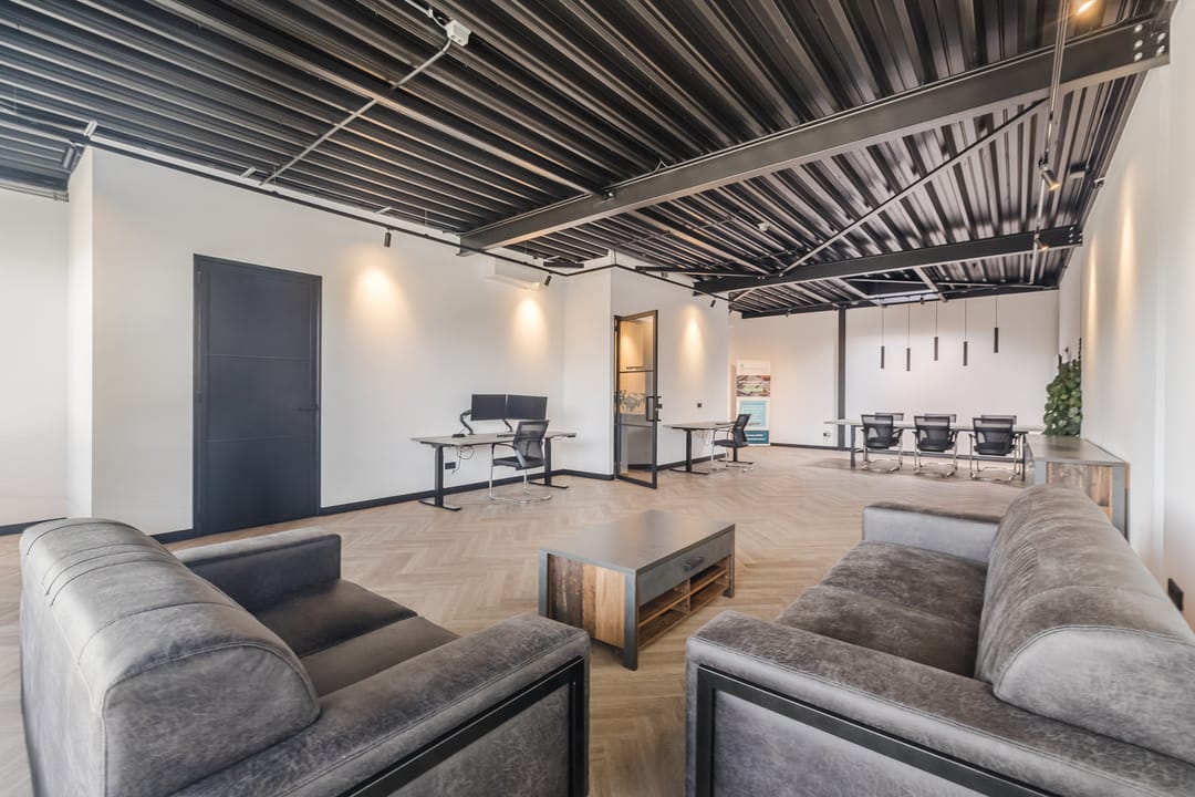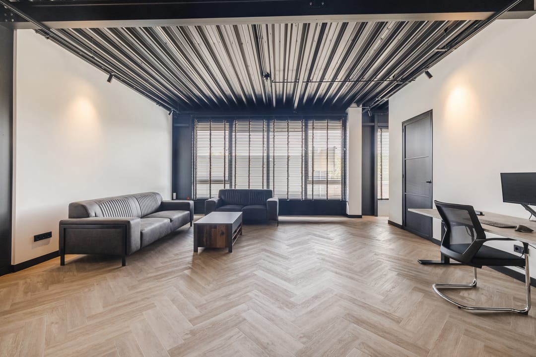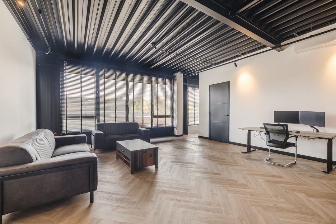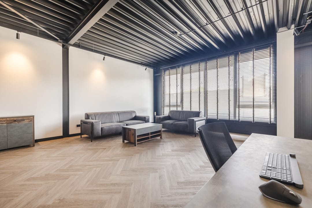 De bovenverdieping is ingericht als moderne kantoorruimte met voldoende werkplekken. Eveneens is deze bovenverdieping uitgerust met een zeer strakke keuken en toiletruimte.