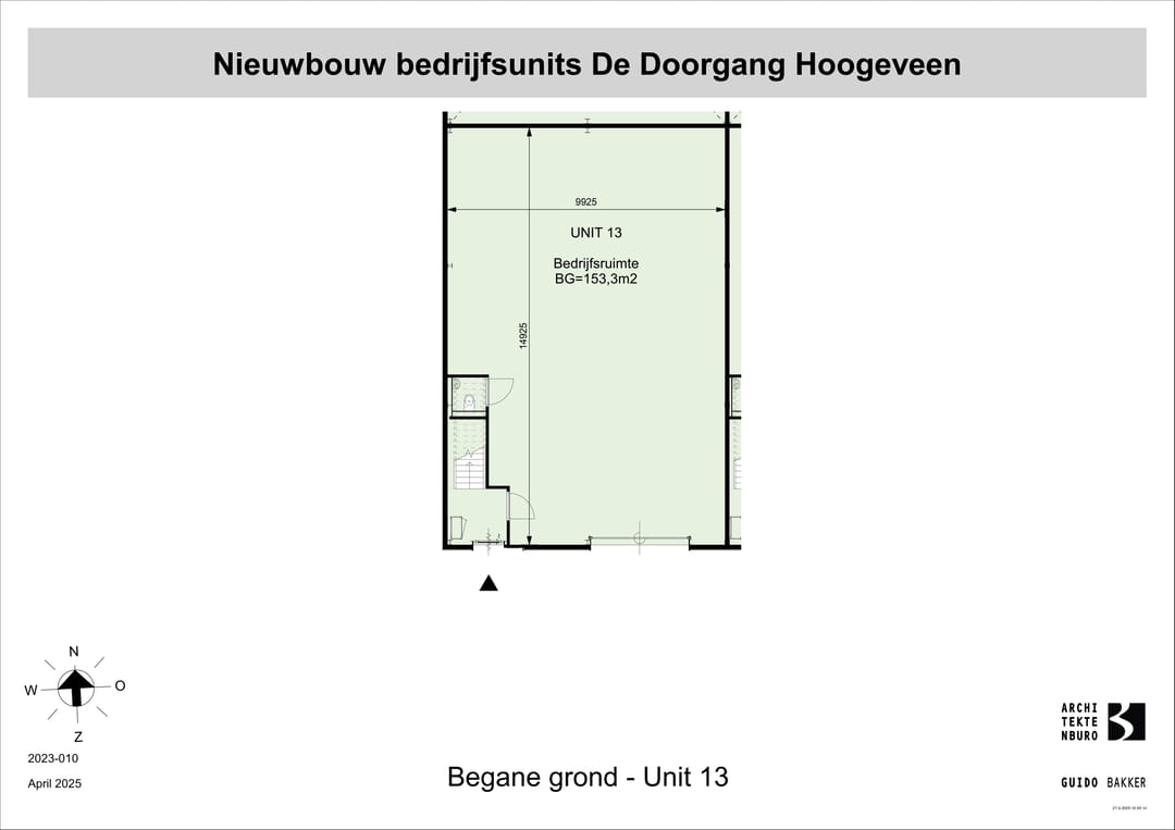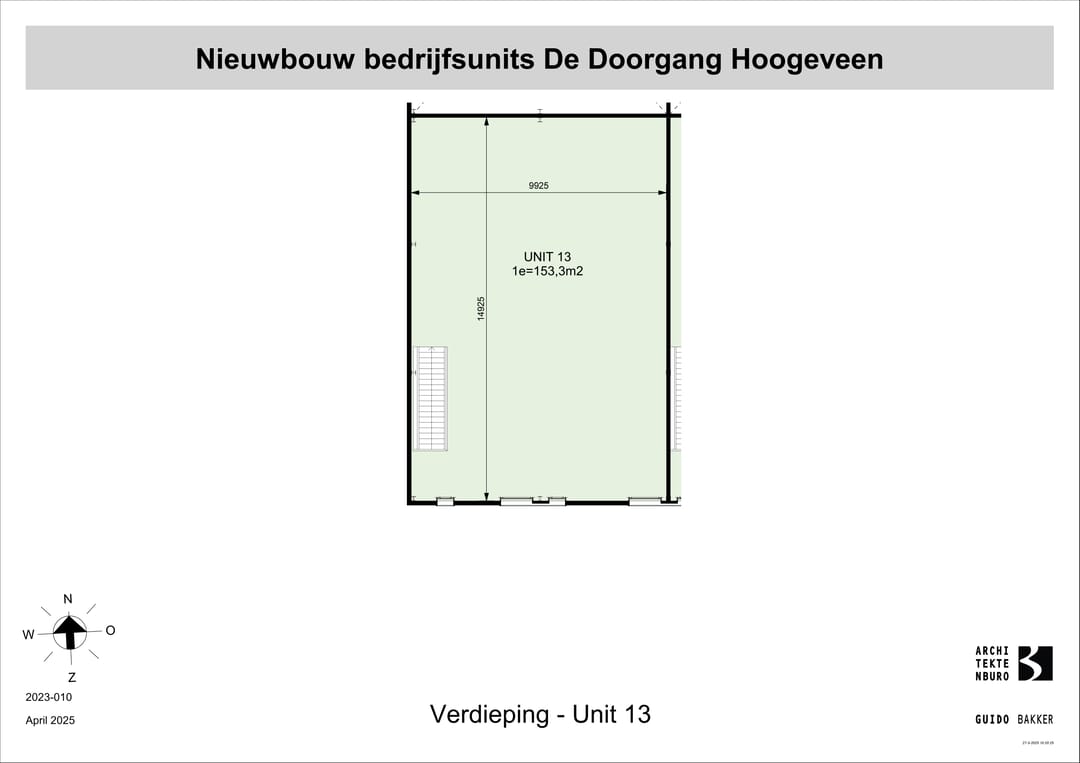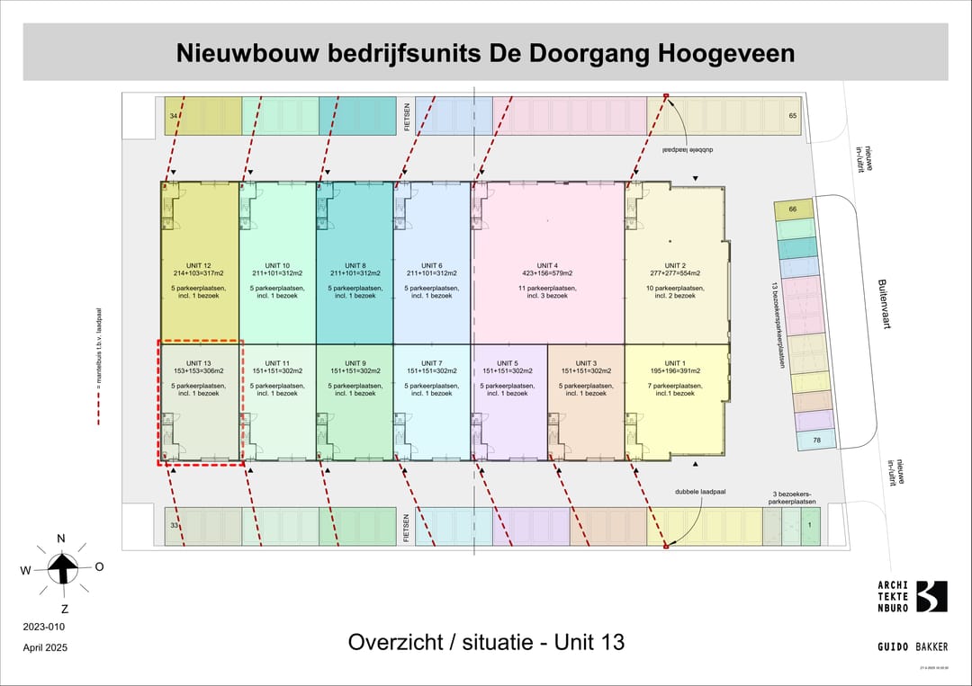 De hoekunit 13 is gelegen aan de zuid – west zijde. De units aan de zuidzijde kenmerken zich door een praktische maatvoering en zijn allen voorzien van een elektrische overheaddeur. Ze zijn in het geheel voorzien van een tussenvloer. Op de verdieping is eenvoudig een kantoor of showroom te realiseren.