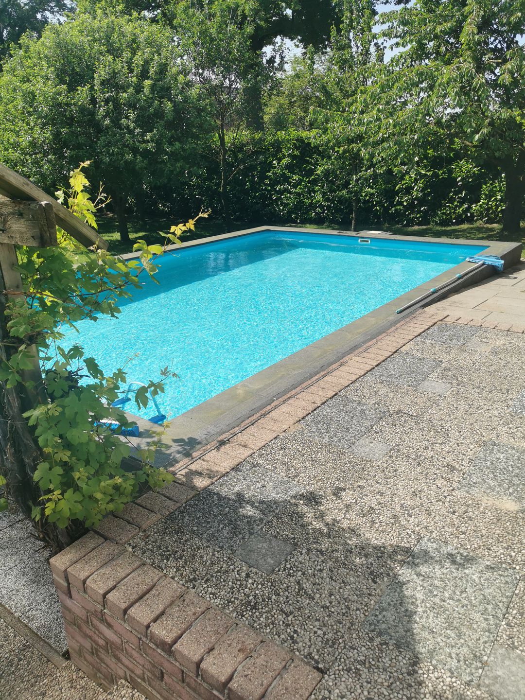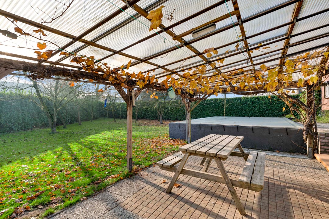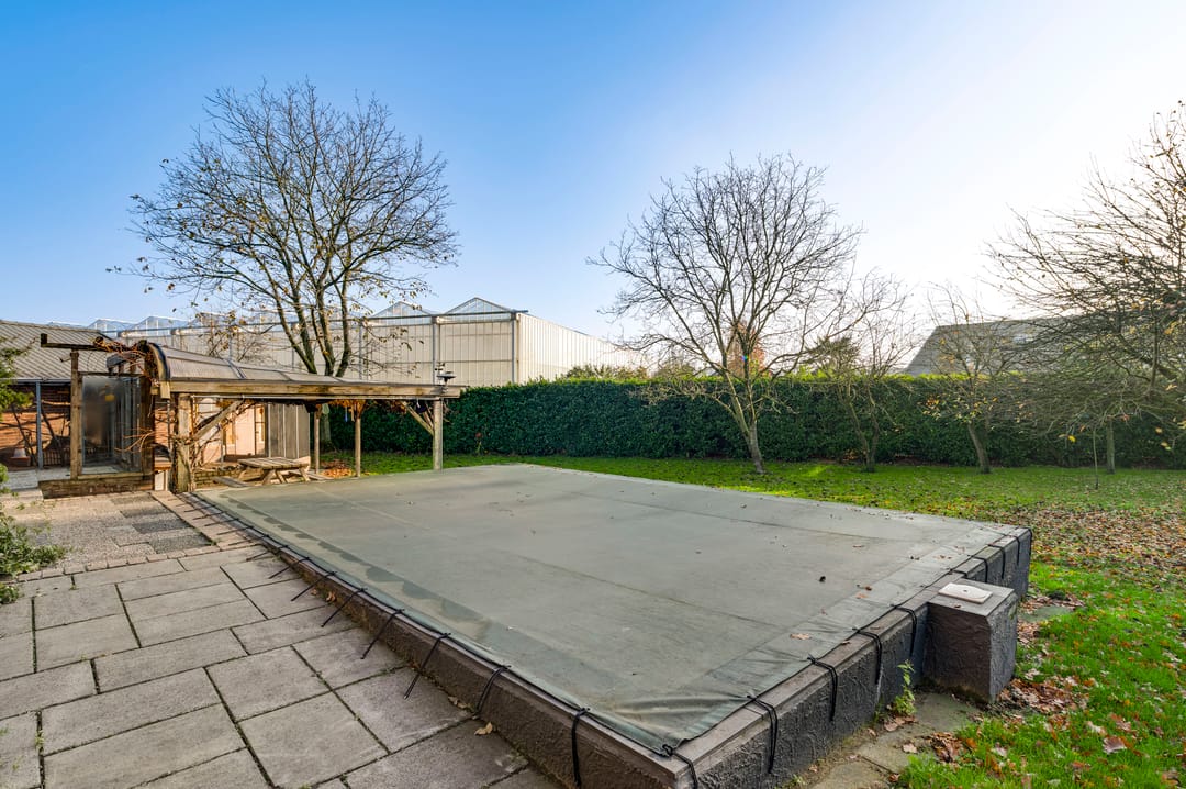 Tussen de garage en de serre bevinden zich een terras, overdekt zitgedeelte en het zwembad.