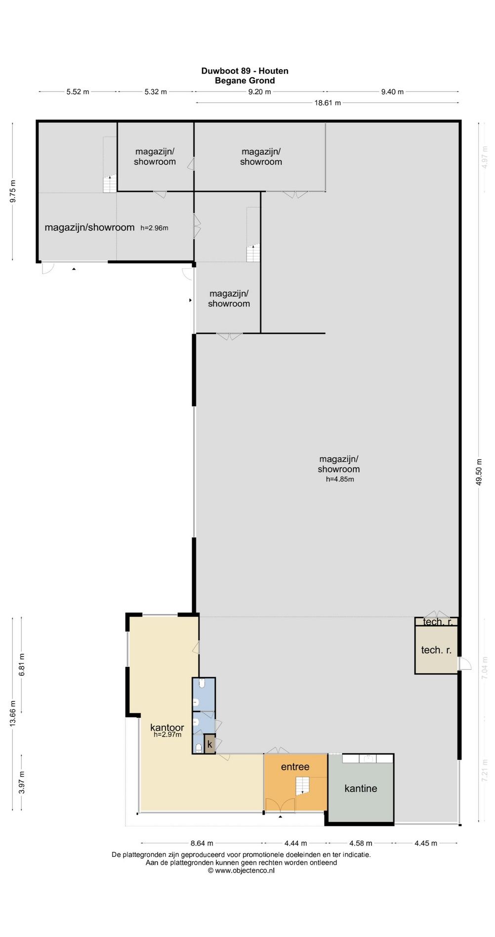 - vrije hoogte bedrijfshal/showroom: ca. 587 cm onder stalen spanten, ca. 485 cm onder systeemplafond