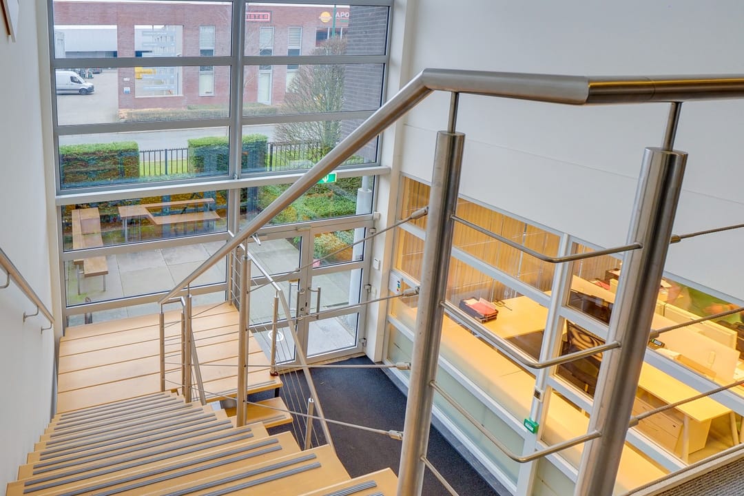 - stalen trap met houten treden naar verdieping