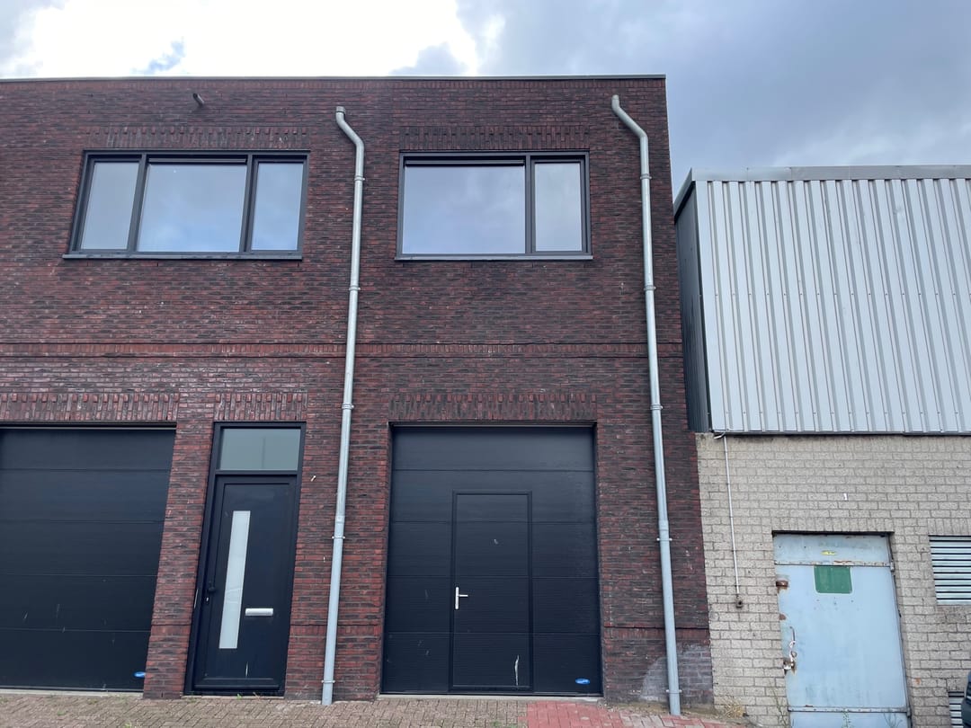 Elektrische overheaddeur 2.50m breed en 3m hoog, separate toegangsdeur, trippelglas kunststof kozijnen.