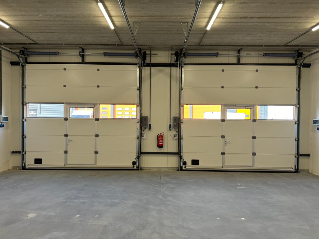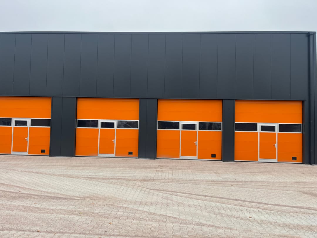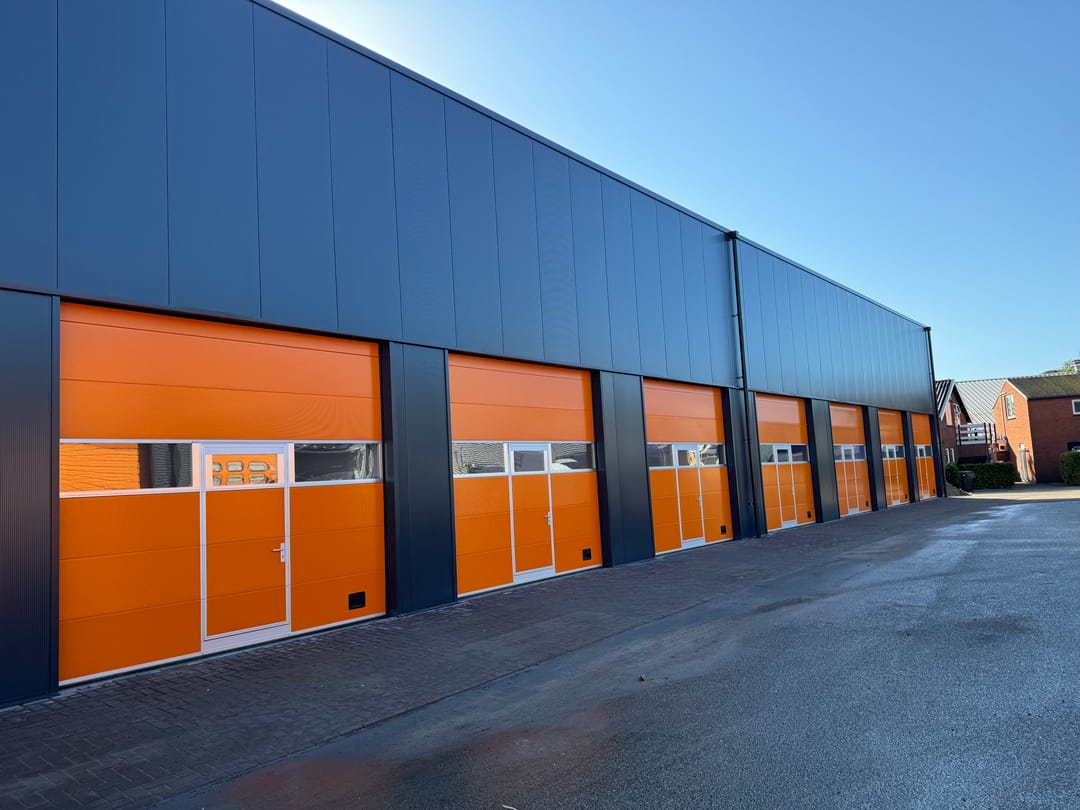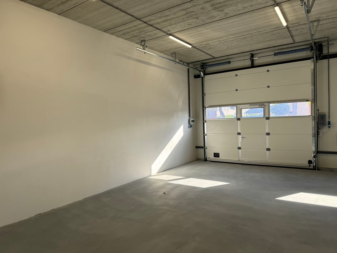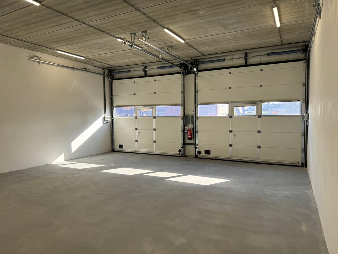 - elektrisch bedienbare overheaddeur (350 cm hoog en 375 cm breed) met loopdeur;