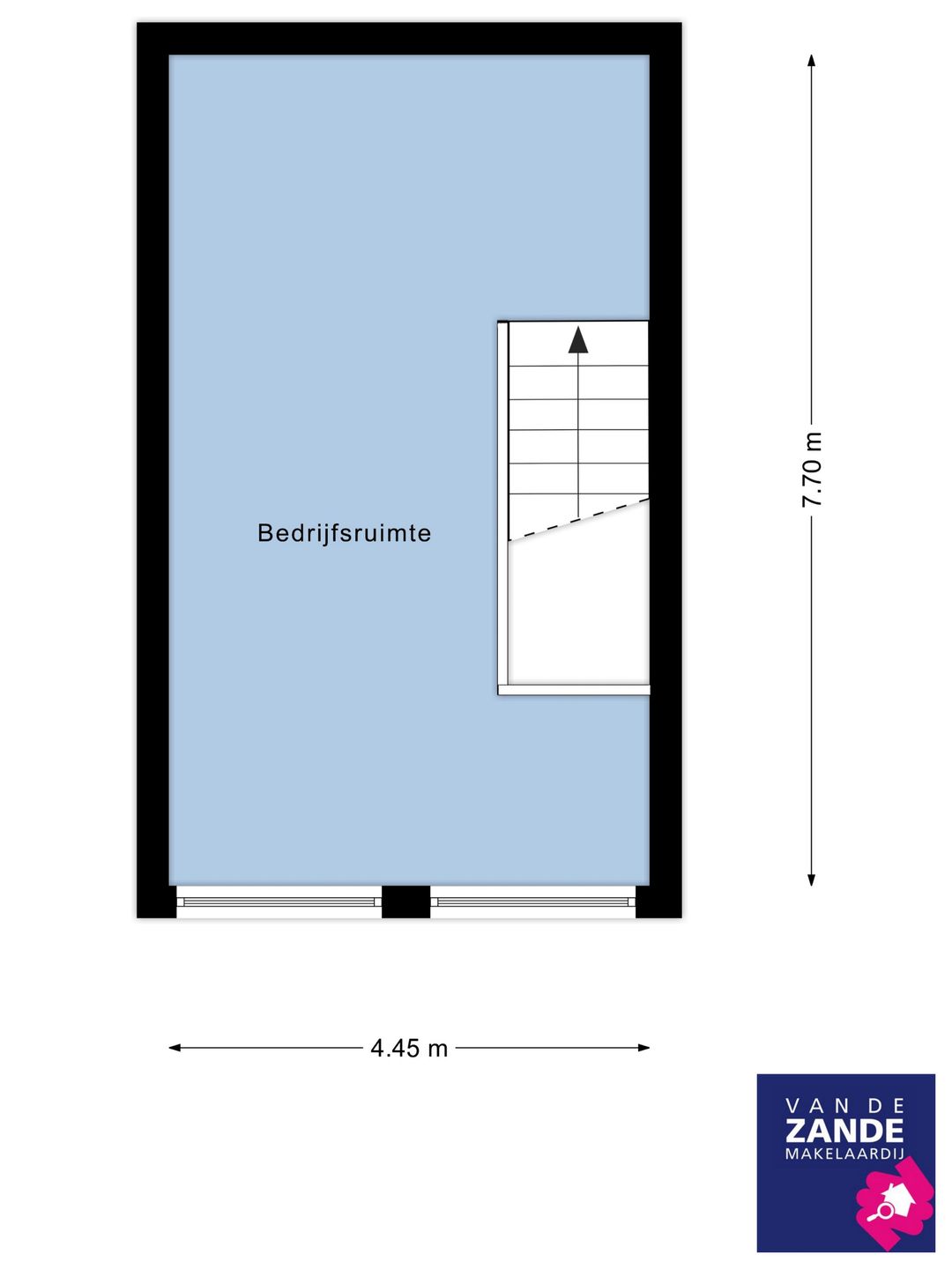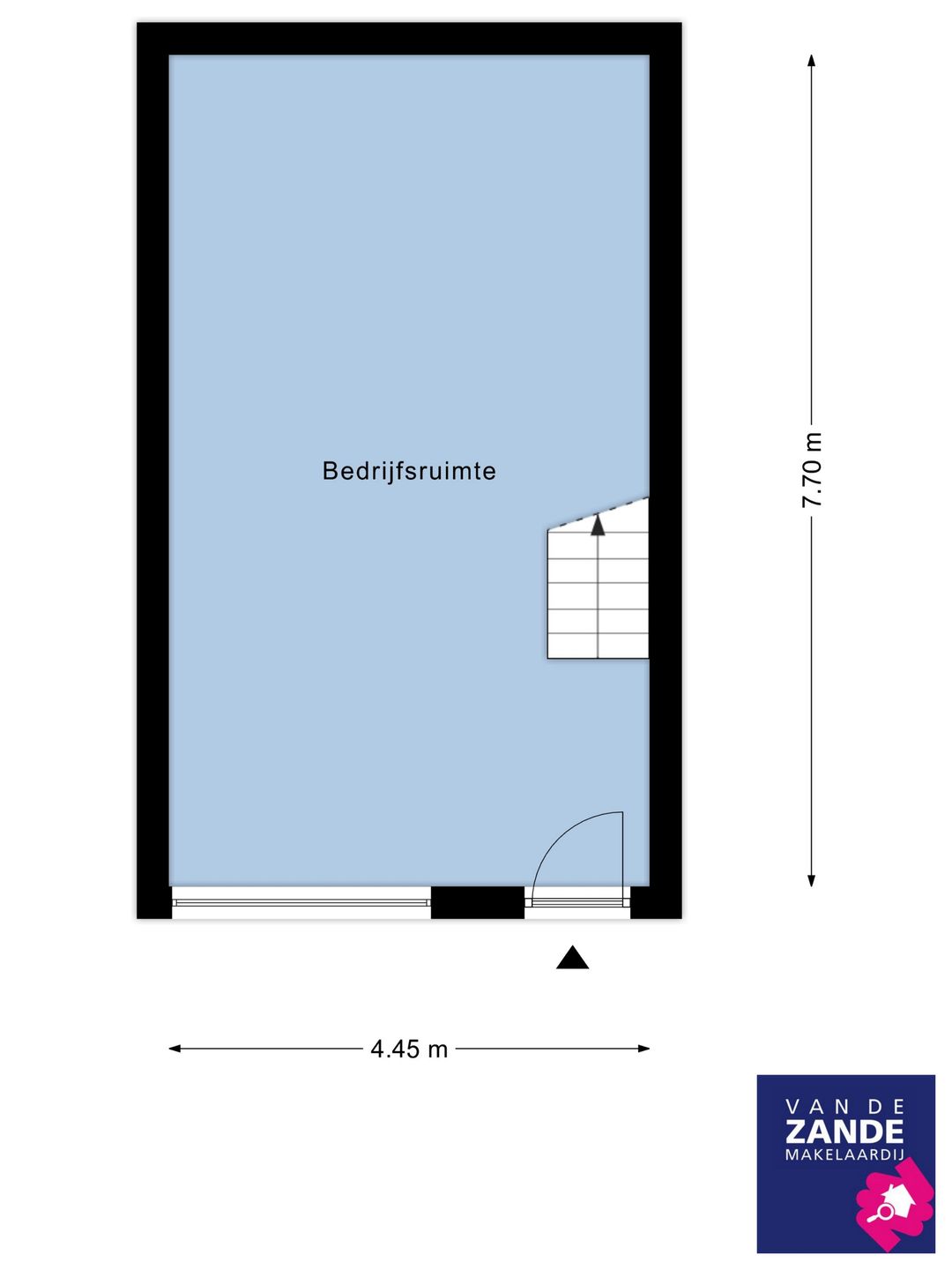 Entree, open bedrijfsruimte, trapopgang naar kantoorverdieping.