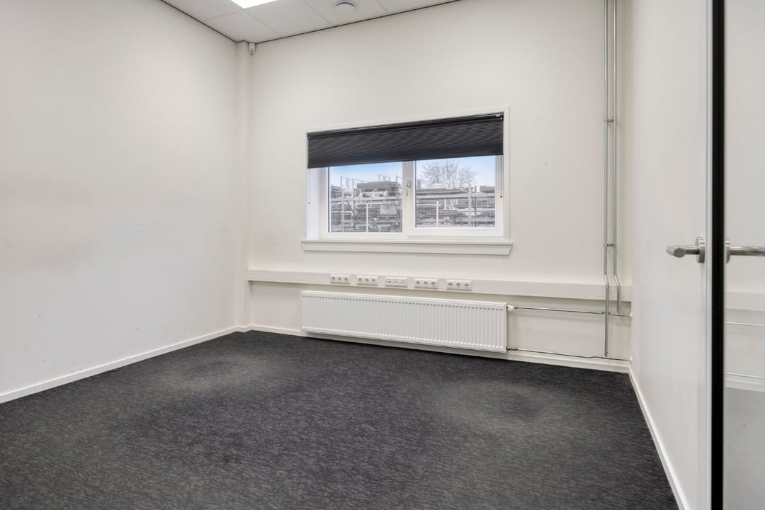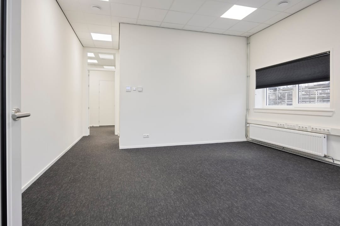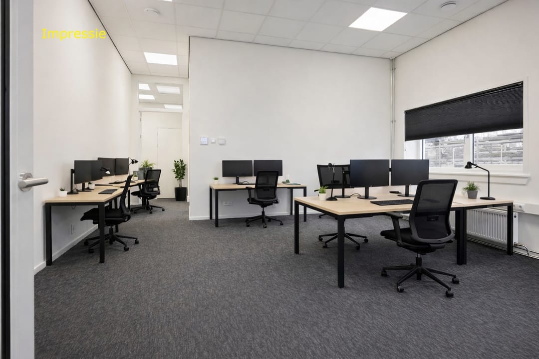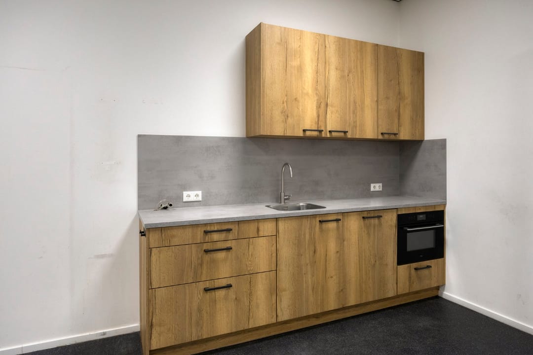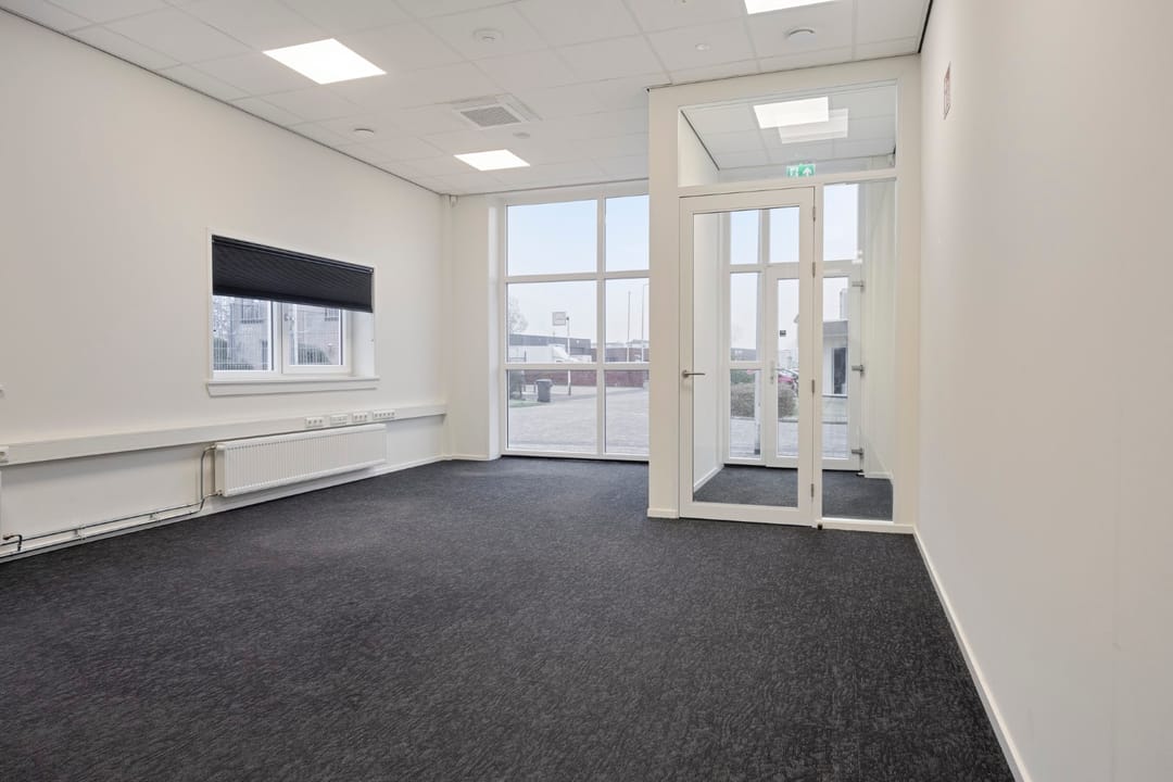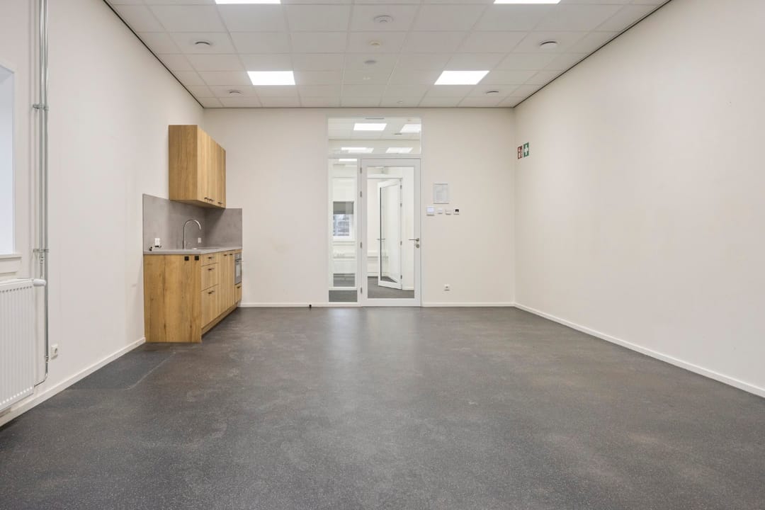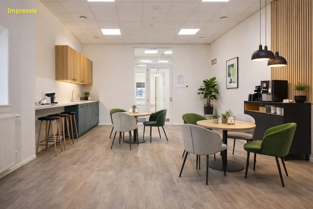 Via de loopdeur stap je binnen in de entree, waar meteen een warme, lichte kantoorsfeer je tegemoet komt. Hier vind je een uitnodigende kantoortuin—lekker open, prettig om in te werken—met daarnaast twee aparte kantoren voor wanneer je behoefte hebt aan rust, overleg of focus. In de hal kom je langs het toilet en een bergkast met de CV-opstelling, waarna je doorloopt naar de kantine: een fijne plek met een modern keukenblok waar je team ongetwijfeld heel wat koppen koffie zal wegdrinken. In totaal biedt dit gedeelte 104 m² VVO, slim ingedeeld en verrassend ruimtelijk.