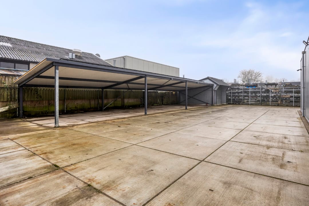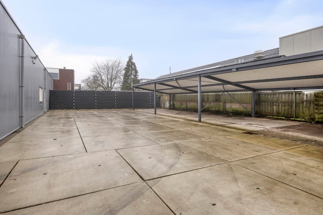 Buiten gaat het feestje gewoon verder. Het terrein van ca. 420 m² is volledig afsluitbaar met een hekwerk, waardoor je met een gerust hart materieel, voertuigen of voorraad buiten kunt laten. Je vindt hier een ruime overkapping van ca. 115 m²—perfect voor beschutte opslag of werkplekken—een aparte garage van 28 m², én een nette fietsenstalling/overkapping van 7 m². Het geheel straalt orde en professionaliteit uit, precies zoals je dat als ondernemer wilt.
