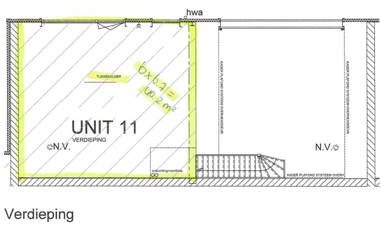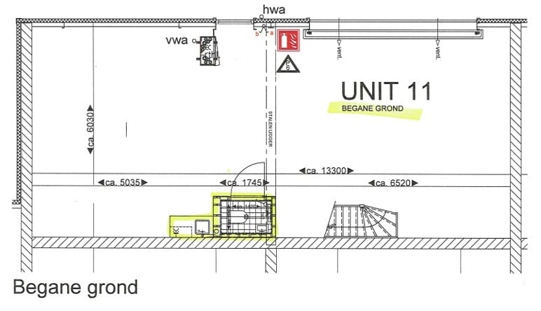 Deze multifunctionele bedrijfsunit heeft een oppervlakte van ca. 119 m2, waarvan ca. 79 m2 begane grond (maximale vloerbelasting 1.000 kg/m2) en ca. 40 m2 op de 1e verdieping (maximale vloerbelasting 360 kg/m2) en maakt deel uit van een bedrijfsverzamelgebouw.