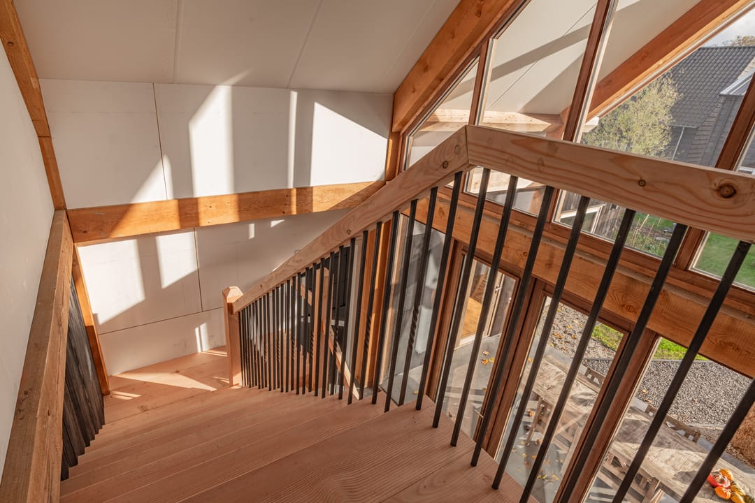 Riante hal met toilet, grote kastenwand en praktische berging/technische ruimte. Keuken die – na realisatie van een nieuwe keuken in de living – uitstekend dienst kan doen als bijkeuken. Enorme living met imposante trapopgang, zeer grote trapkast en een aparte werkkamer. Aan de voorzijde een schitterende glazen pui met panoramisch uitzicht over de landerijen: het voelt alsof u midden in het groen zit. Aan de achterzijde een indrukwekkende pui tot aan de nok, die vloeiend overgaat in een prachtige veranda. Een heerlijke plek om tot rust te komen.
