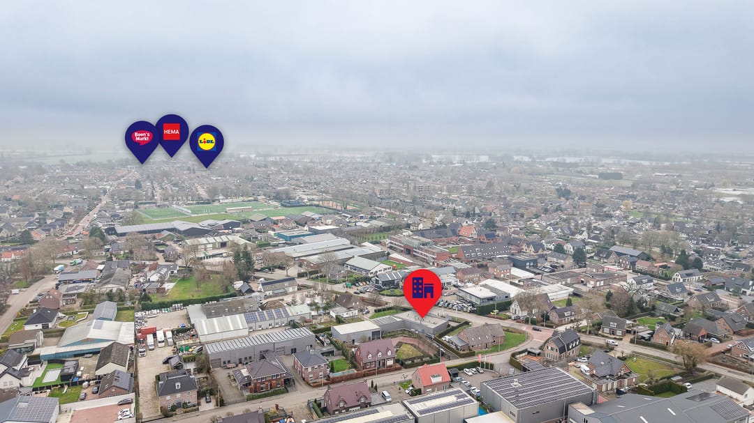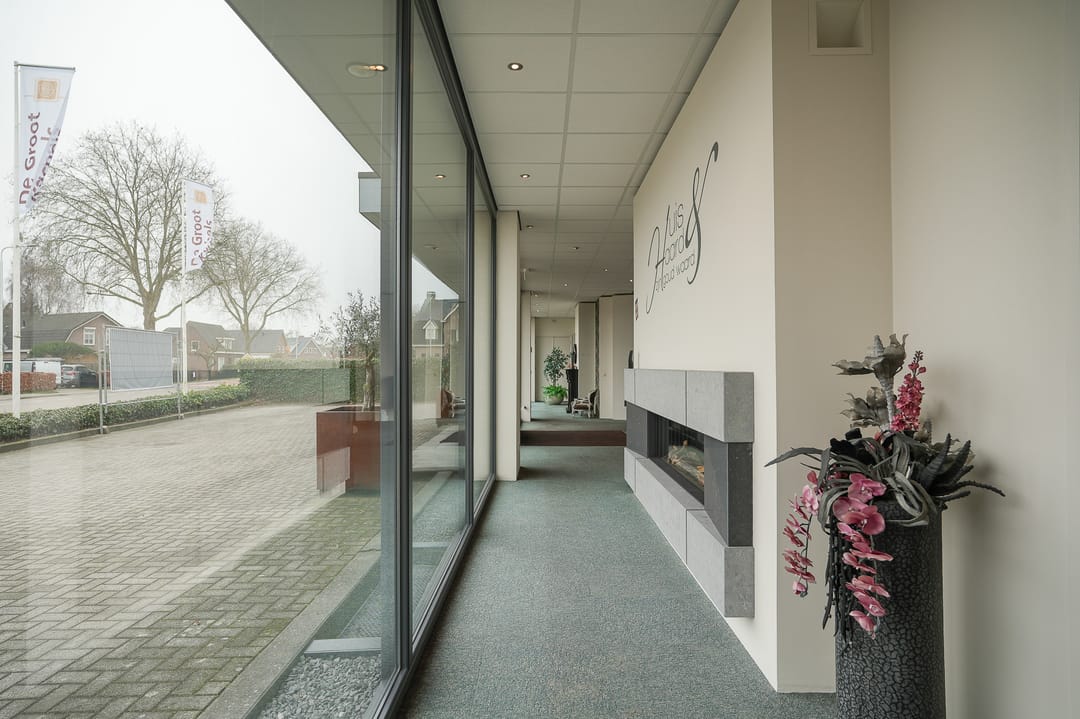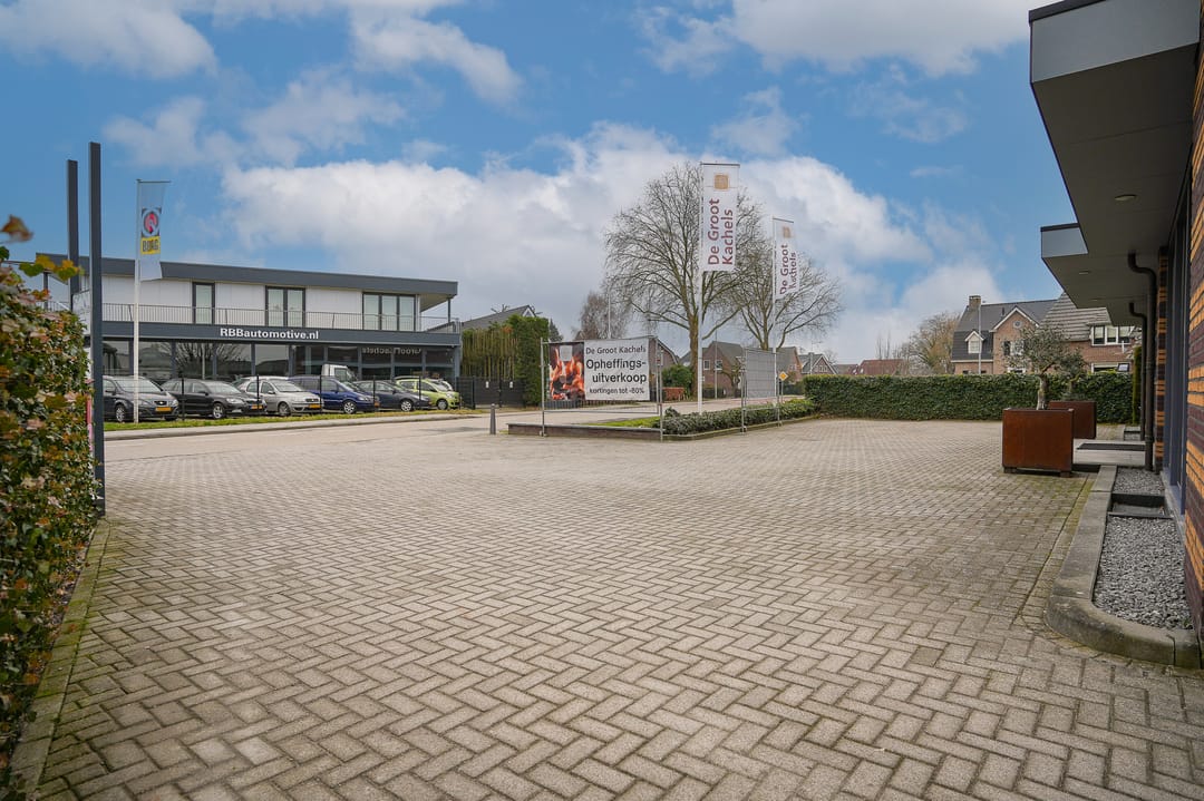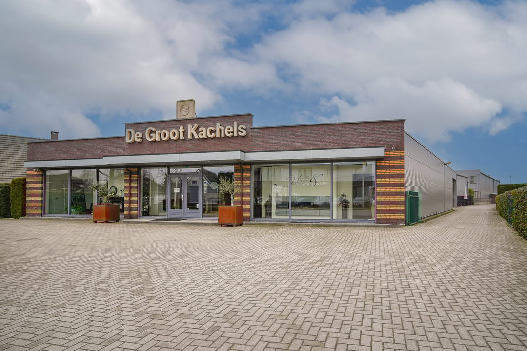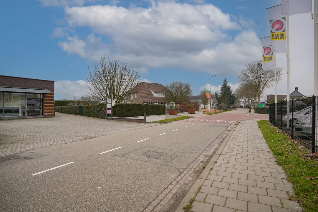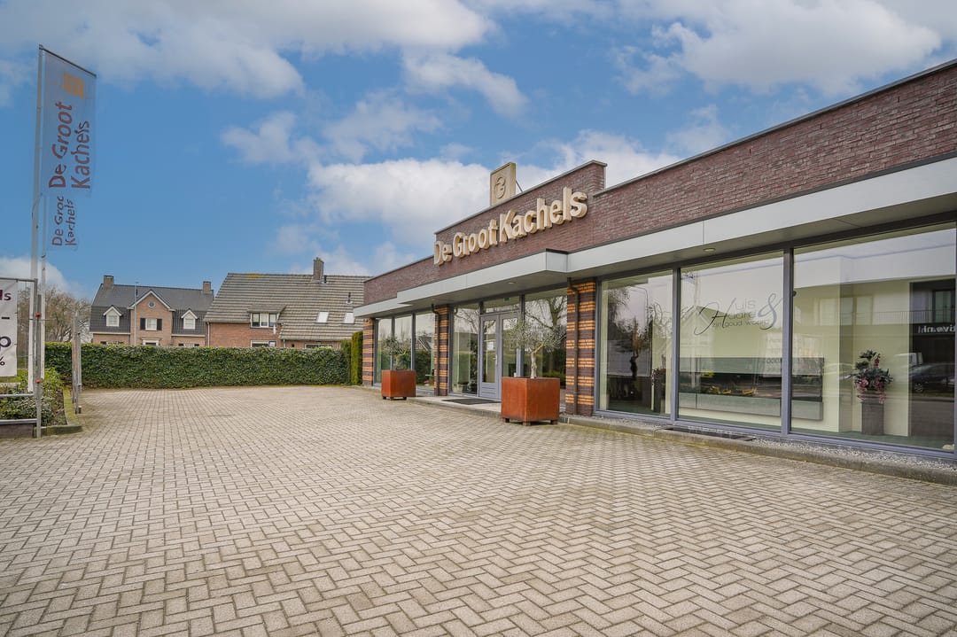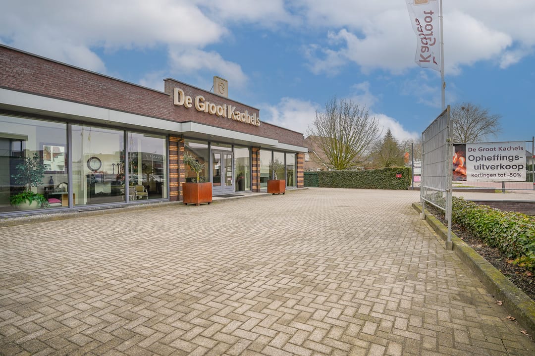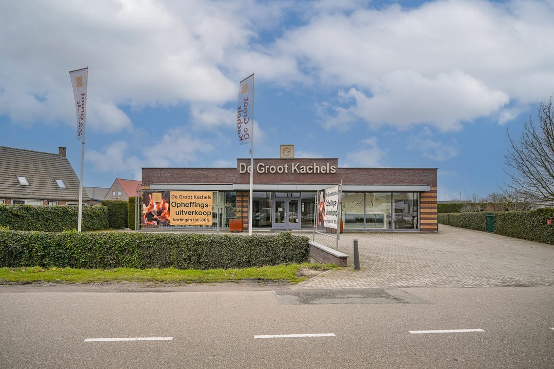 Het pand is iets terug gelegen ten opzichte van de weg, wat zorgt voor een representatieve en verzorgde uitstraling met behoud van maximale zichtbaarheid. De brede, markante gevel en prominente ligging zorgen ervoor dat het object direct opvalt bij passerend verkeer.