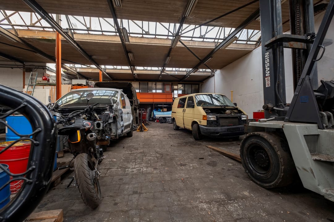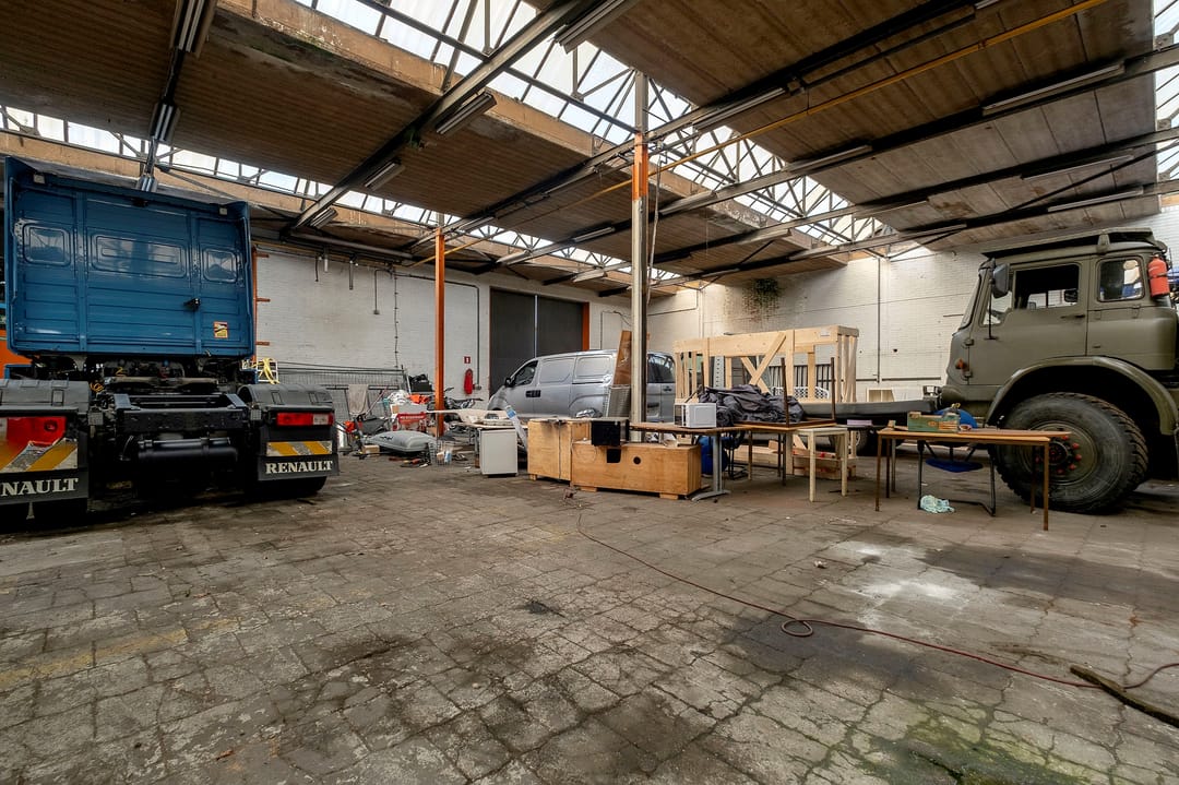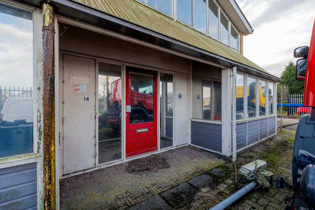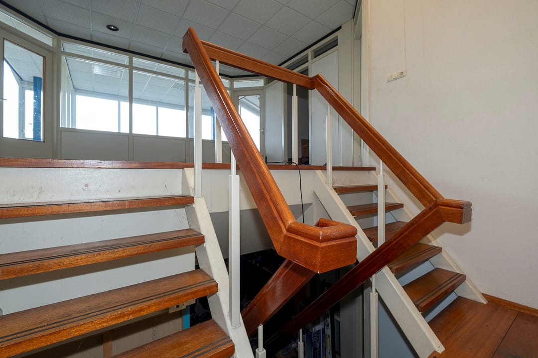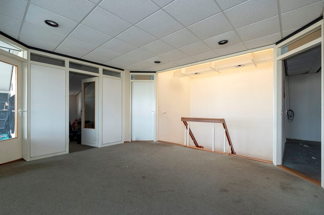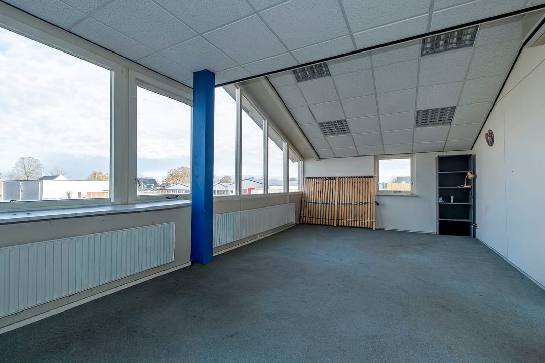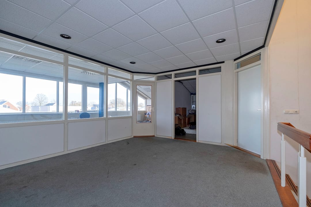 De bedrijfsruimte bij de entree is voorzien van een kantoorruimte met wc's douches en een pantry op de begane grond en kantoorruimte op de verdieping met aansluitend een achtergelegen bedrijfsruimte (ca. 616 m²) De naastgelegen bedrijfsruimte/magazijn bestaat uit twee delen met in het linker deel een kantine en douche ruimten (totaal ca.1450 m²) en een daar achter gelegen bedrijfsruimte (ca. 108 m²).