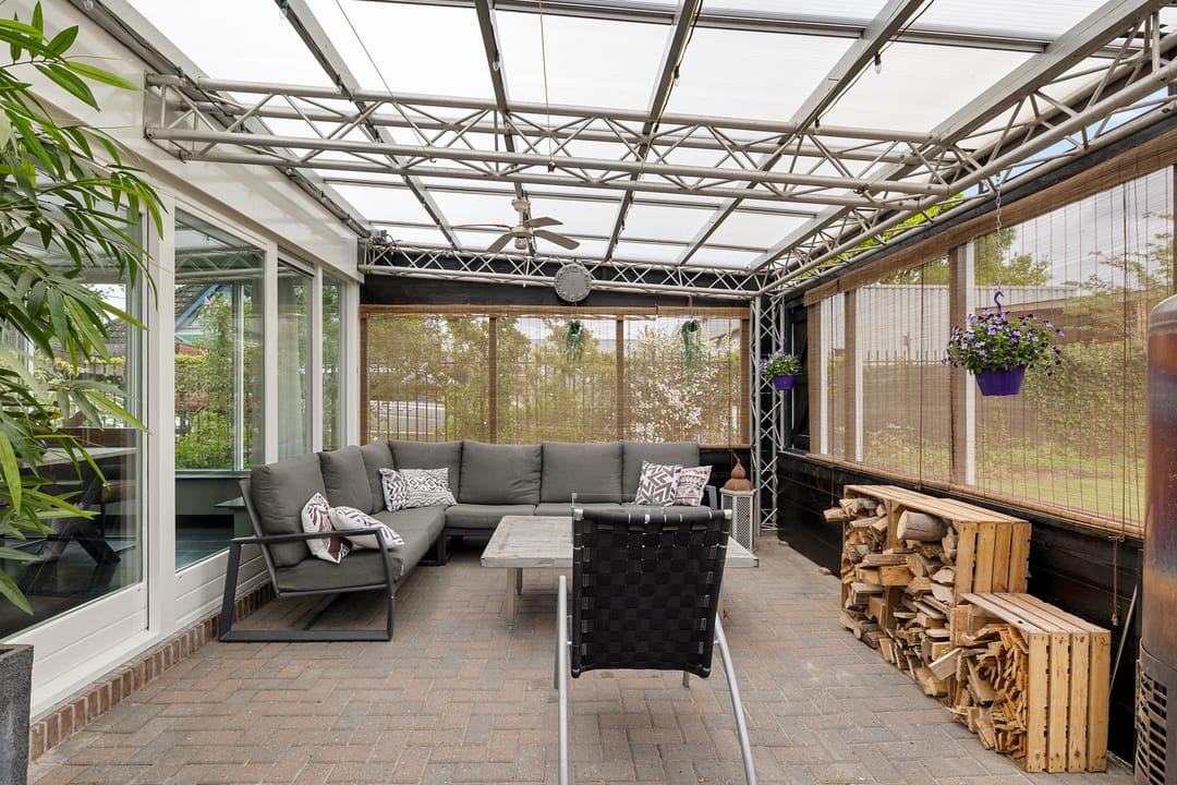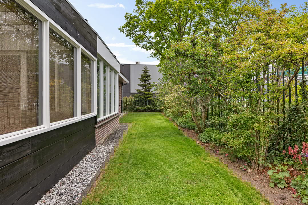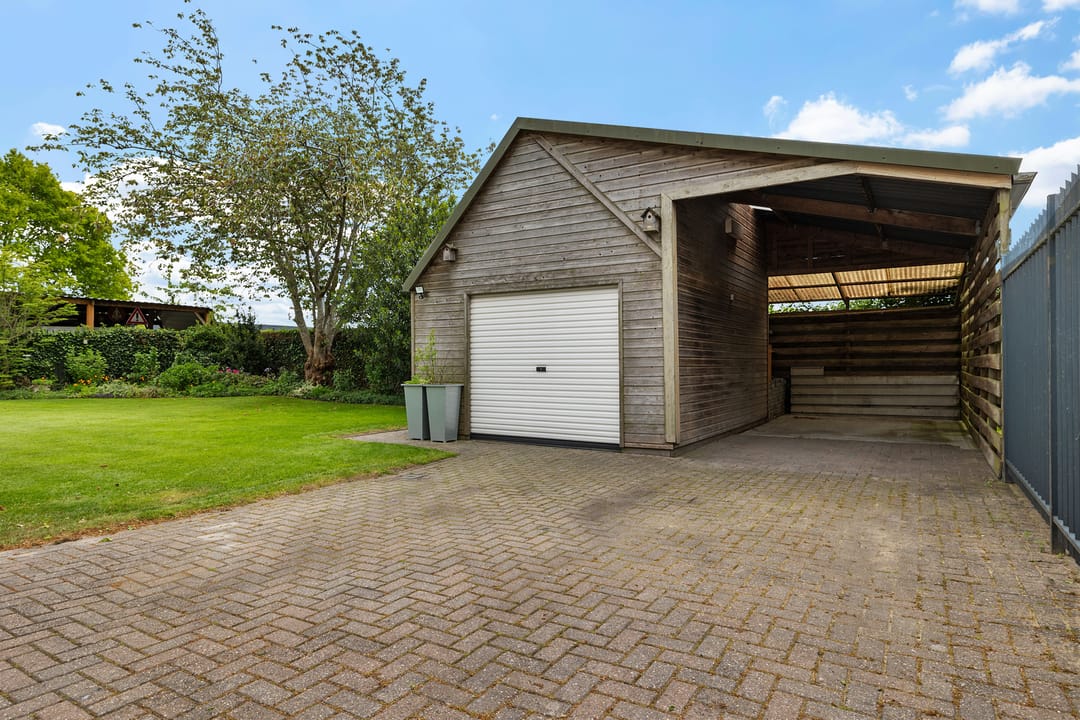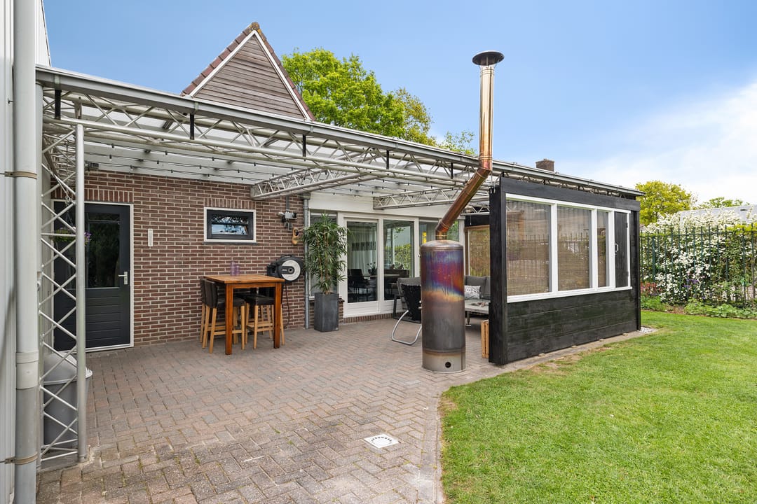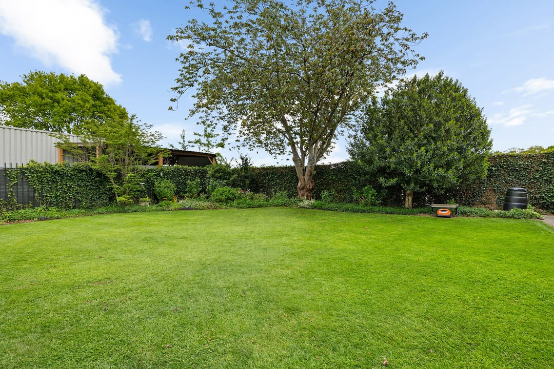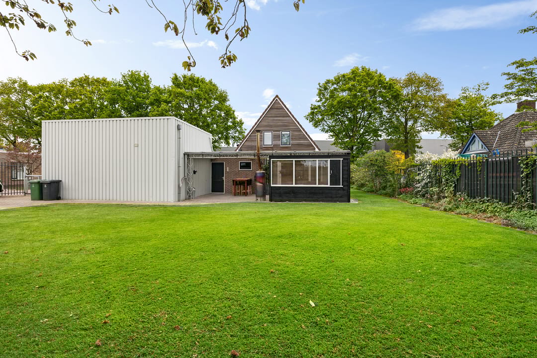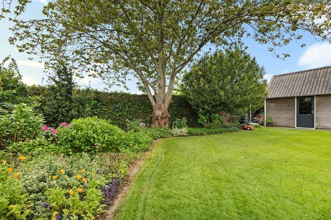 In de tuin bevindt zich nog een ruime houten schuur/garage met overheaddeur en een overkapping.