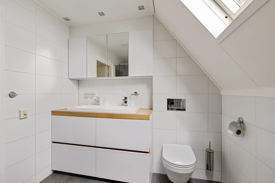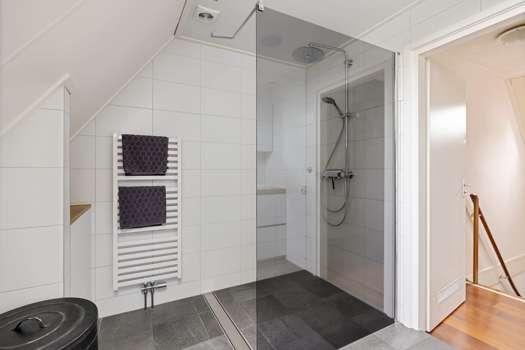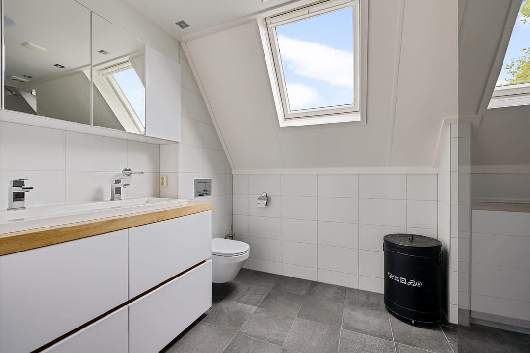 overloop, 3 slaapkamers (9m², 10m² en 15m²), badkamer voorzien van toilet, inloopdouche en dubbele wastafel.