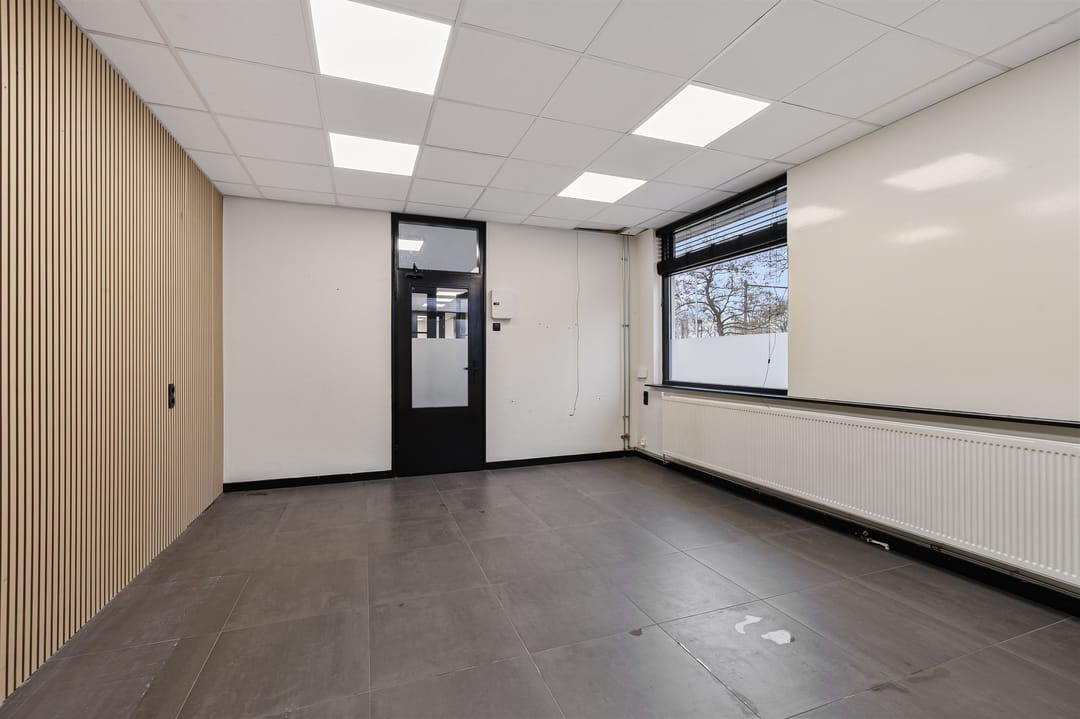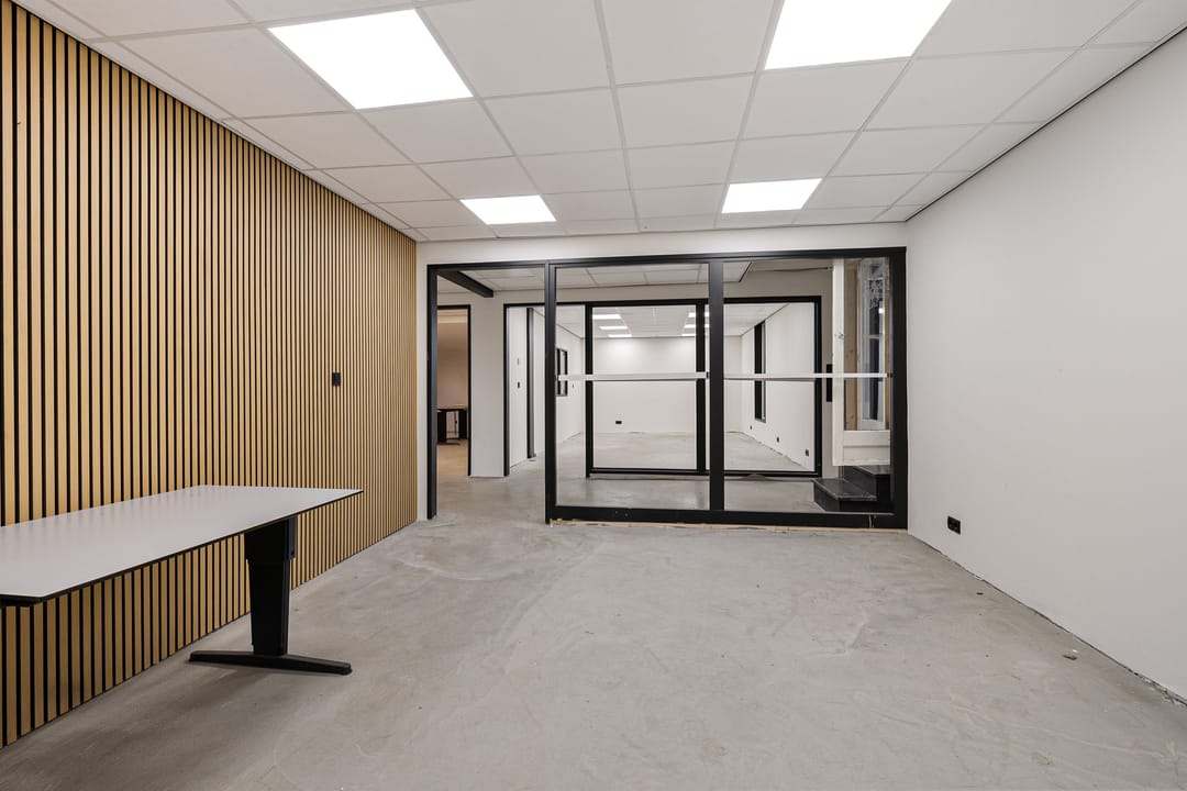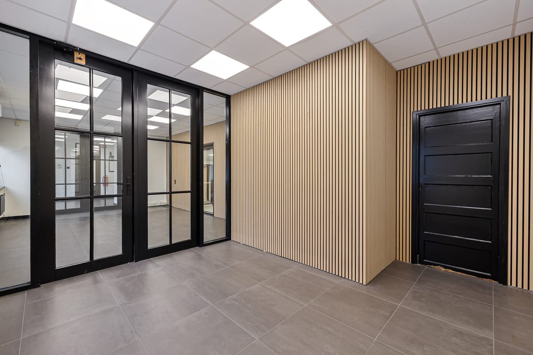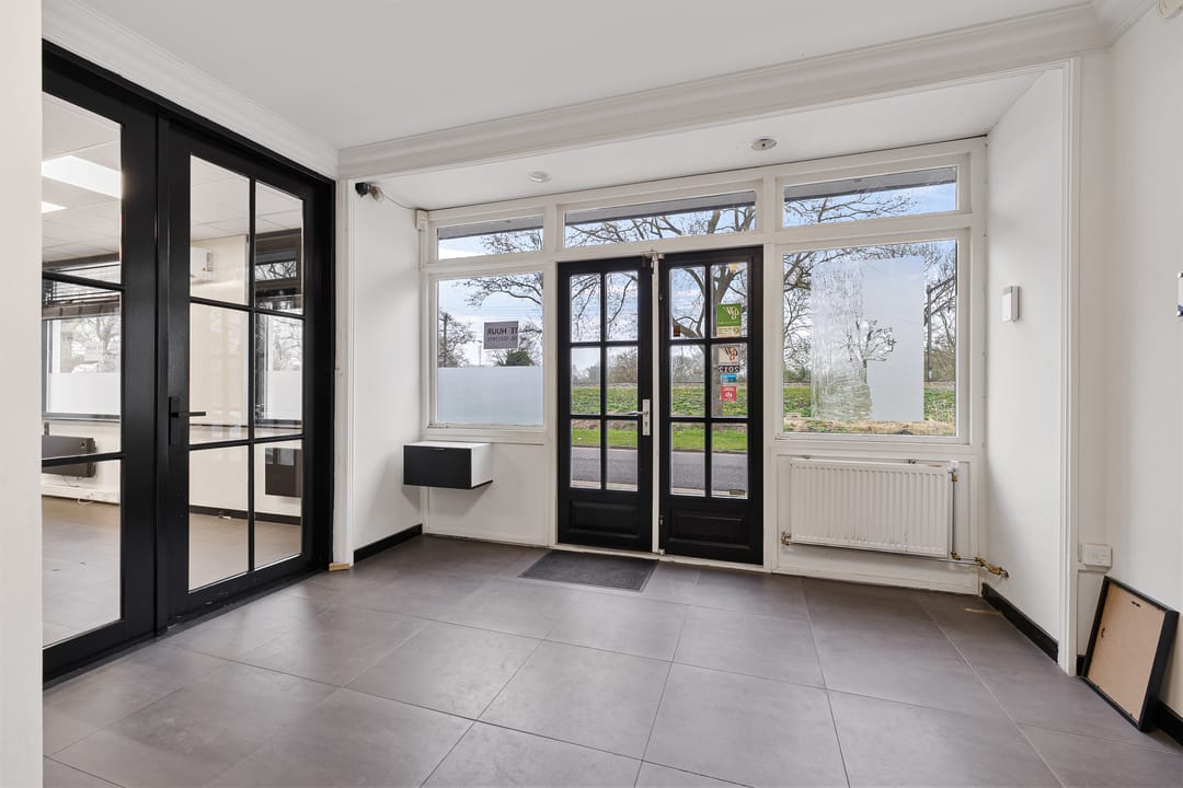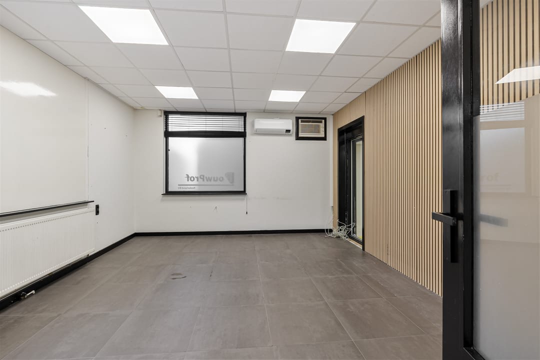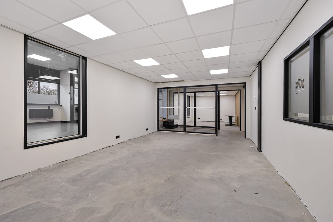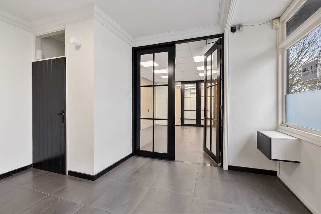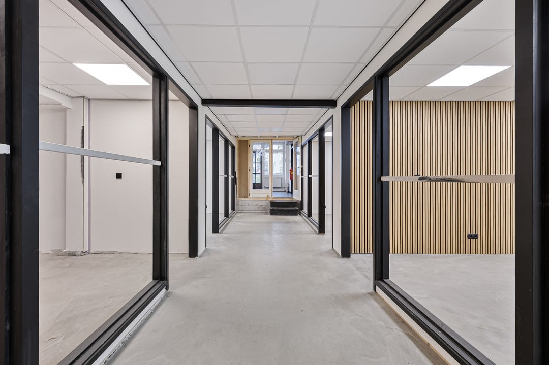 Aan de voorzijde bevinden zich meerdere kantoorruimten, uitgevoerd met systeemplafonds, LED-verlichting en glazen scheidingswanden. Enkele kantoren moeten nog wel afgemaakt worden met toevoeging van glas en vloeren. De representatieve entree en nette afwerking maken deze ruimte direct geschikt voor kantoor- of baliefunctie. Tevens zijn sanitaire voorzieningen en een pantry aanwezig.