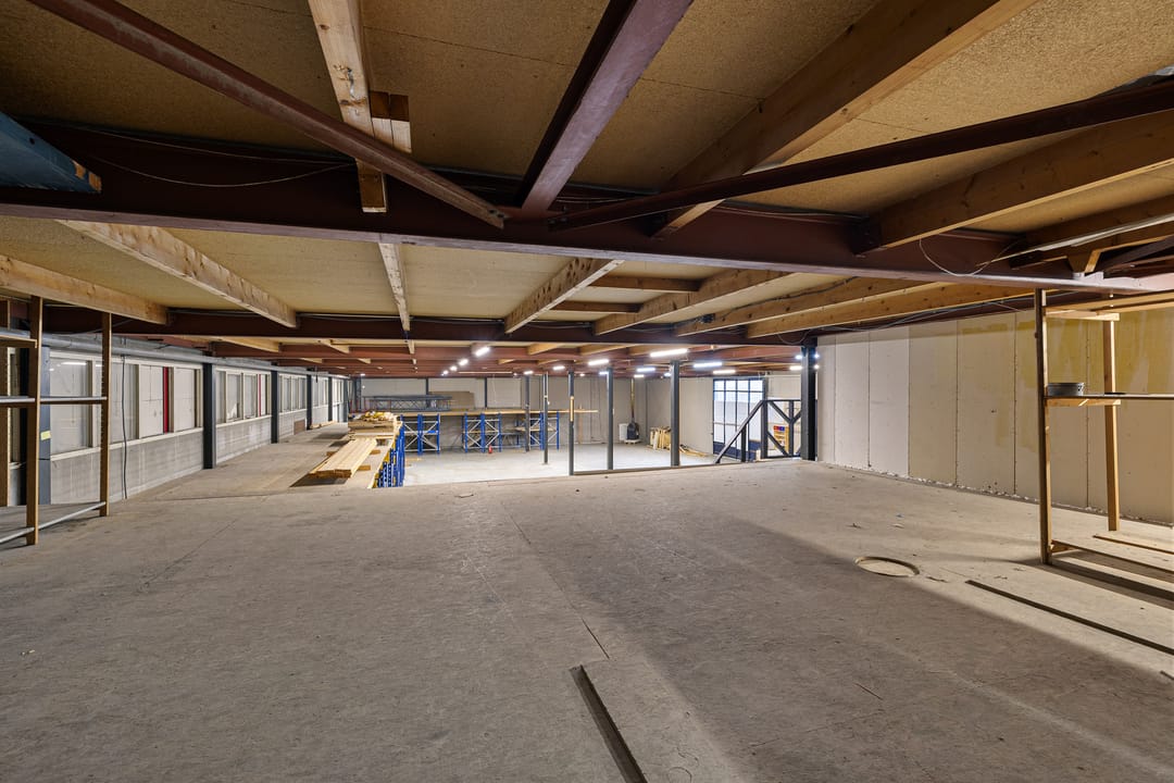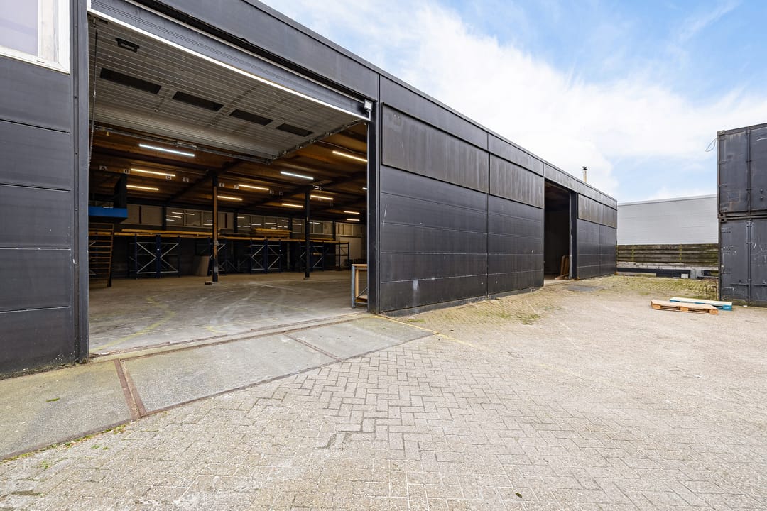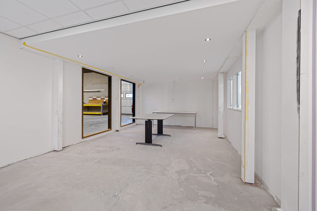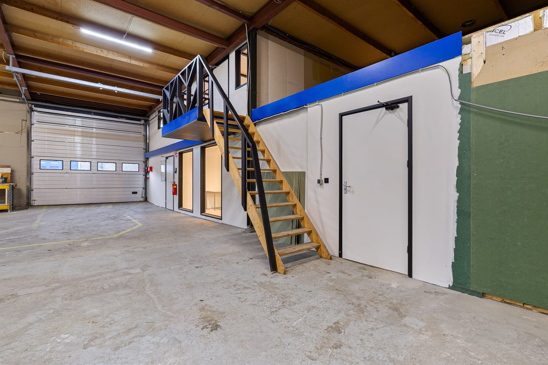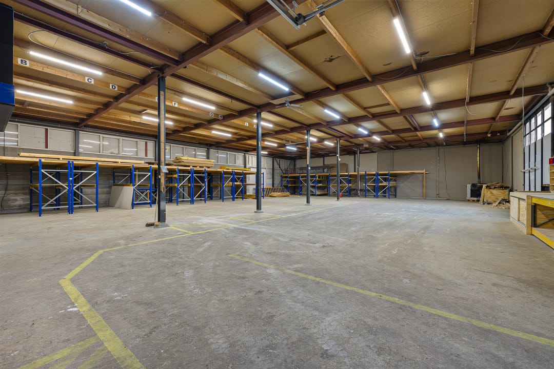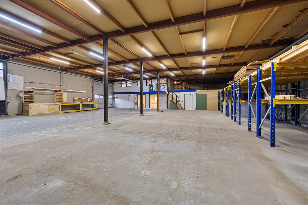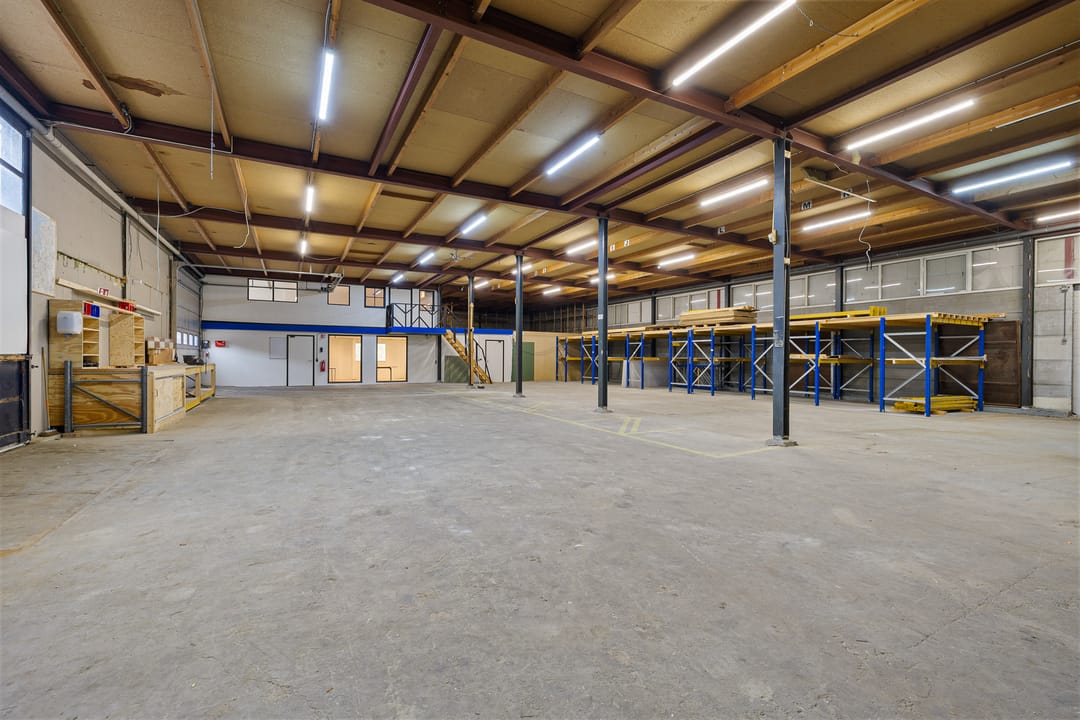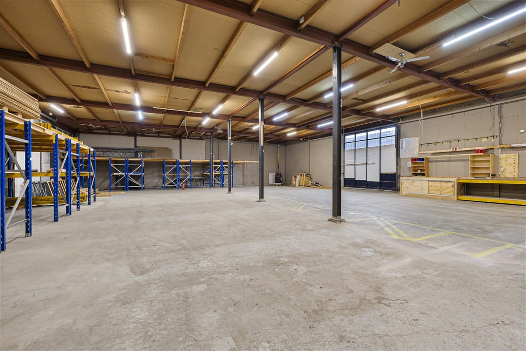 De loods aan de achterzijde betreft een ruime bedrijfsruimte met vrije overspanning, betonvloer en overheaddeur. De vrije hoogte en open structuur maken de ruimte geschikt voor opslag, logistiek en lichte productie.