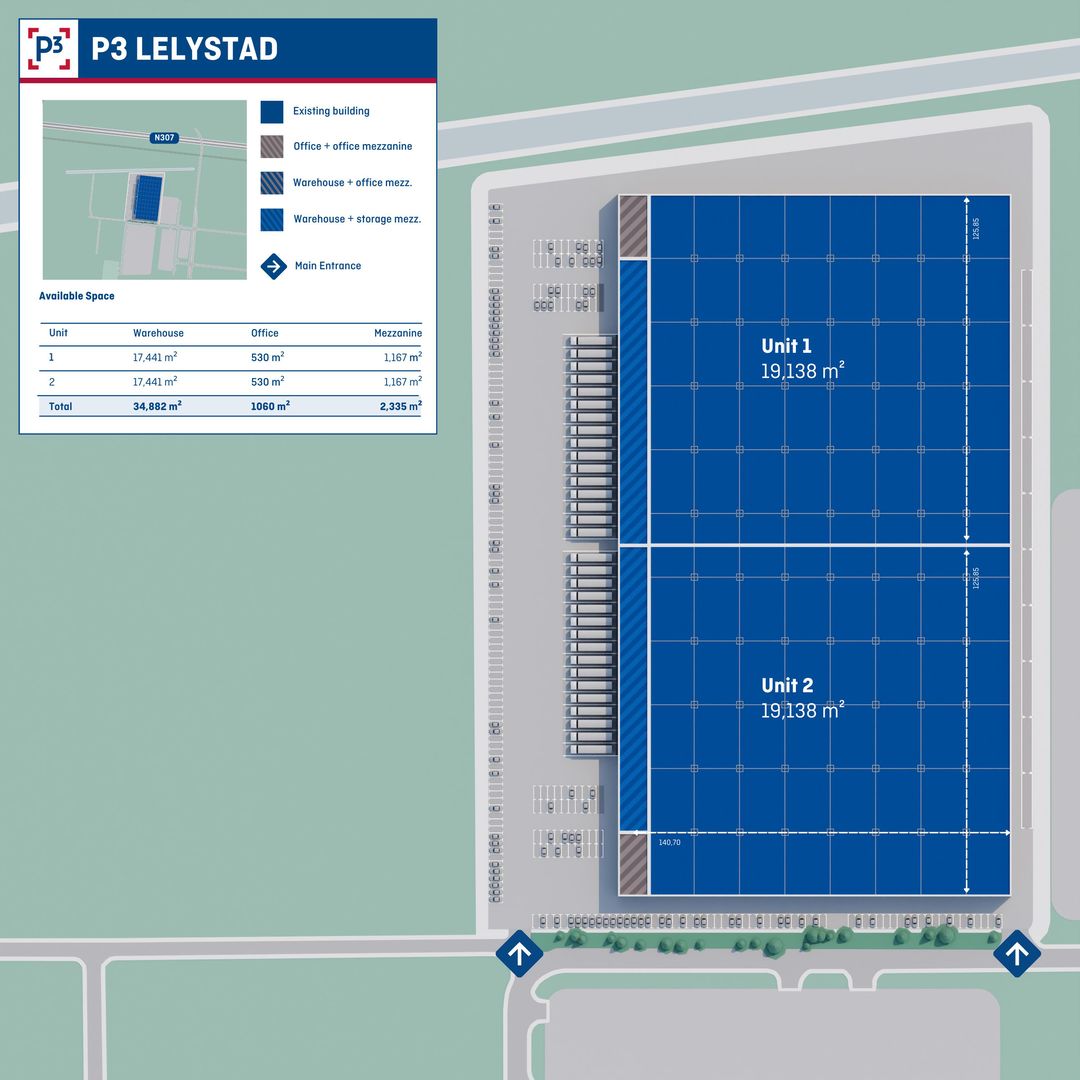 Dit moderne distributiecentrum, gelegen aan de Platinastraat 14 in Lelystad, heeft een totale vloeroppervlakte van circa 19.138 m². Het pand bestaat uit circa 17.441 m² warehouse, circa 1.167 m² mezzanine en circa 530 m² kantoorruimte.