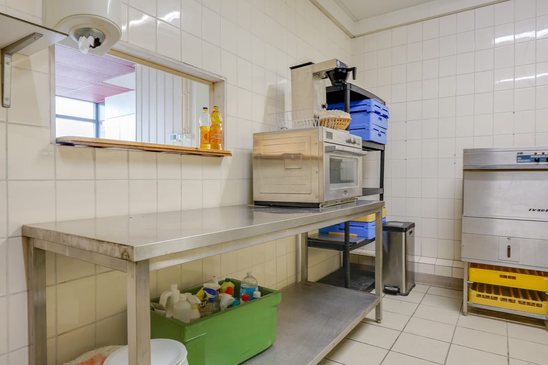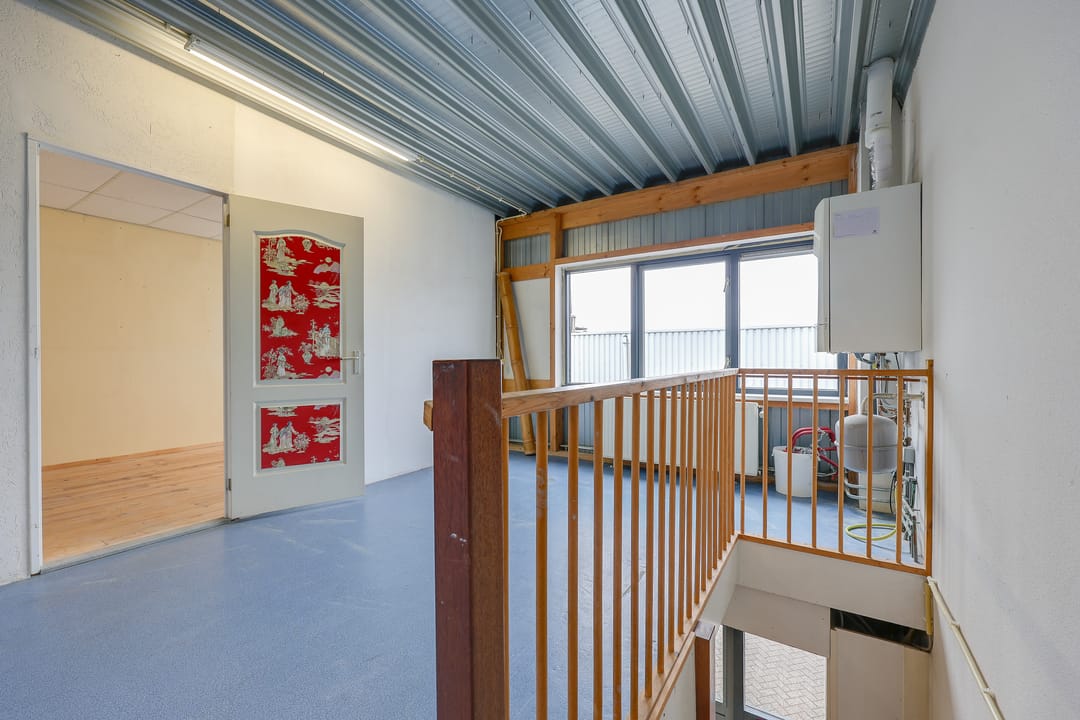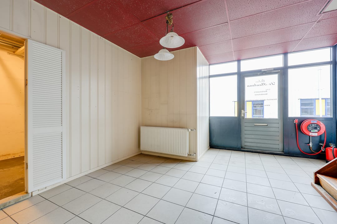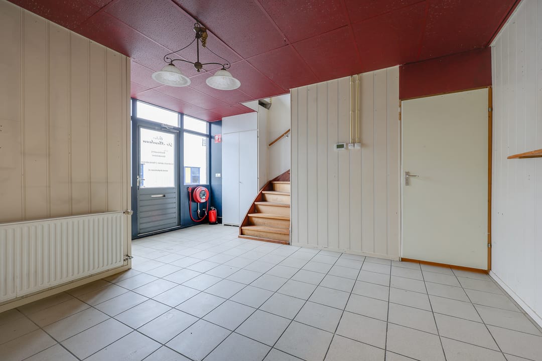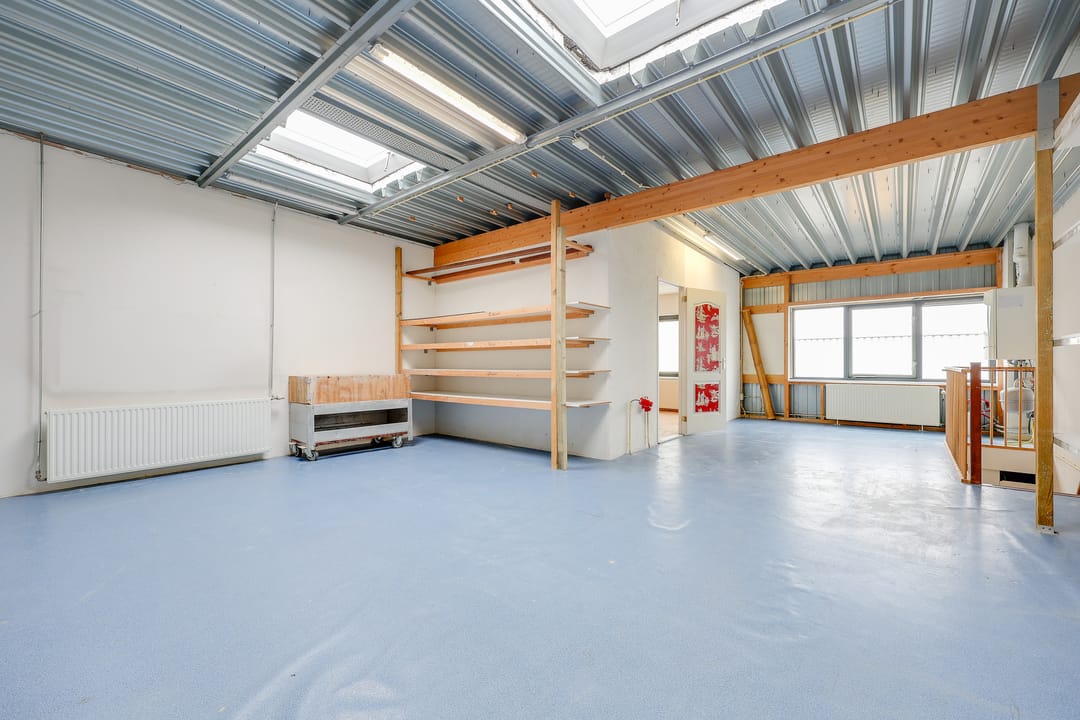 Het totale vloeroppervlak bedraagt circa 129 m² vvo en is verdeeld over de begane grond van 64 m² vvo en de verdieping van 65 m². Op de begane grond bevindt zich aan de voorzijde de entree met ruime hal, toilet en magazijn (ook direct bereikbaar dmv overheaddeur). Vanaf het magazijn heeft men toegang tot een grote voormalige industriële keuken. Via een trap vanuit de hal komt men op de verdieping. Daar bevindt zich een grote ruimte met daglicht en een separate kantoorruimte.