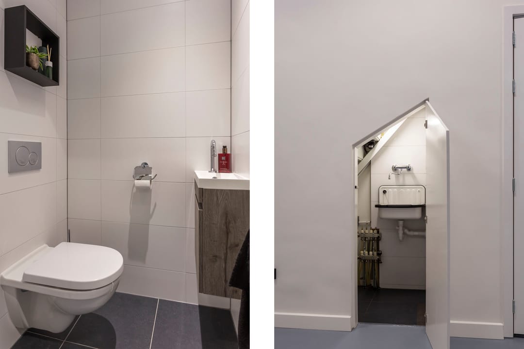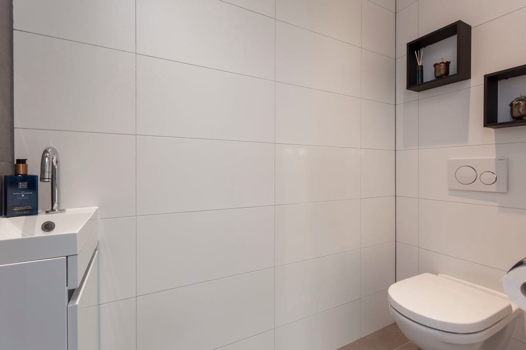 • Toilet op de b.g.g. en de verdieping (hangend toilet met in de ruimte tegels tot aan plafond)