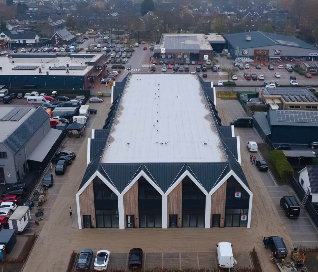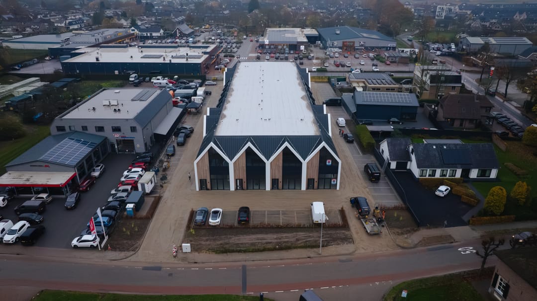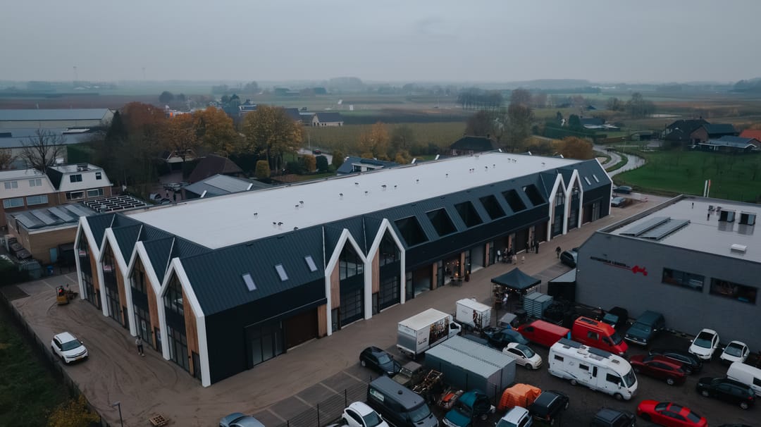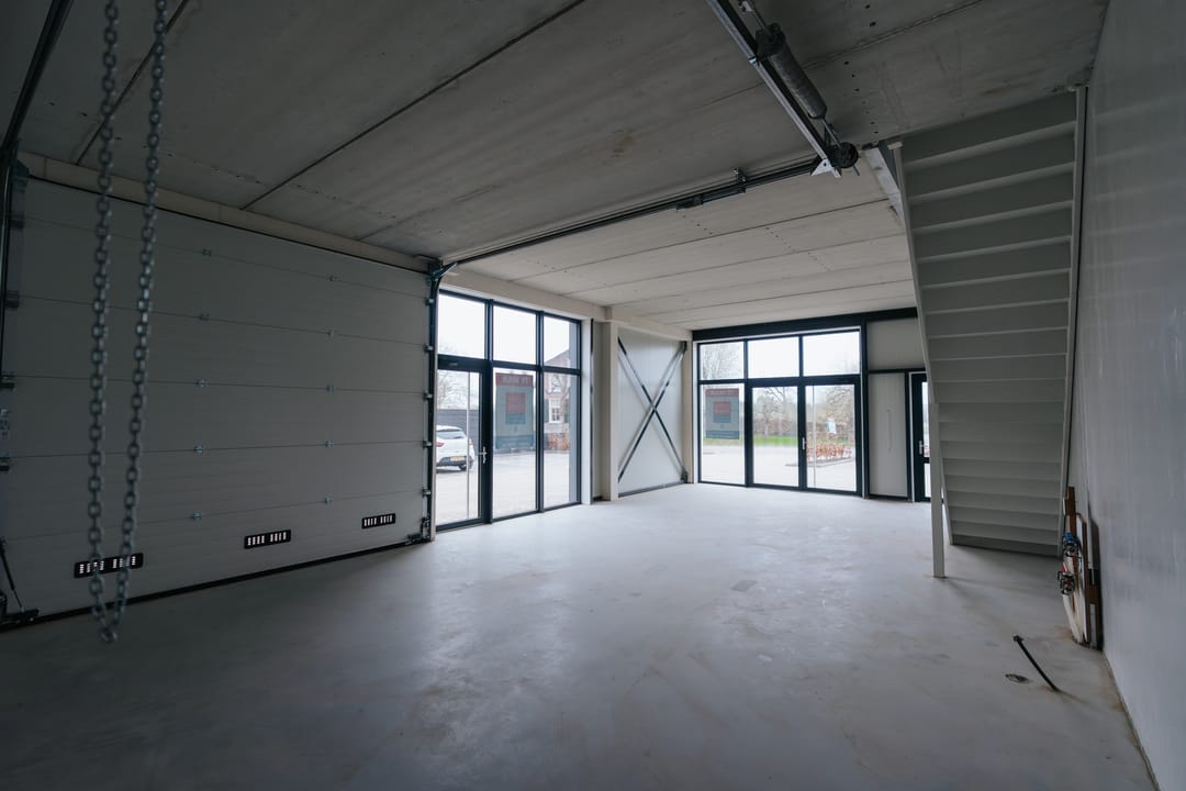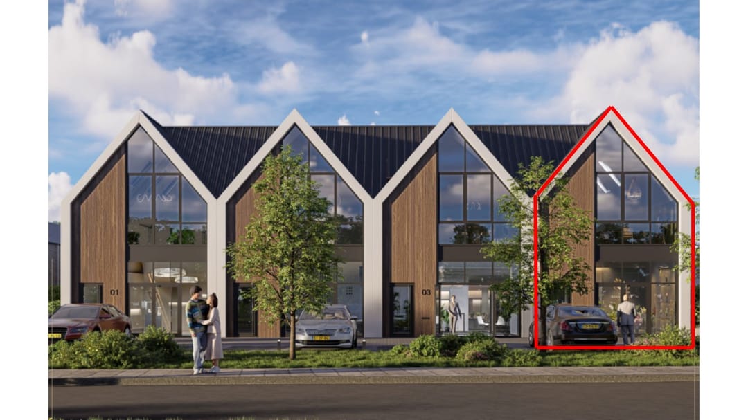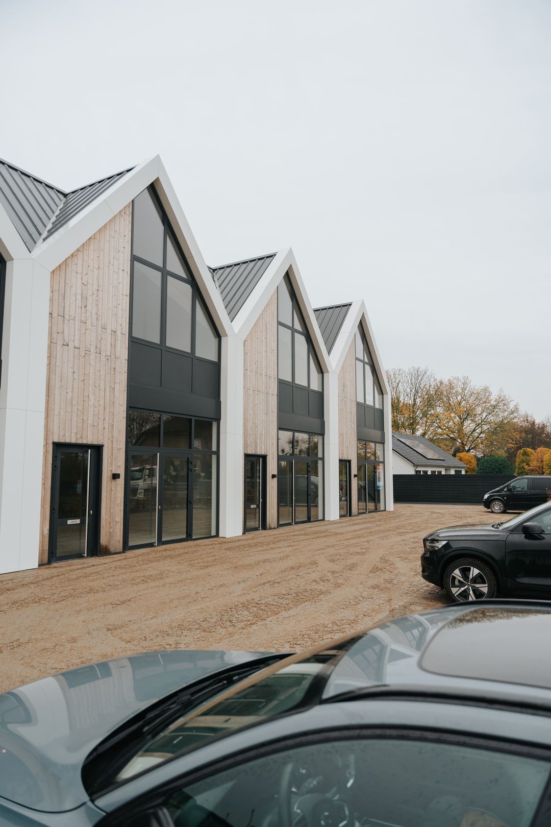 De voorgevel krijgt een professionele uitstraling met raampartijen met deuren ook details van hout, de zijgevel heeft naast een raampartij met loopdeur ook nog een geïsoleerde elektrische sectionaal deur ( niet aangesloten )