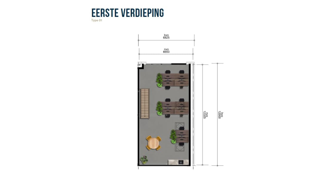 Zowel de unit op de begane grond en op de verdieping zijn ca. 82 m2 groot, de frontbreedte is ca. 6.65 m en de diepte 12.32 m2.