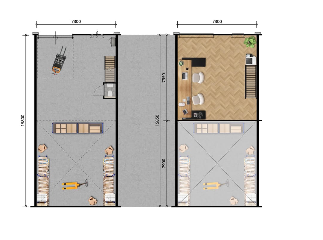 Totaal: ca. 180 m² BVO per bedrijfsruimte.