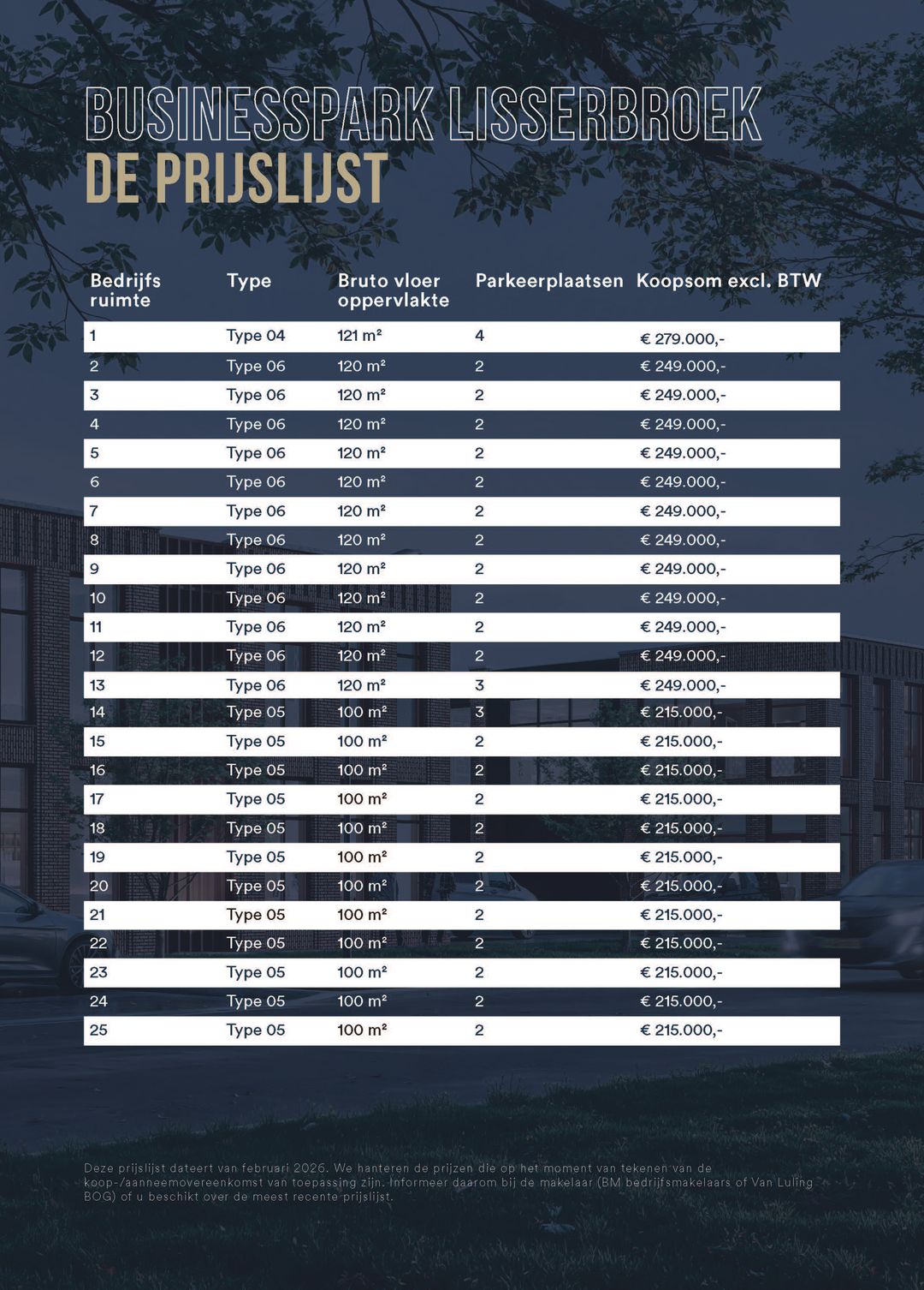 Businesspark Lisserbroek bestaat uit 35 bedrijfsruimtes, met variërende vloeroppervlakten van circa 100 m² tot 336 m² B.V.O., alle voorzien van een praktische verdiepingsvloer. Ideaal om zelf in te delen – de mogelijkheden zijn eindeloos. Rondom het gebouw is er voldoende parkeergelegenheid. Elke bedrijfsruimte beschikt over twee tot vijf eigen parkeerplaatsen.