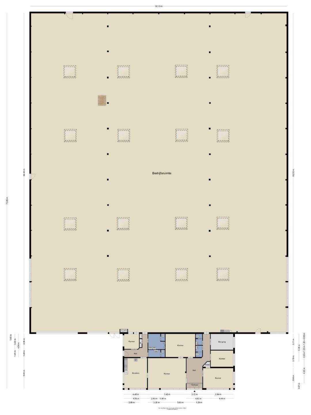 Het pand beschikt over drie overspanningen van 15-20-15 meter, met een vrije hoogte van circa 8 meter.